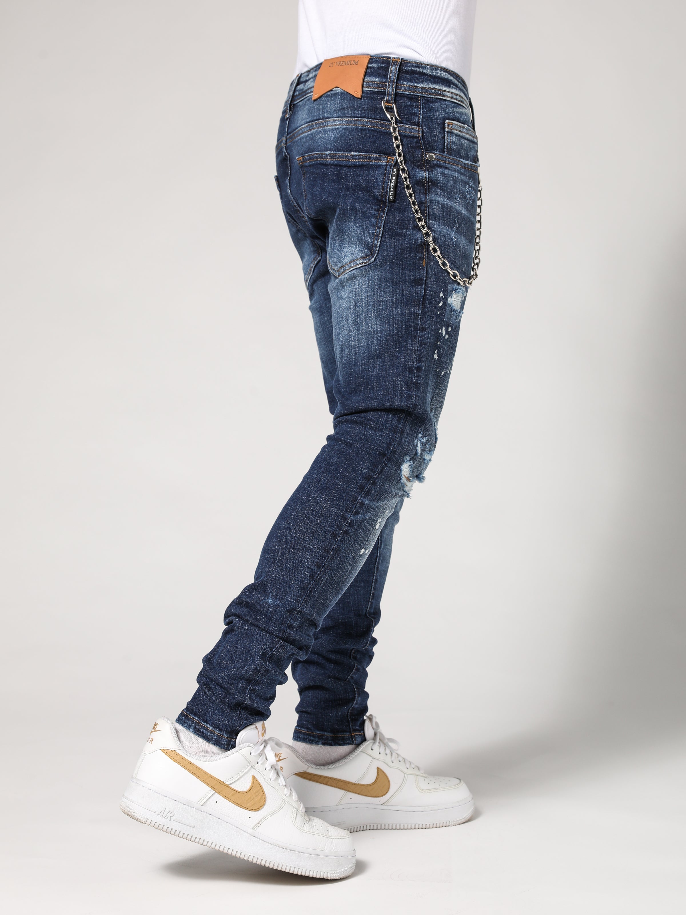 Azure Denim Jeans are made from high-quality stretchy denim fabric. It is stonewashed and randomly distressed on the front. It is skinny, and Denim's cut a little longer to give the denim a lousy look through leg openings. Besides, It comes with a chain on the side