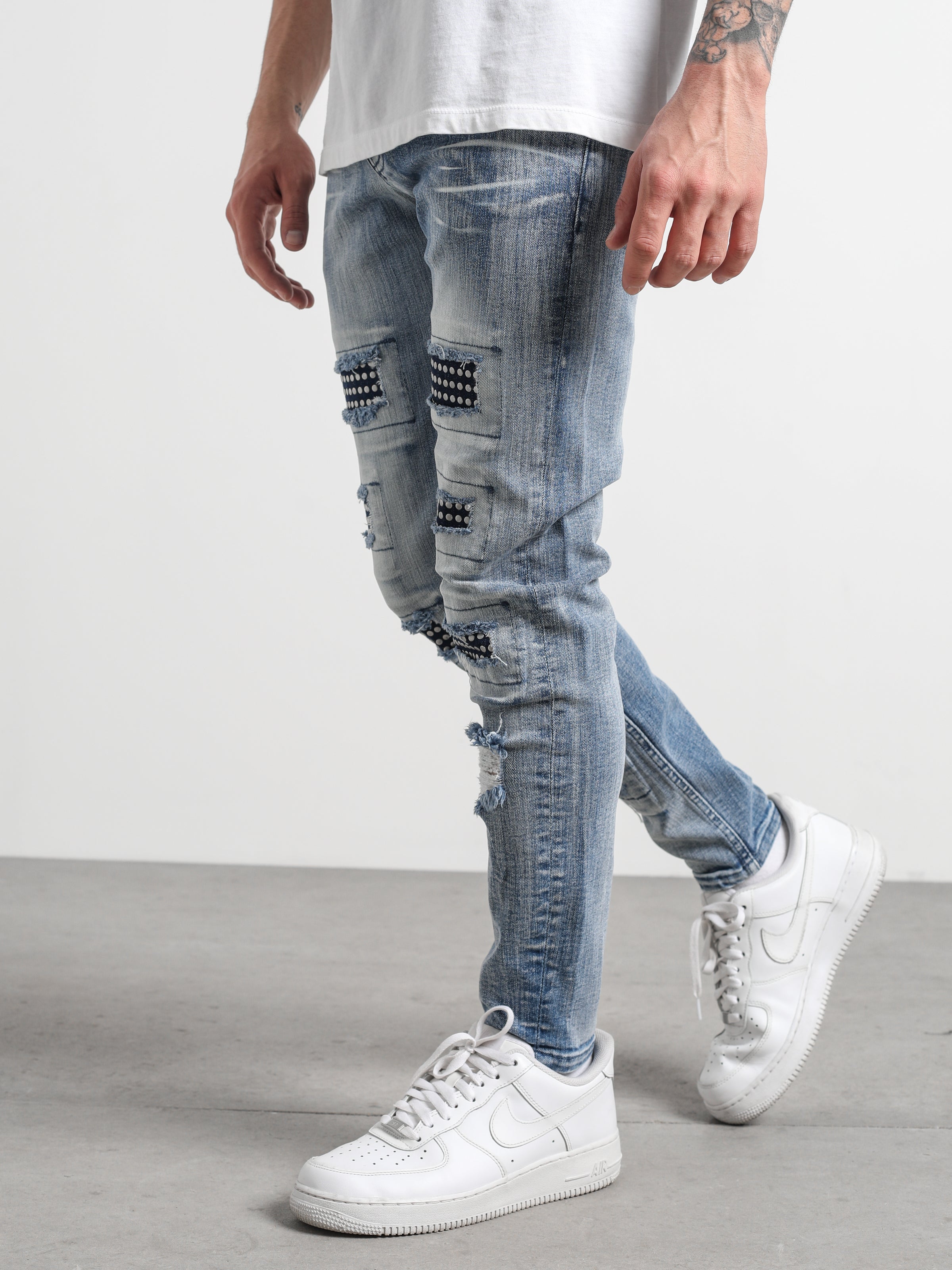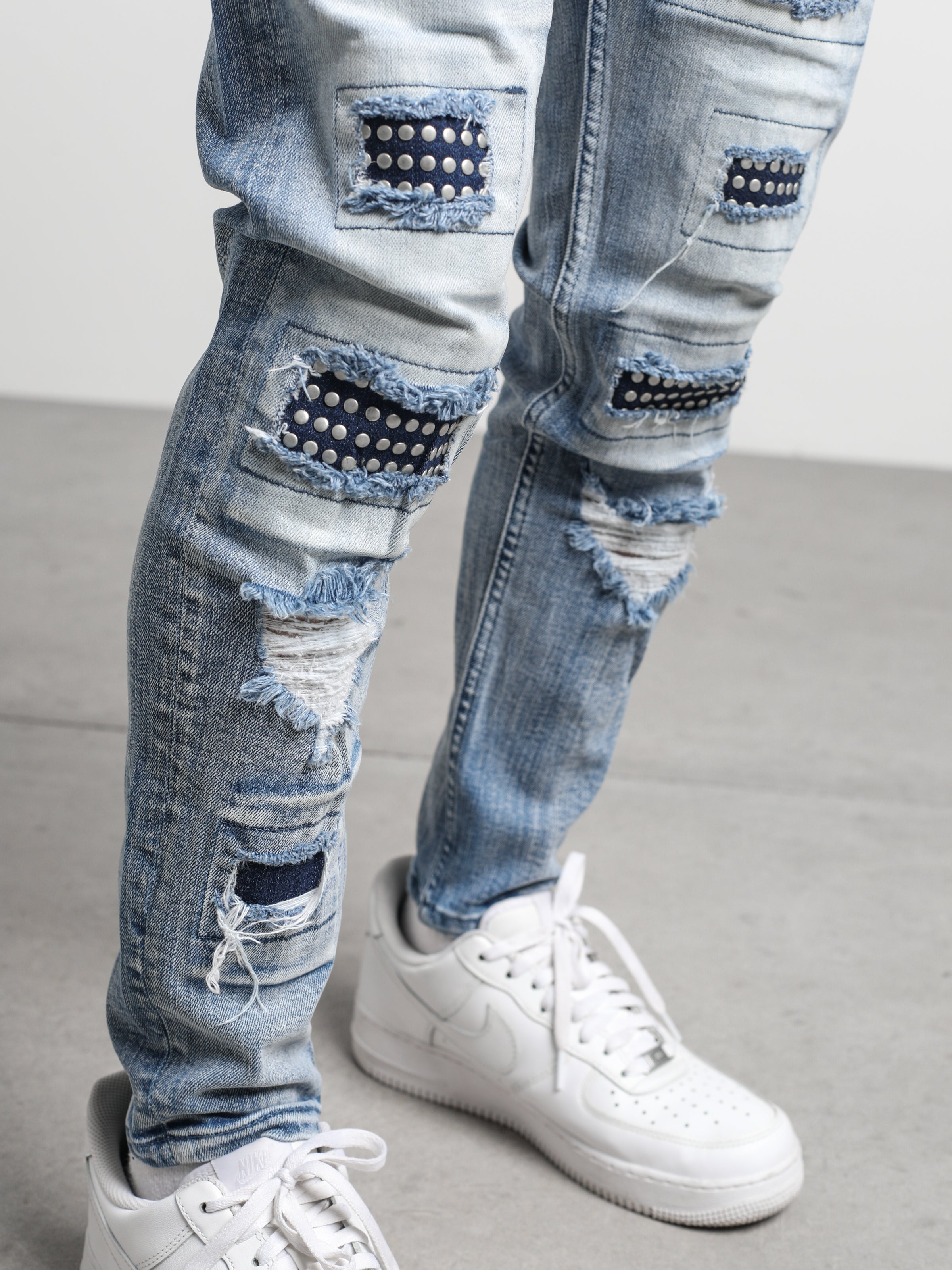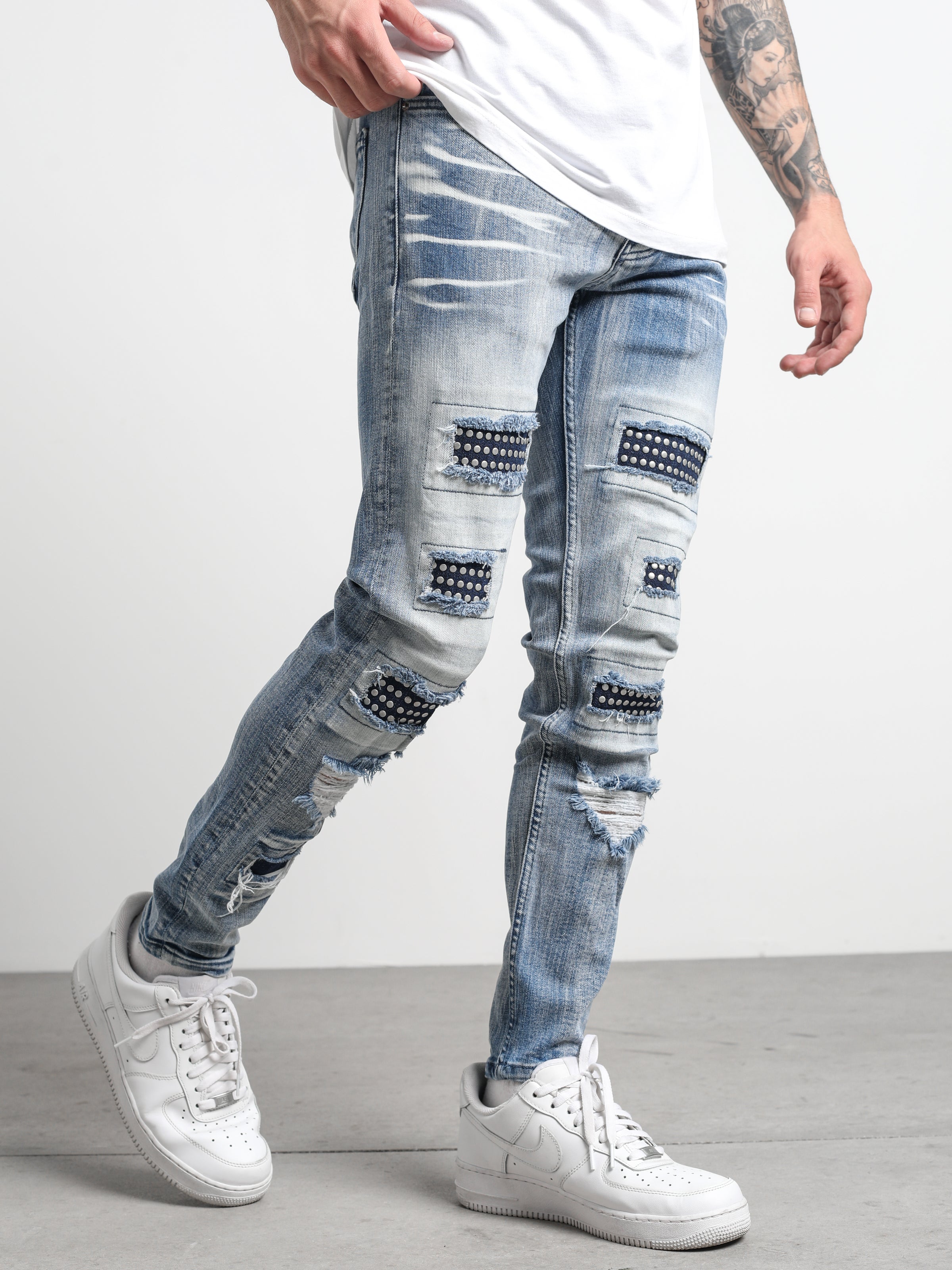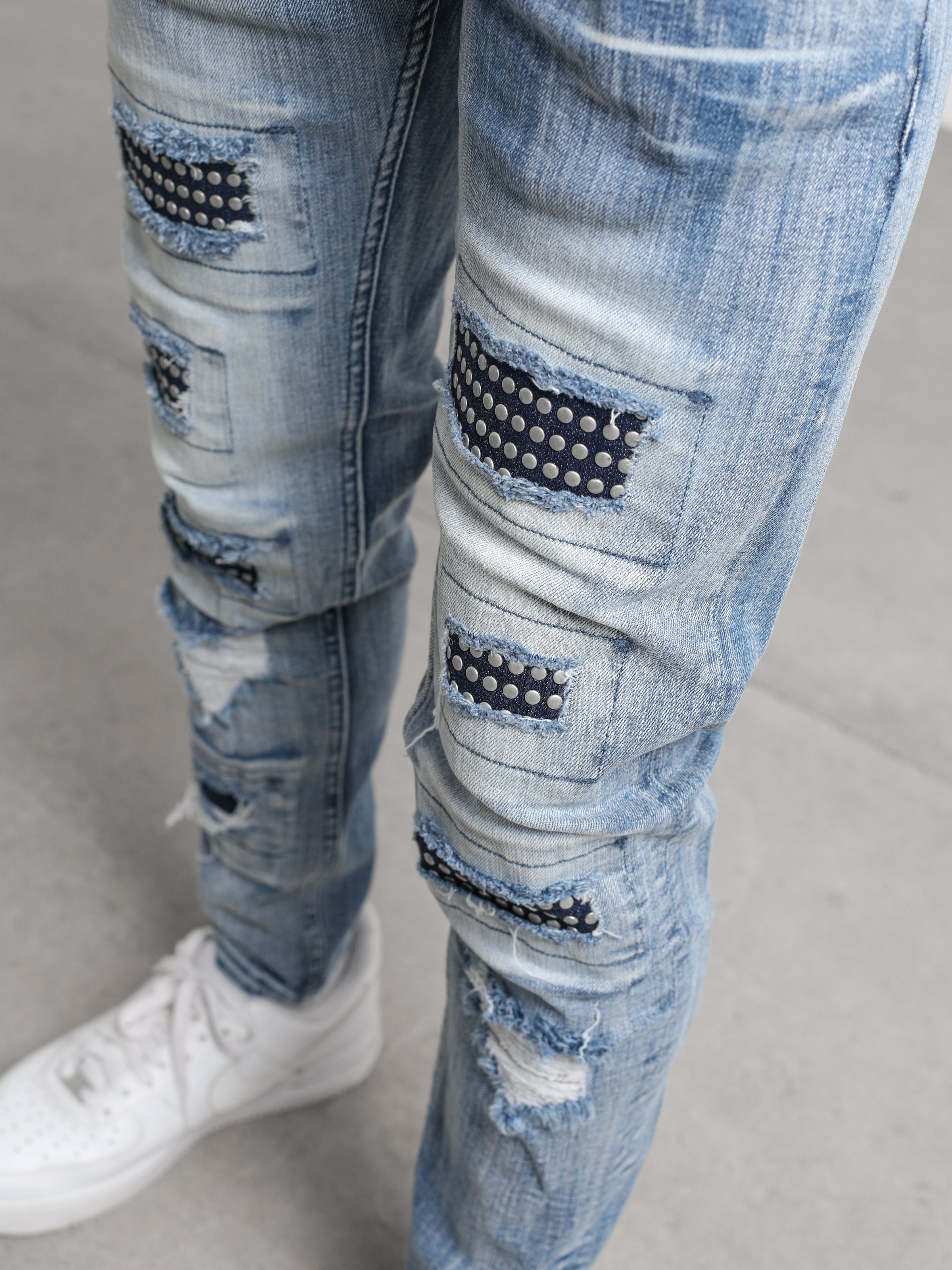 Rider Jeans are patched with pins in rip holes. It is slim-fit blue jeans with light-washed stretchy denim fabric.