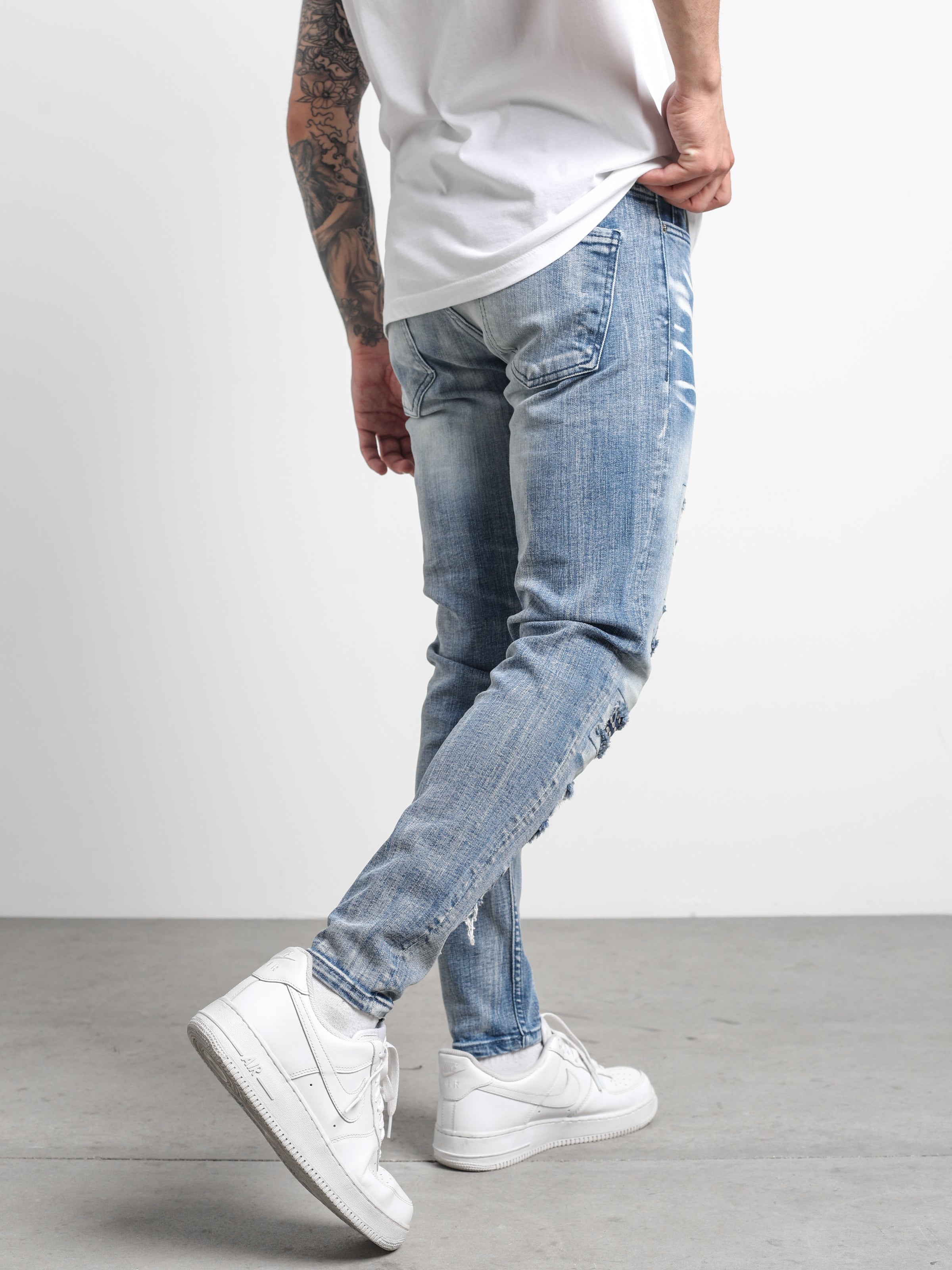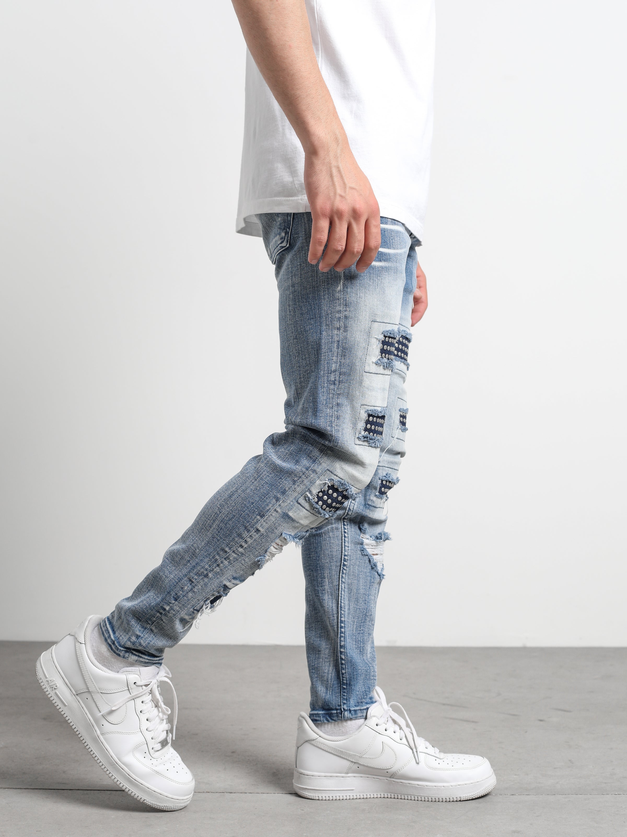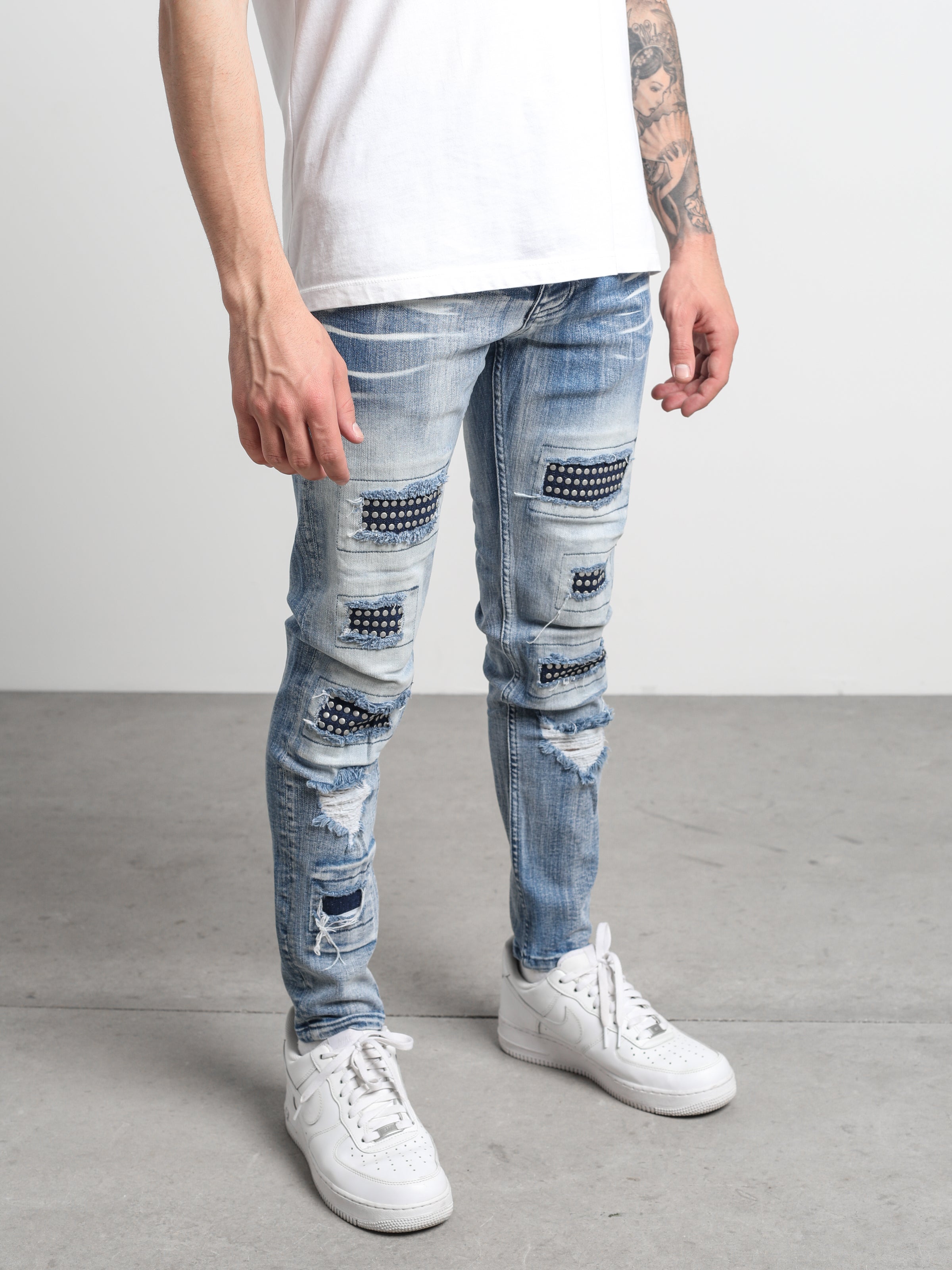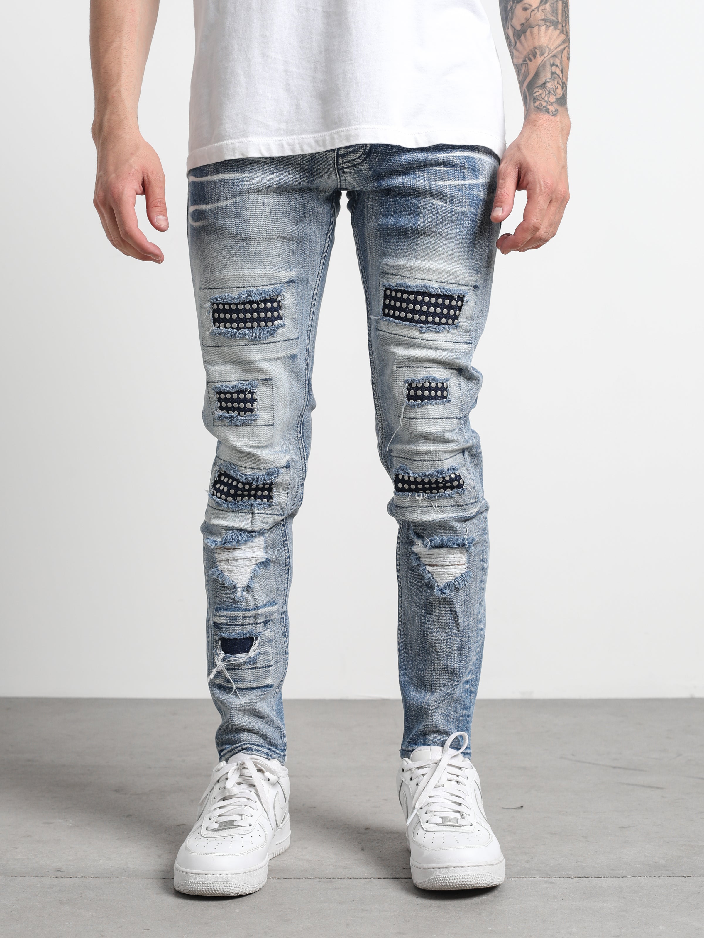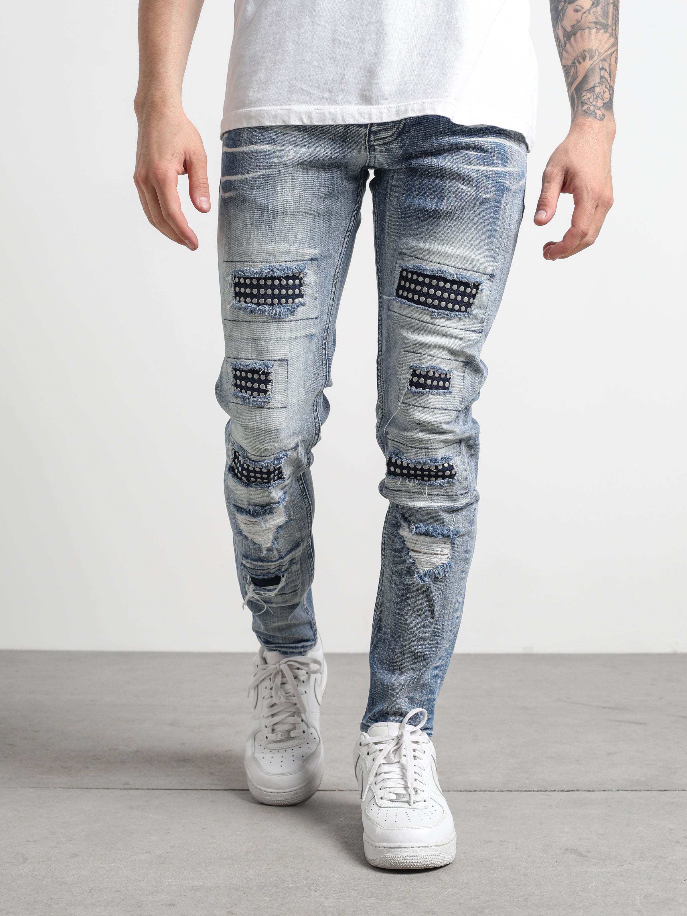 Rider Jeans are patched with pins in rip holes. It is slim-fit blue jeans with light-washed stretchy denim fabric.
