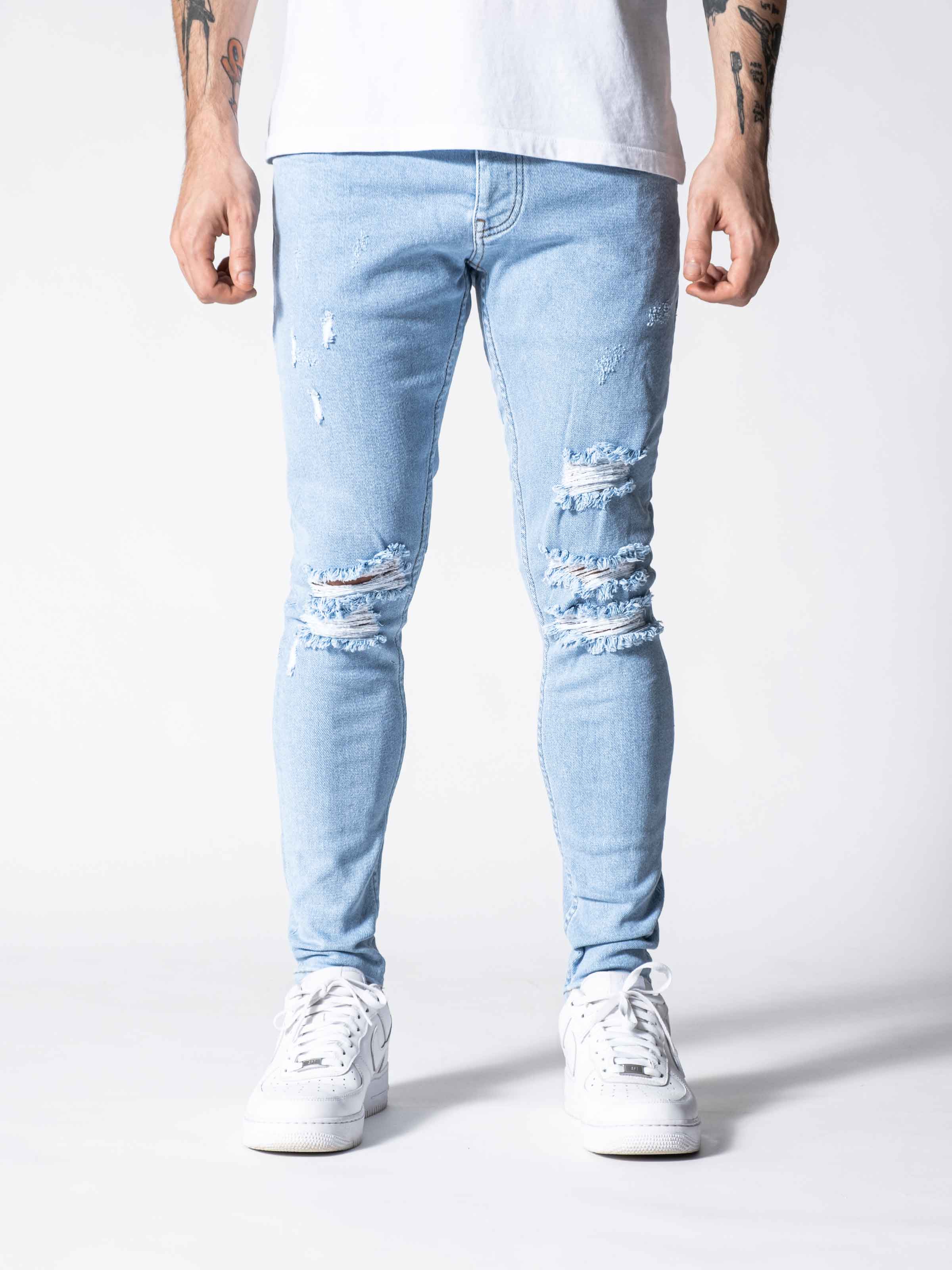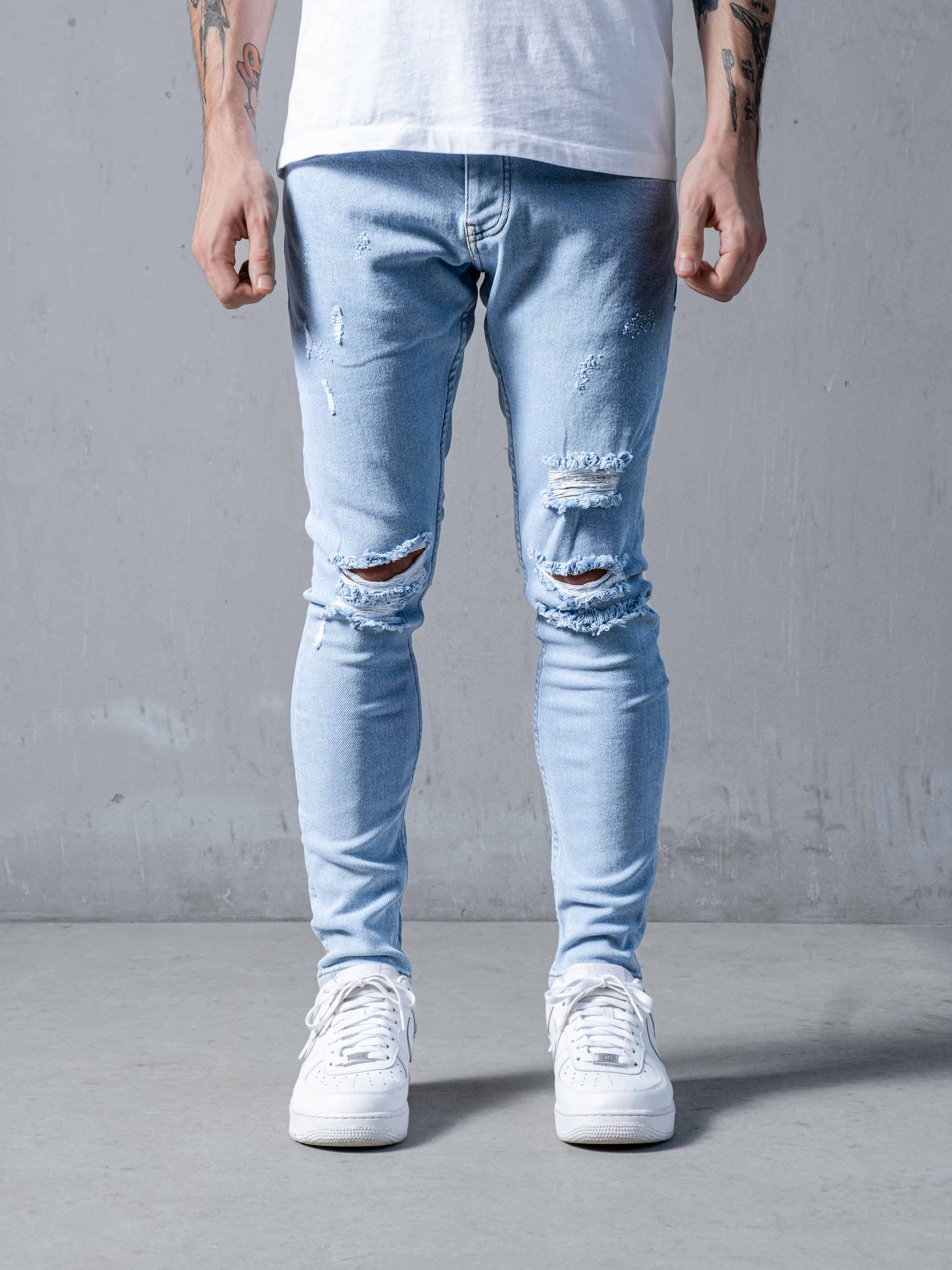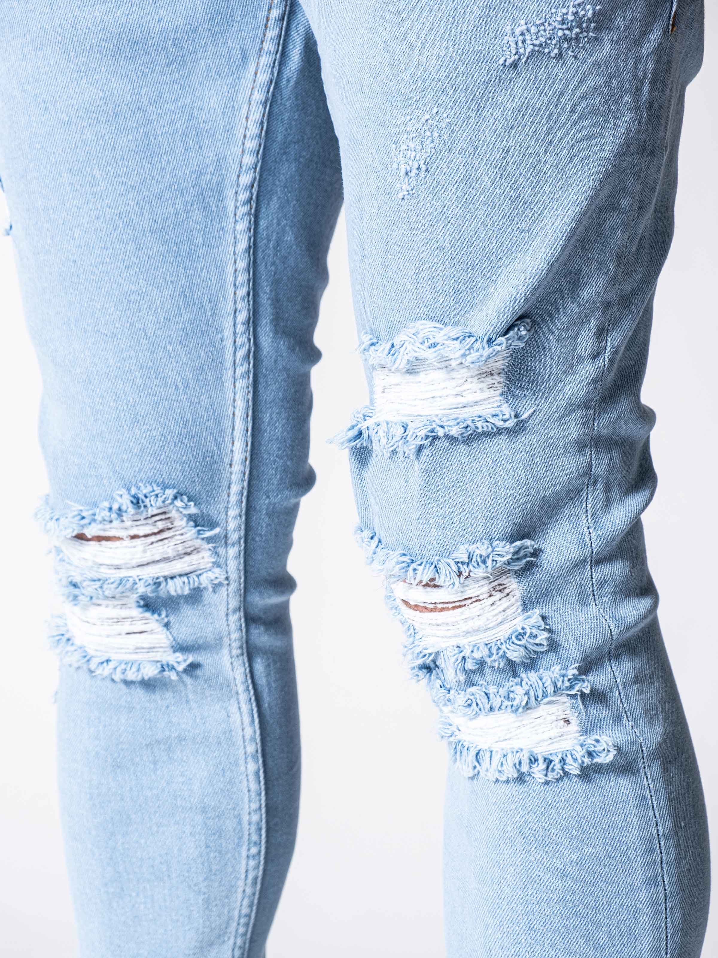 Clouds Jeans is made from blue high-quality clean stretchy denim fabric. It is a skinny fit and it gets skinnier through to leg openings. As you can see it has random rips on the front.