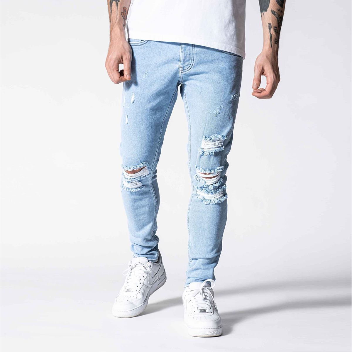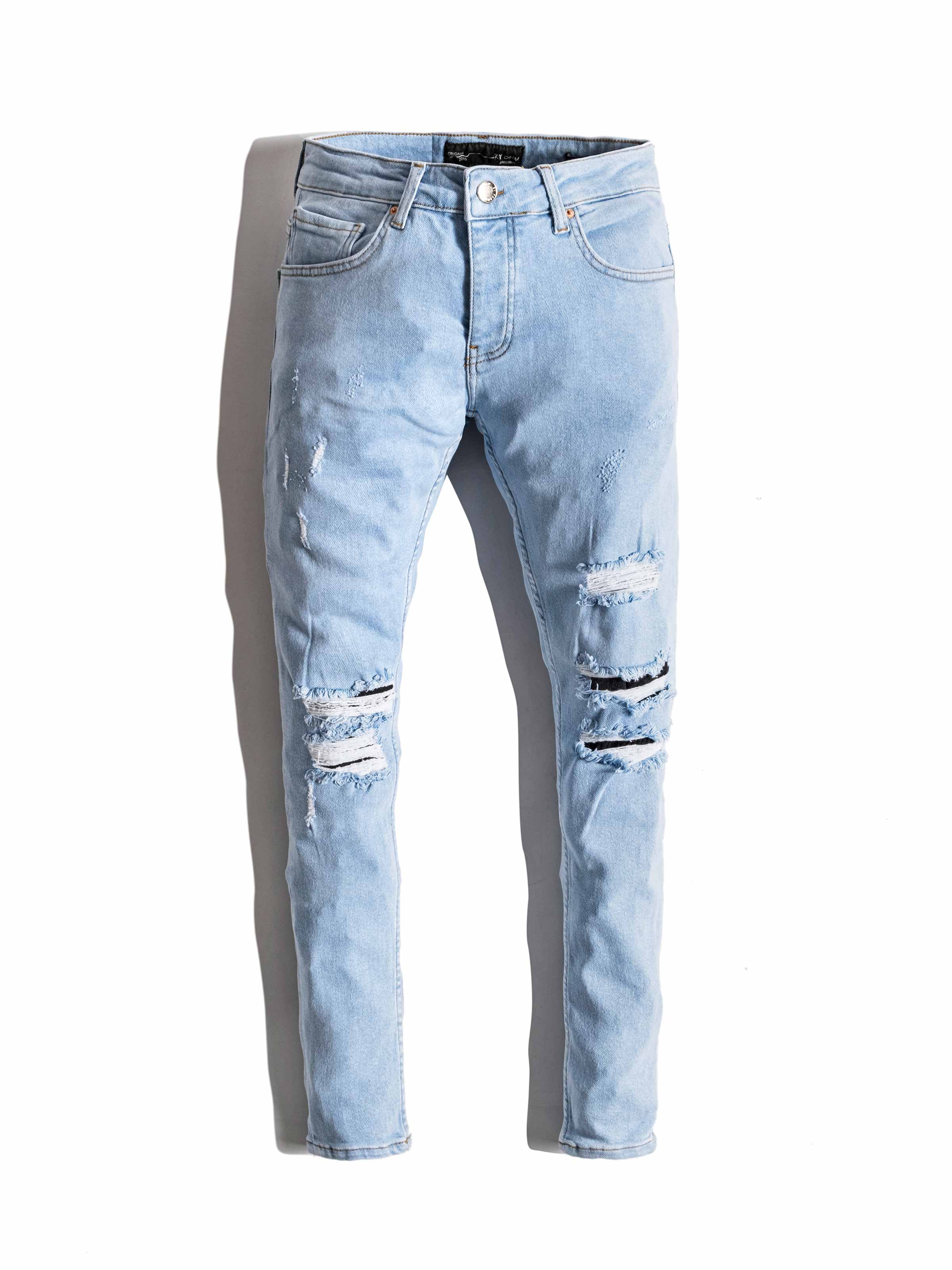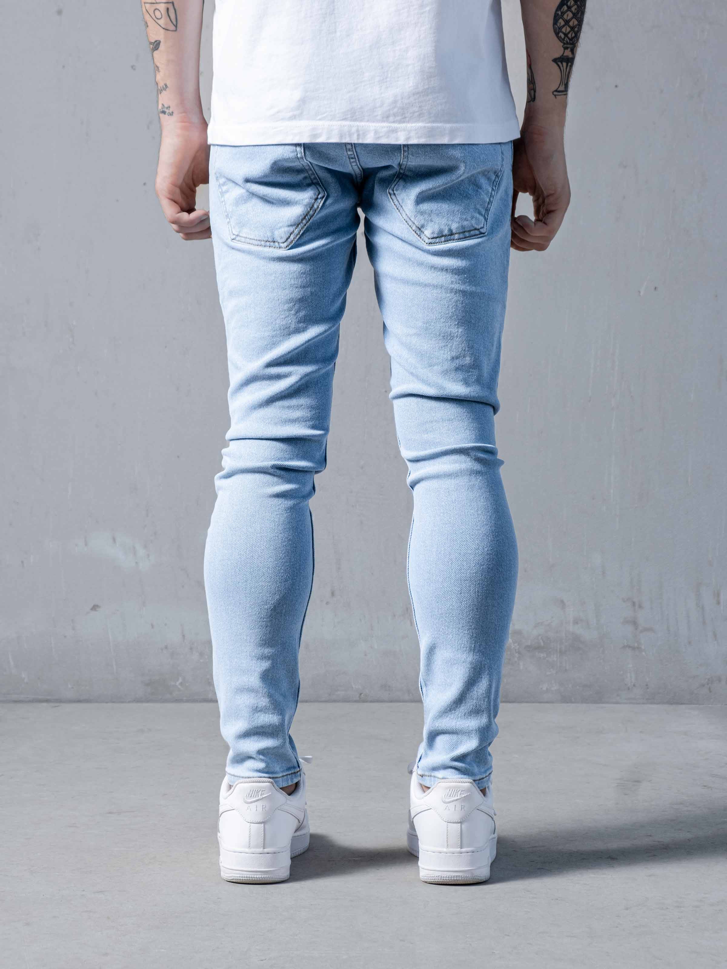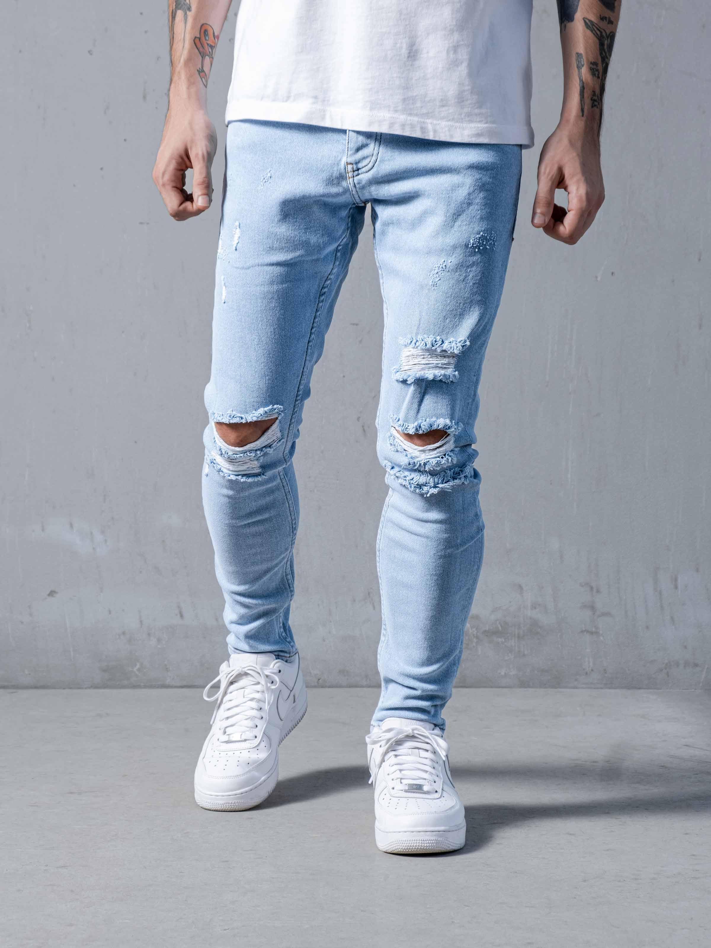 Clouds Jeans is made from blue high-quality clean stretchy denim fabric. It is a skinny fit and it gets skinnier through to leg openings. As you can see it has random rips on the front.