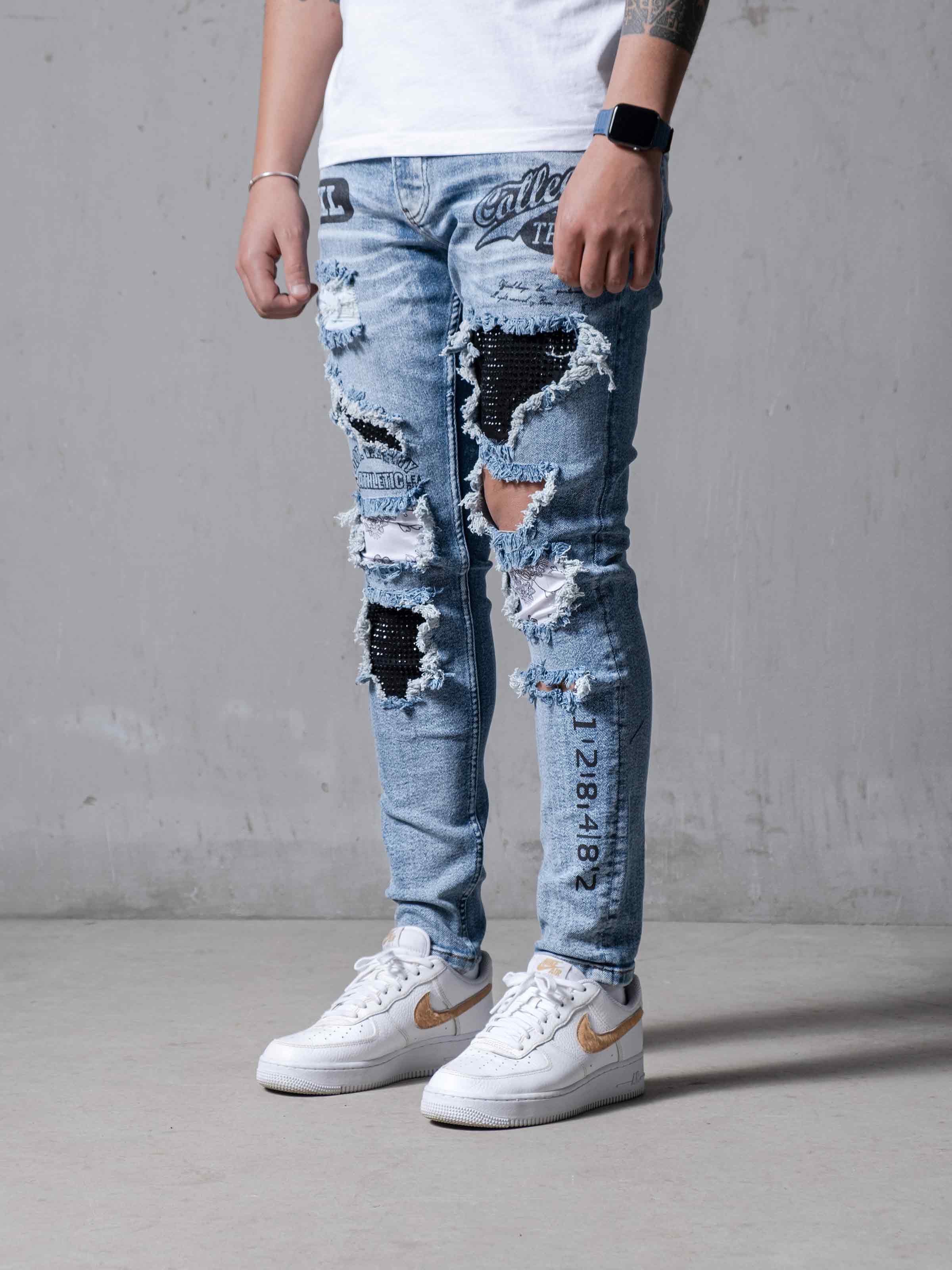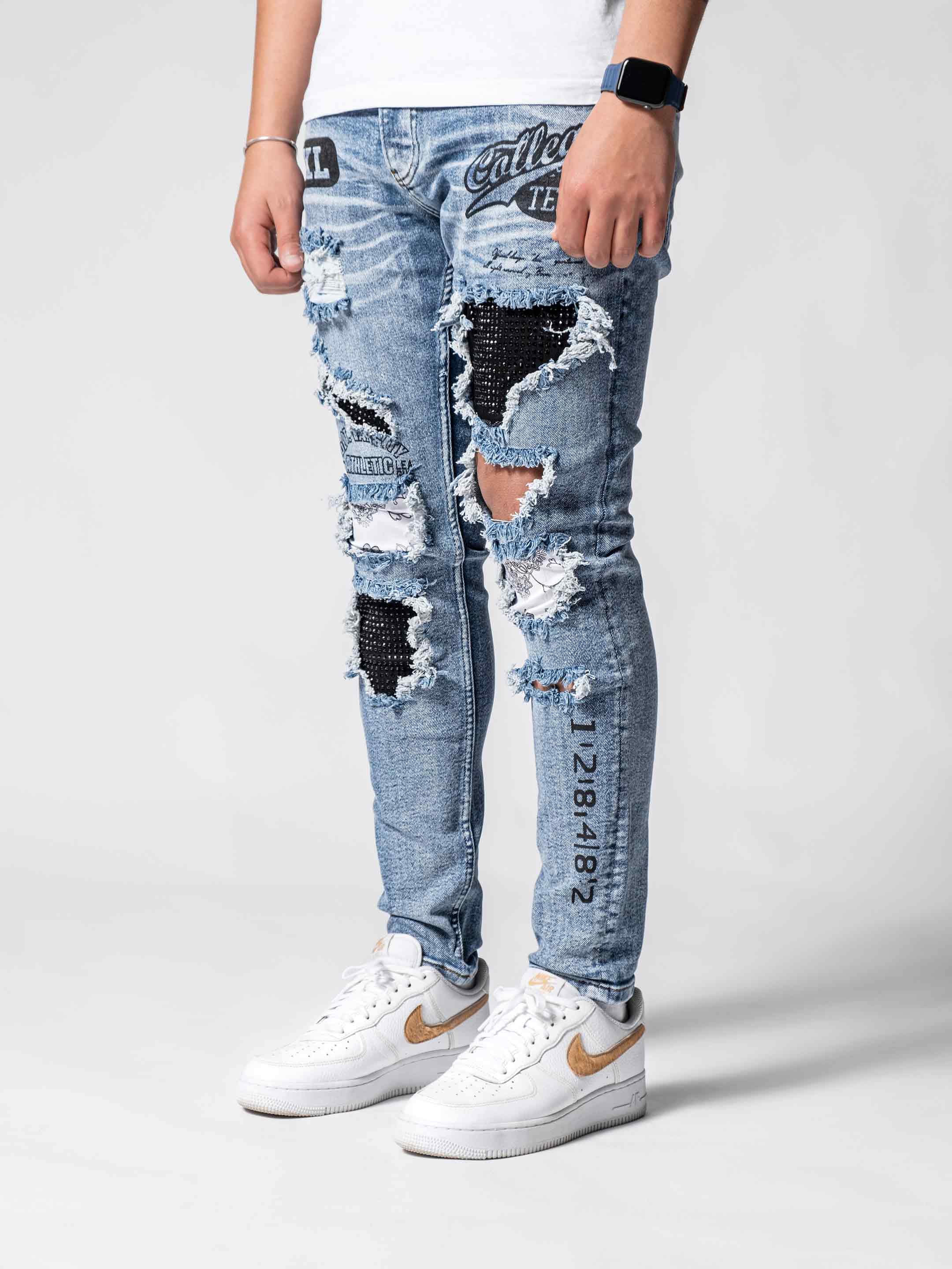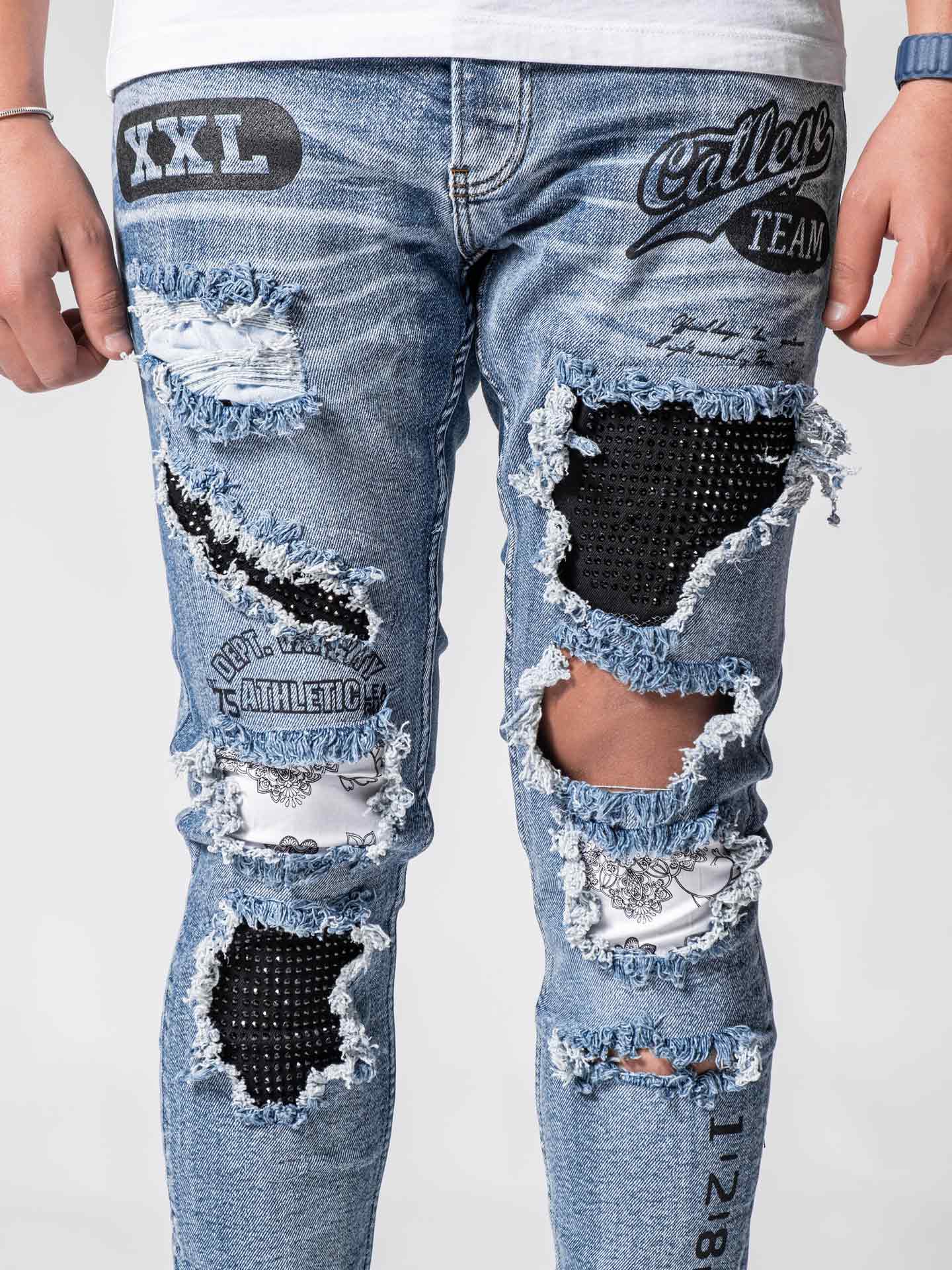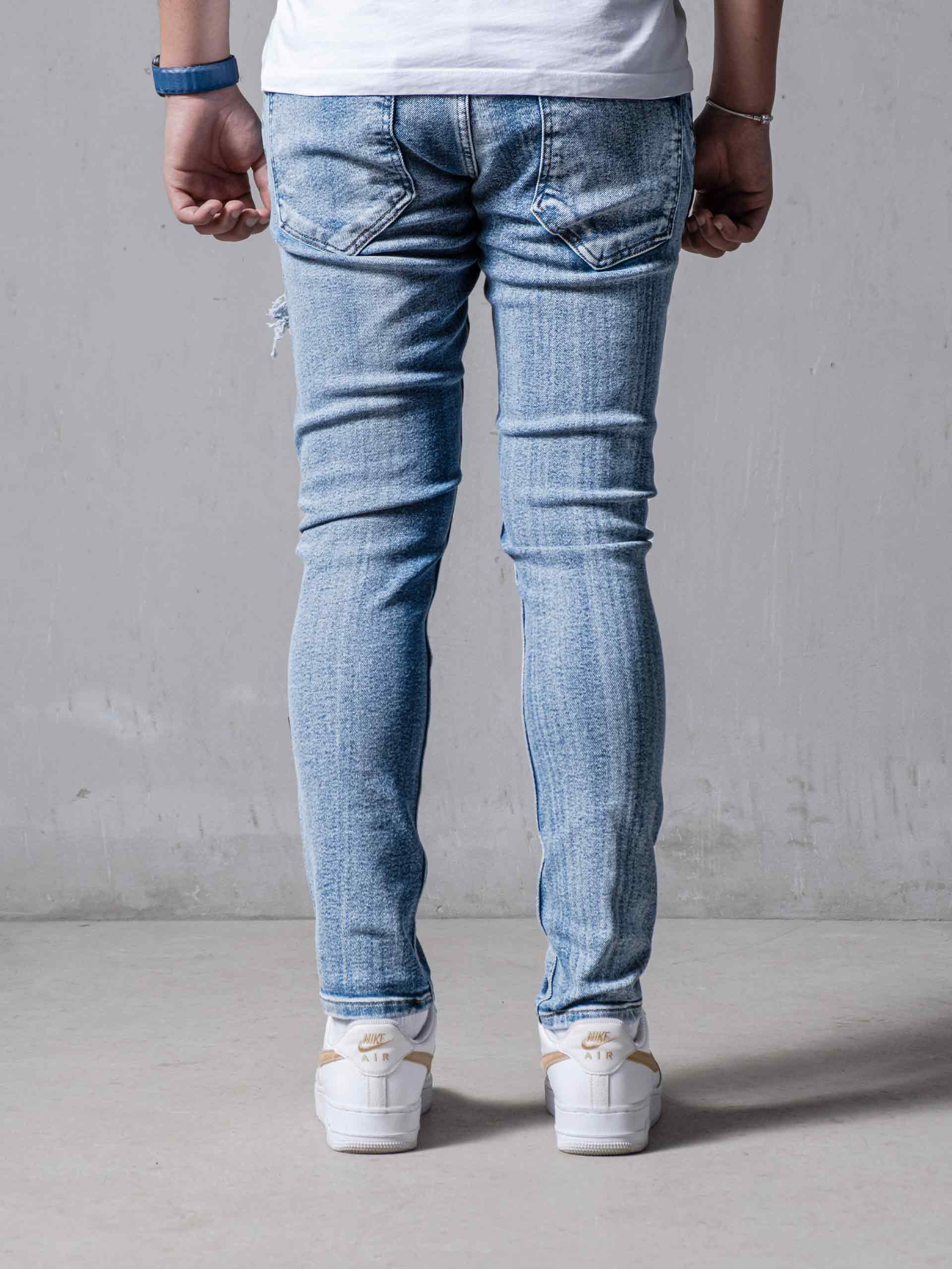 Destruidos Jeans are made from Blue Stretchy Denim Fabric. It is ripped and repaired from the inside. It is a skinny fit and it gets skinnier through to ankles