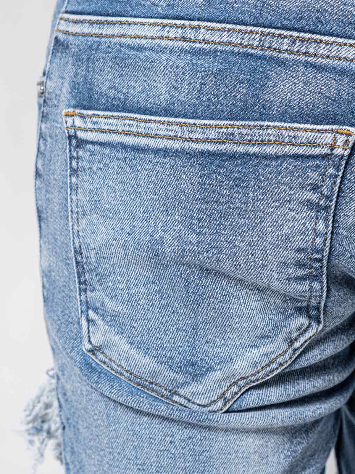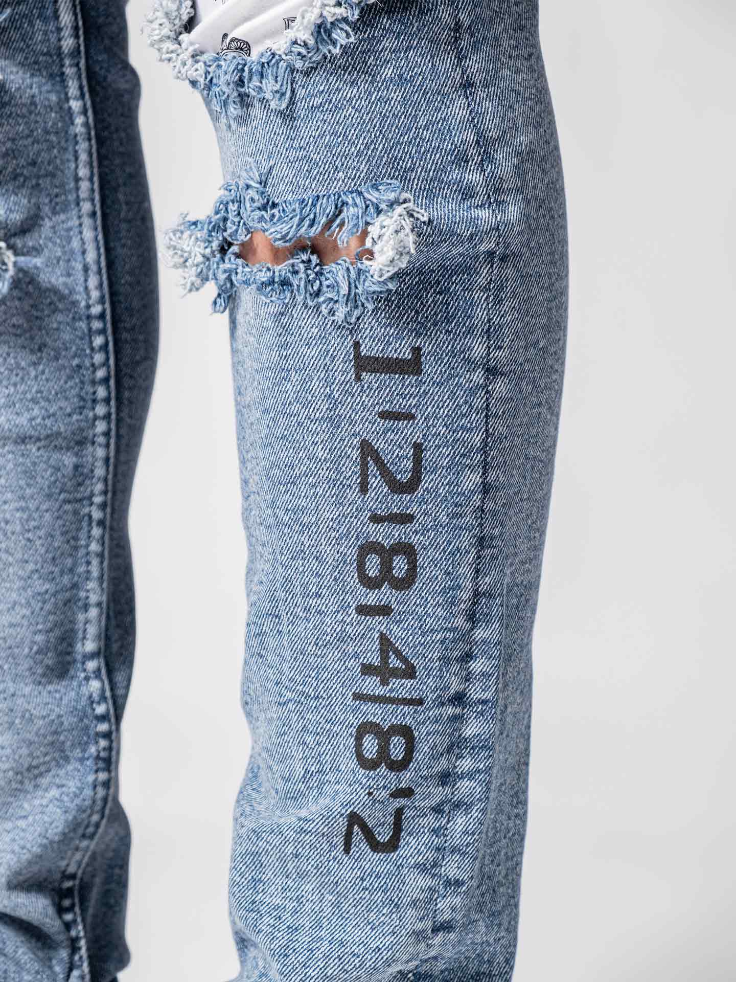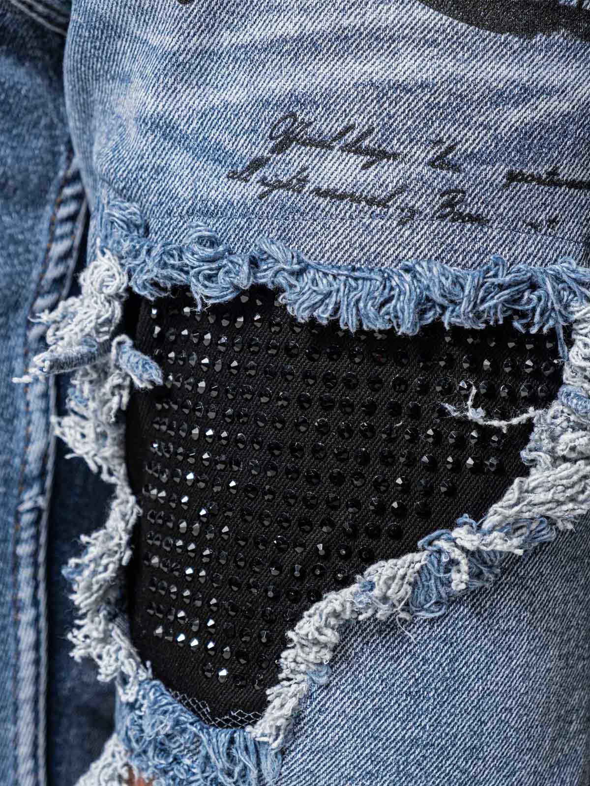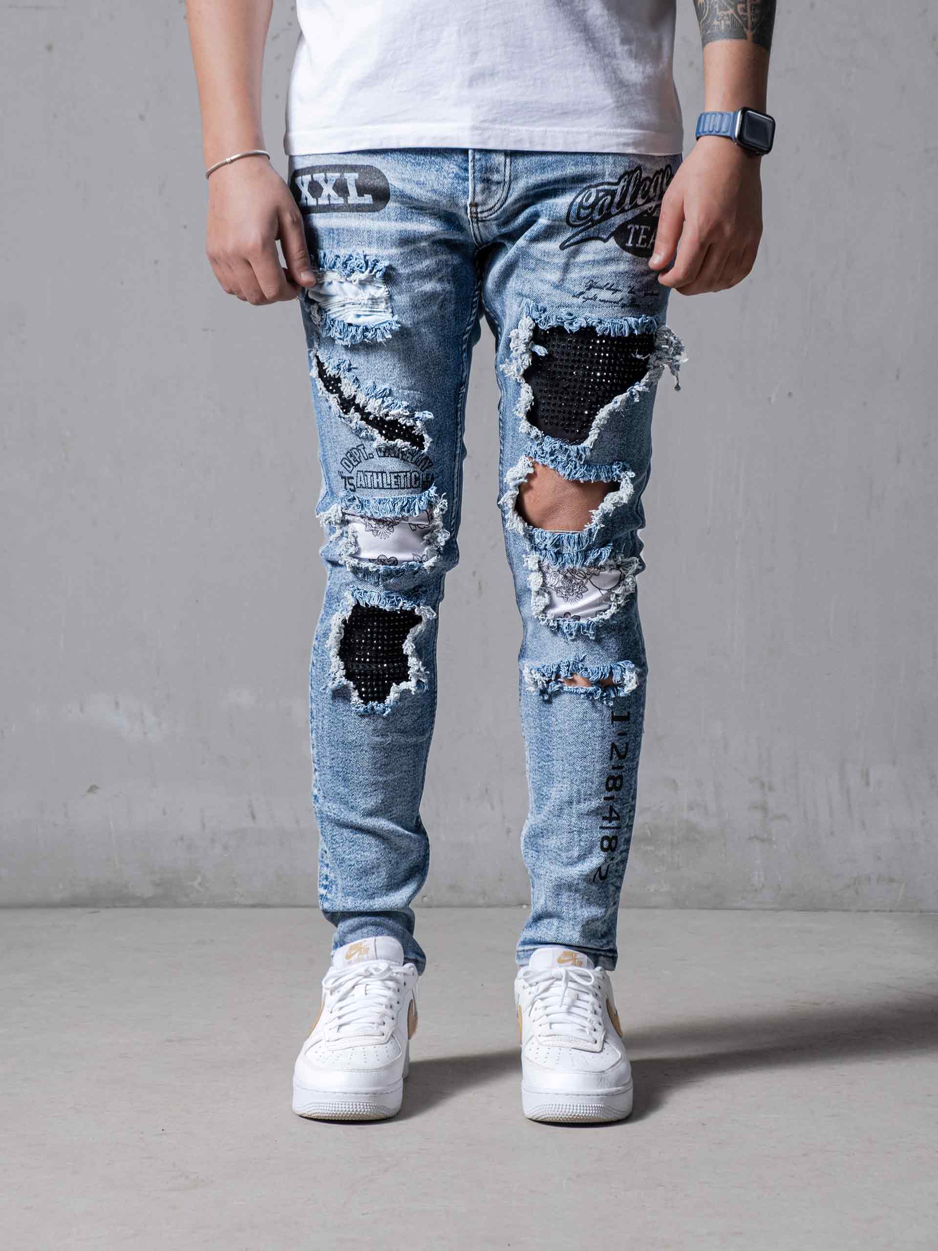 Destruidos Jeans are made from Blue Stretchy Denim Fabric. It is ripped and repaired from the inside. It is a skinny fit and it gets skinnier through to ankles