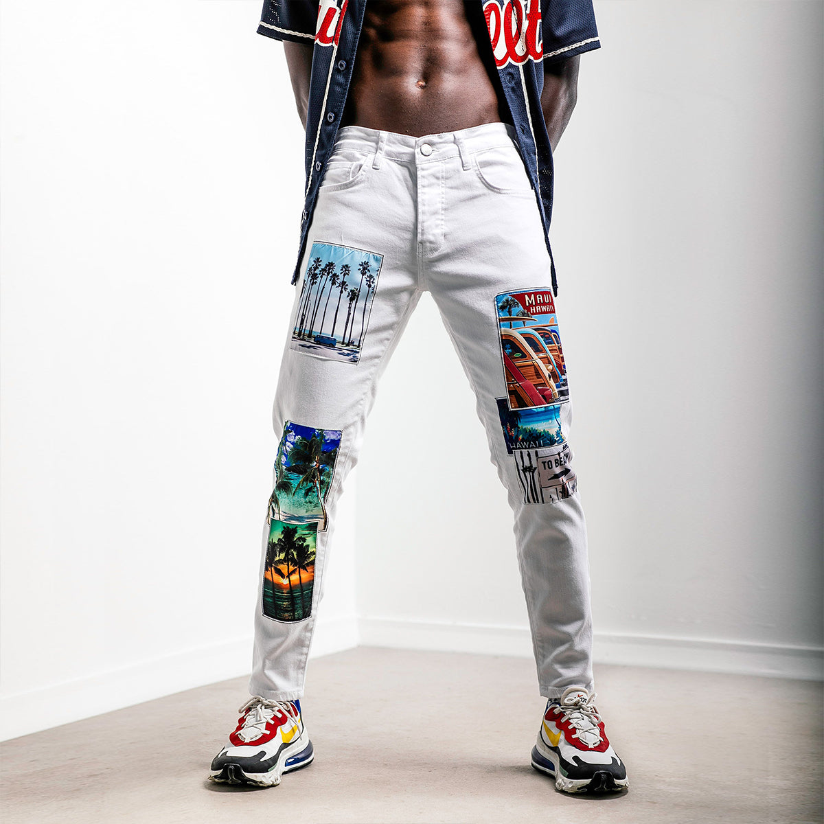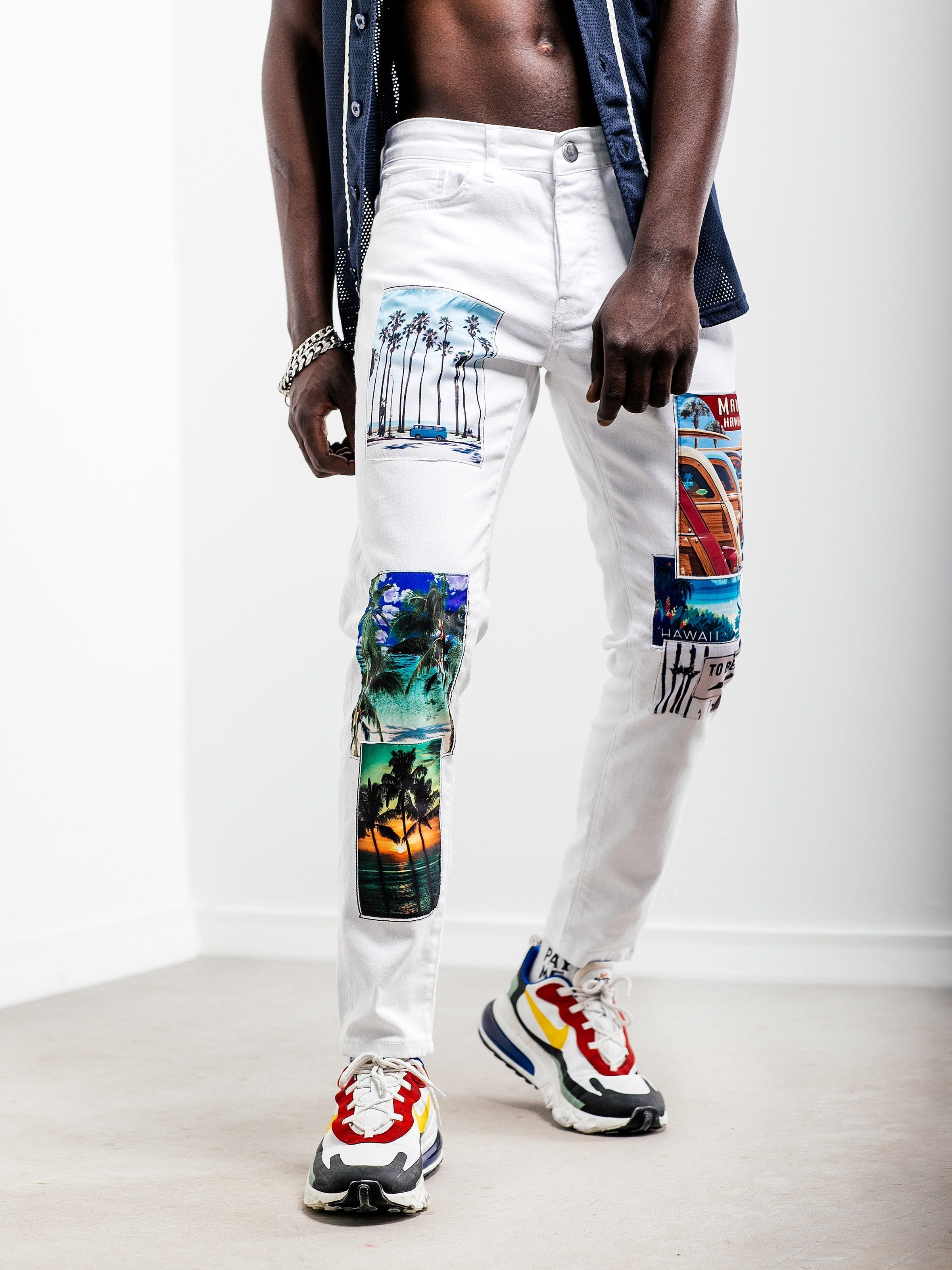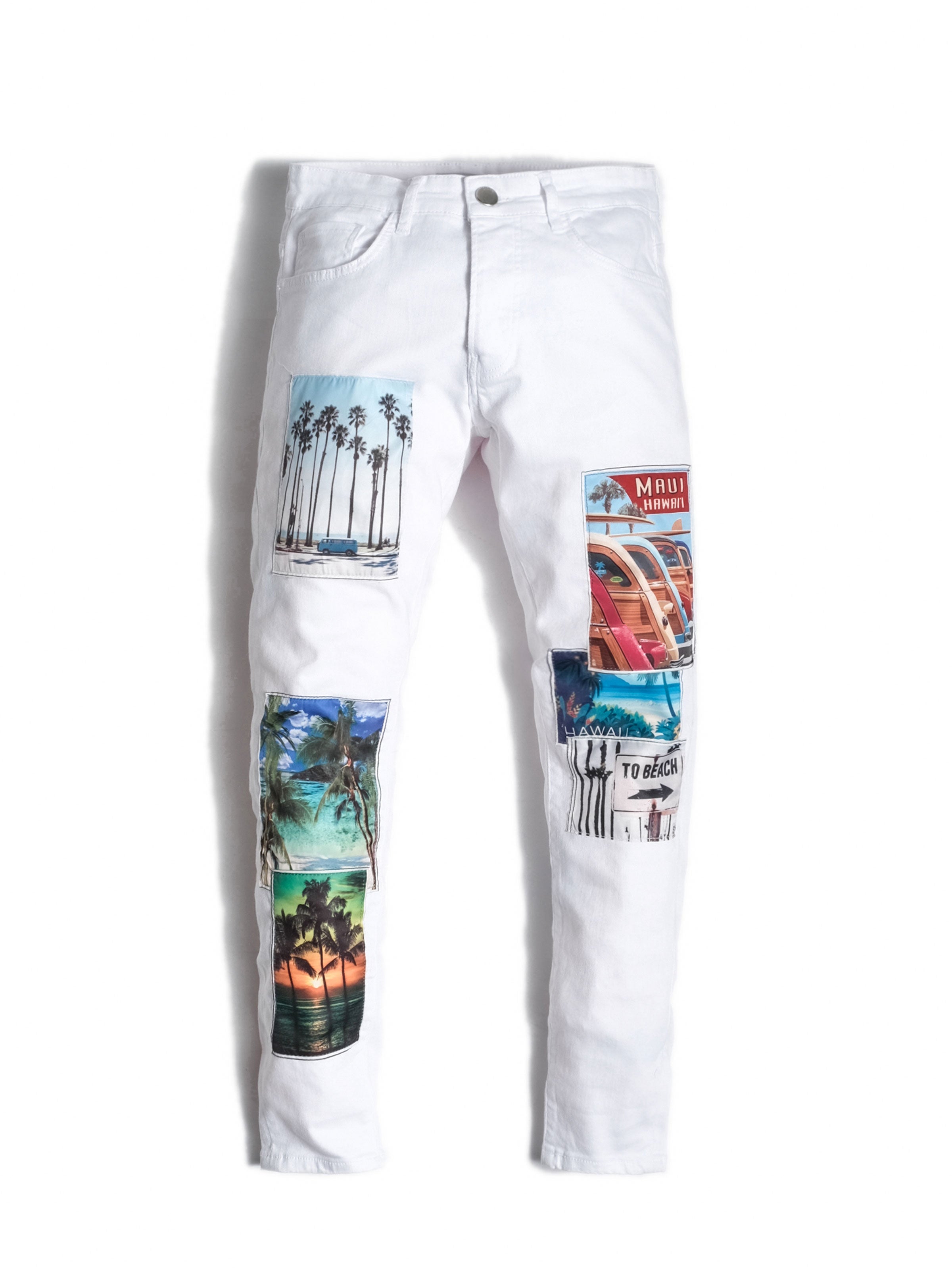 Florida denim is made from clean white denim fabric and it has patches on front.