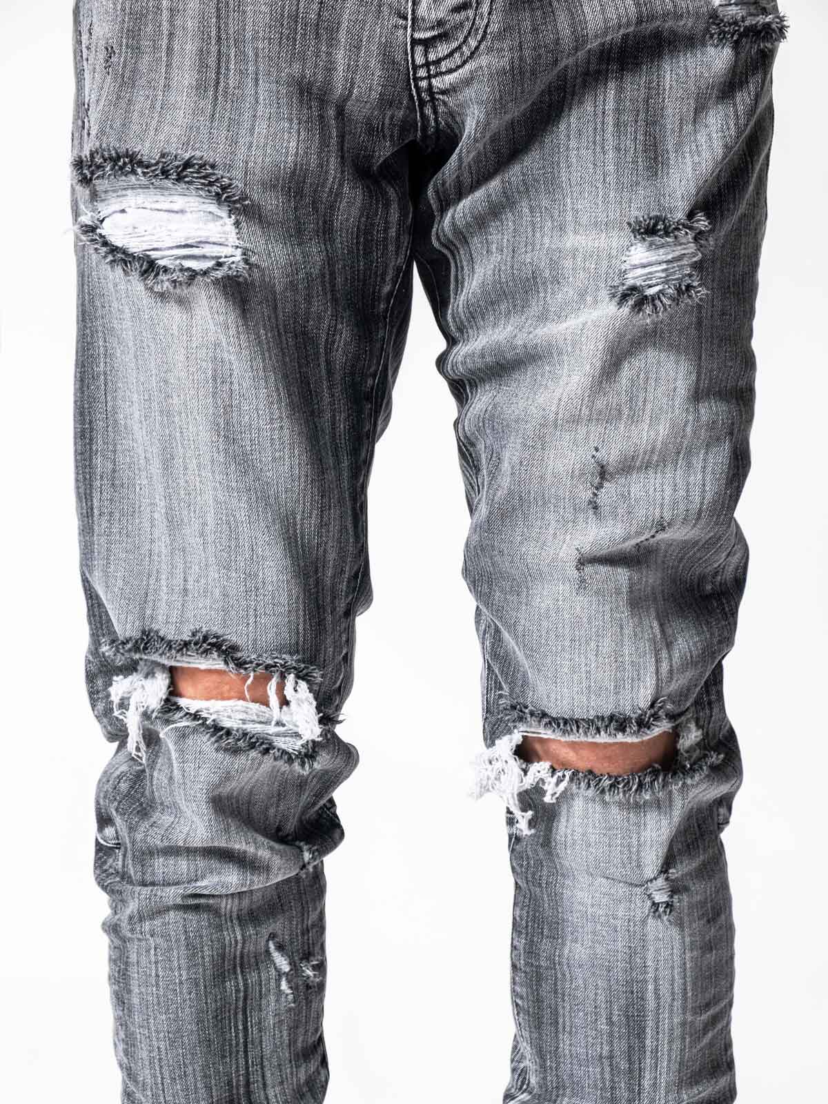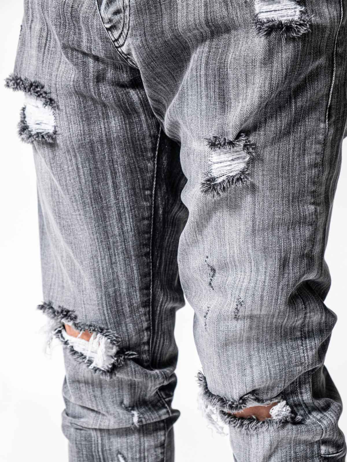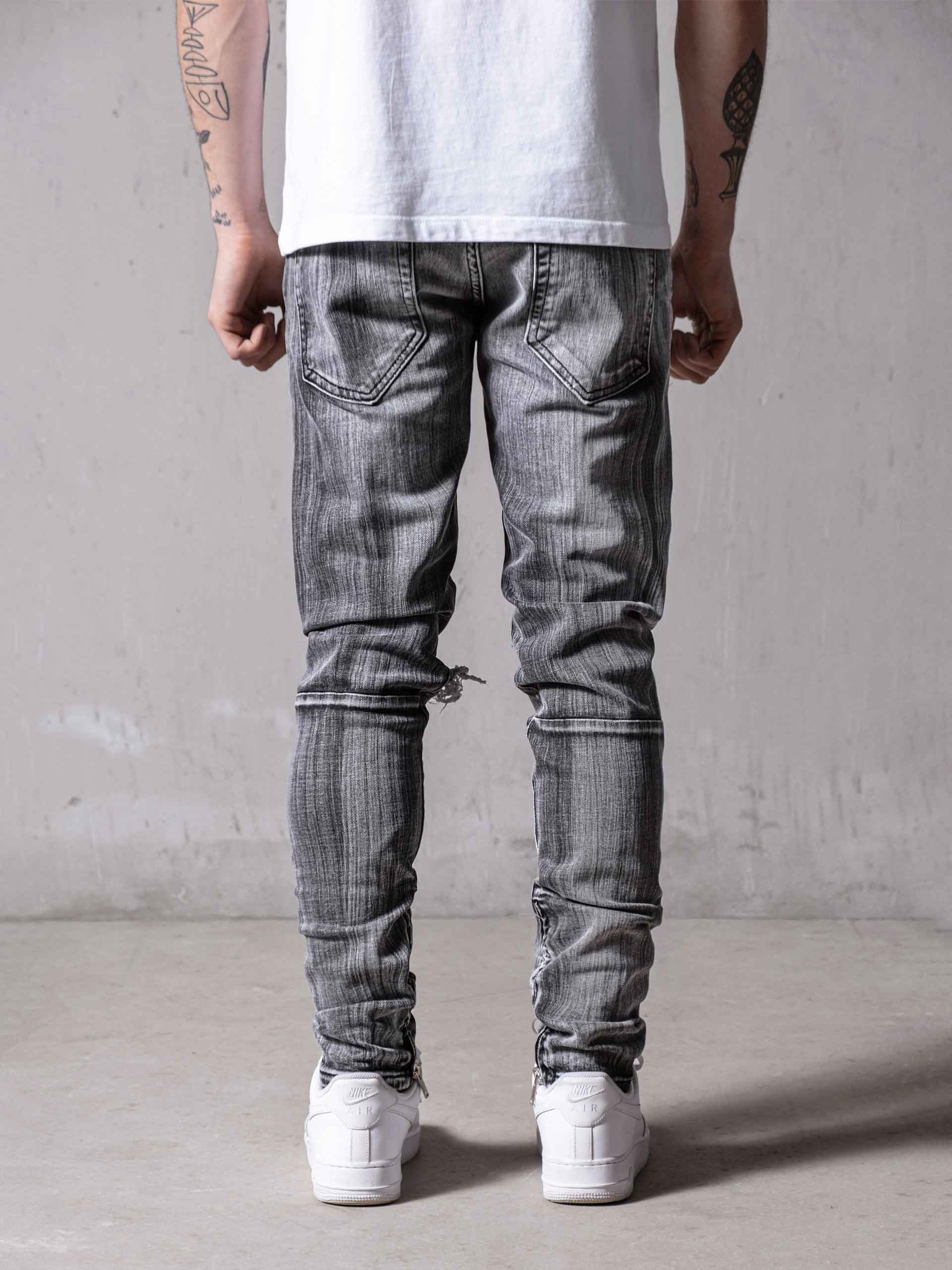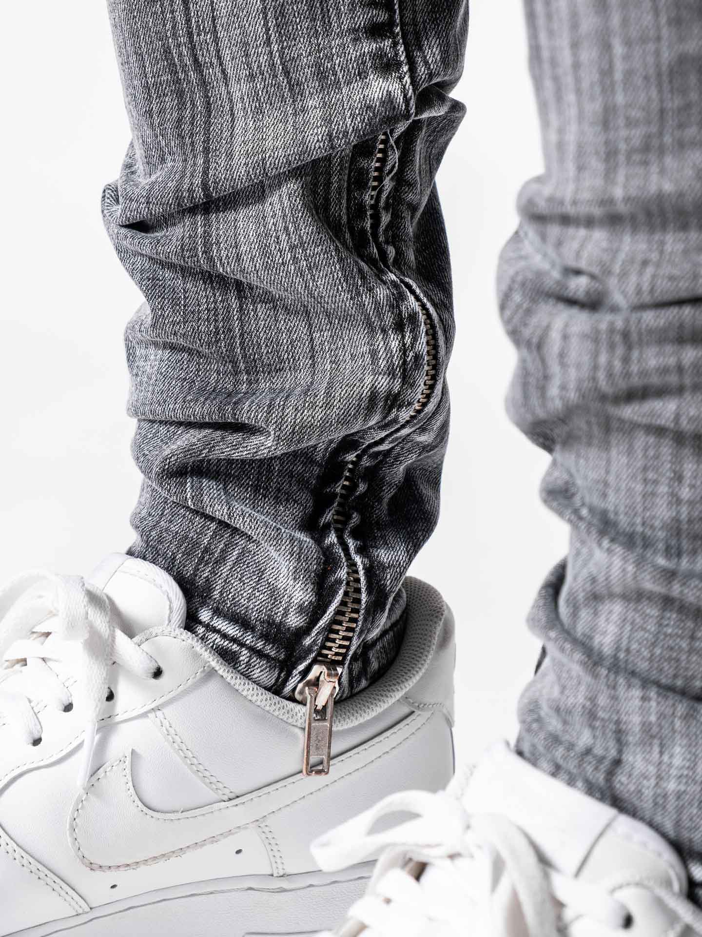 Grey Mono Essential Jeans are made from high-quality grey stretchy denim fabric and these jeans are designed with a relaxed fit through the thigh that tapers from the knee to the ankle, featuring a stonewashed ripped look besides at the end of the jeans zipper details on the inseams.