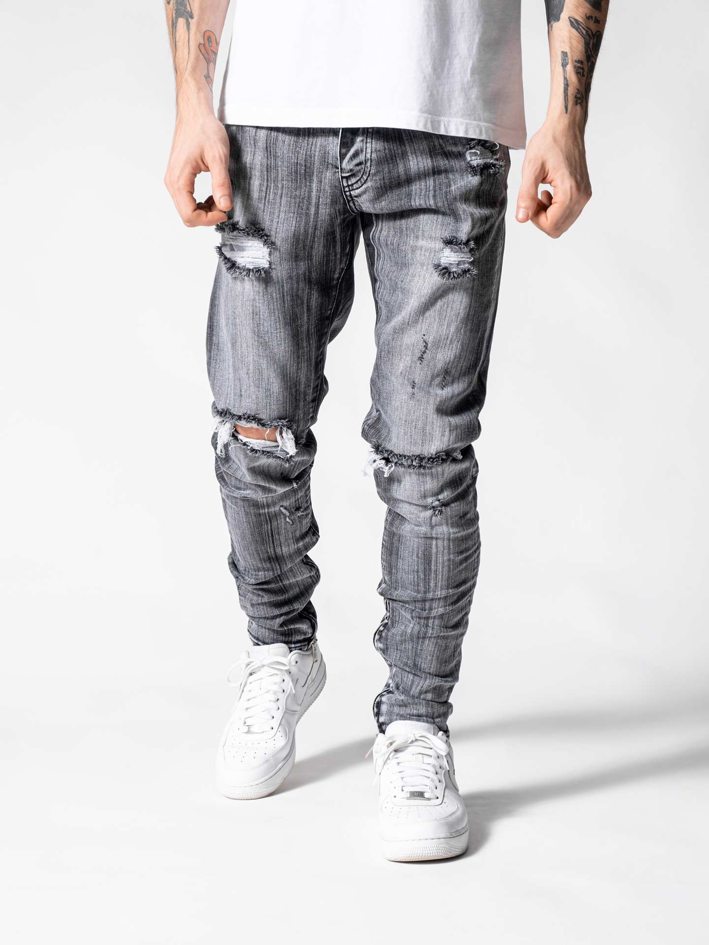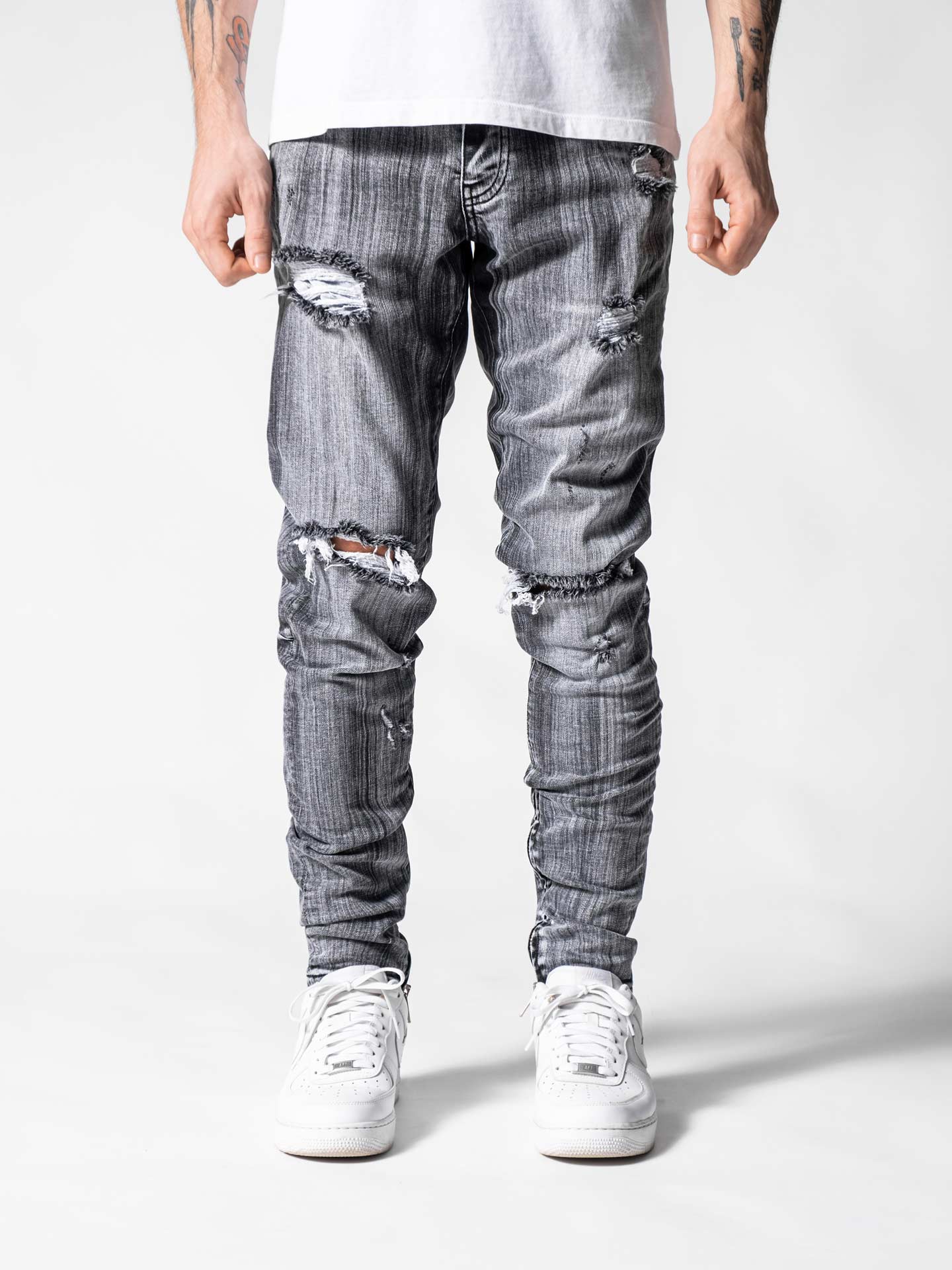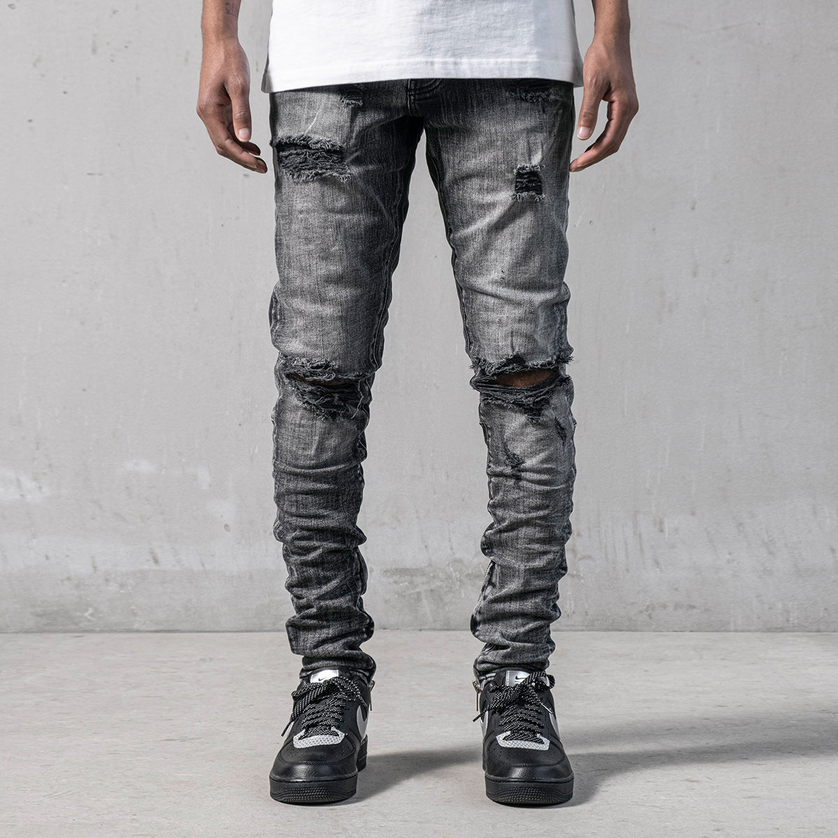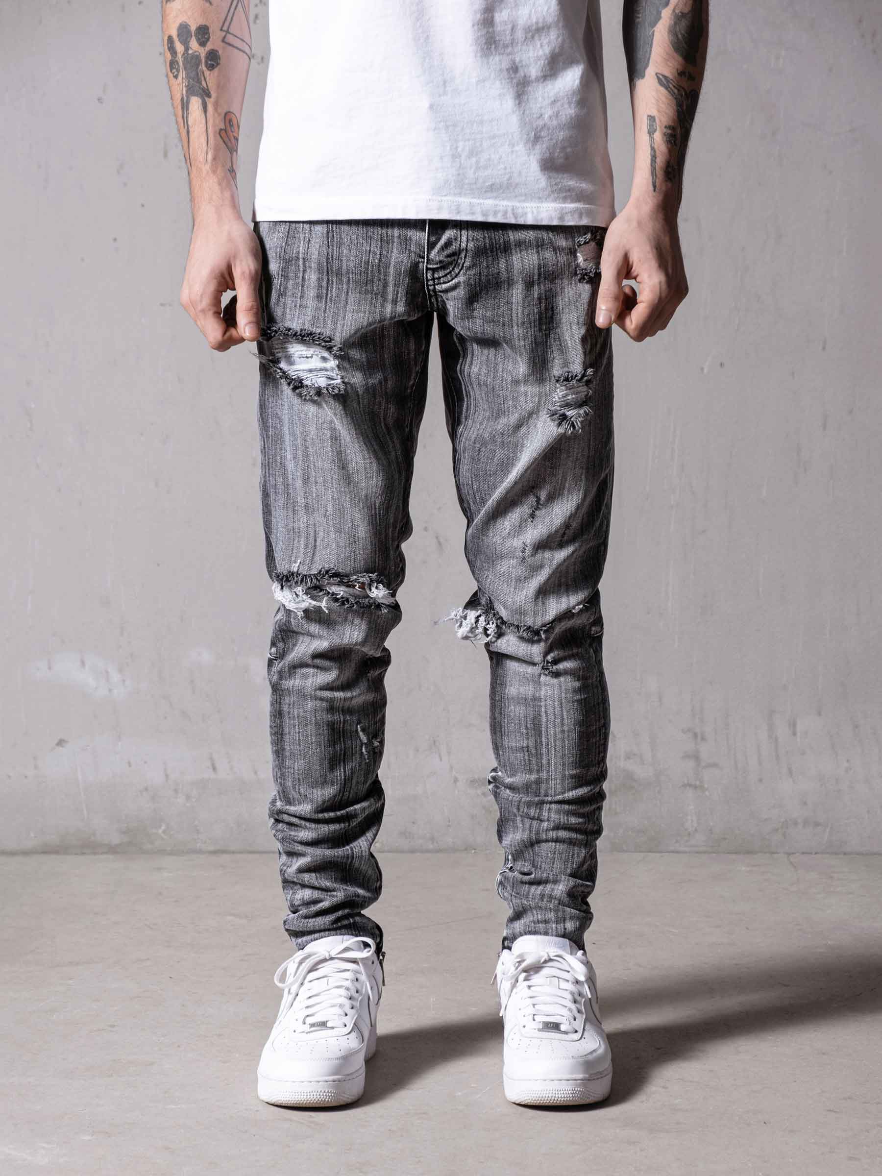 Grey Mono Essential Jeans are made from high-quality grey stretchy denim fabric and these jeans are designed with a relaxed fit through the thigh that tapers from the knee to the ankle, featuring a stonewashed ripped look besides at the end of the jeans zipper details on the inseams.
