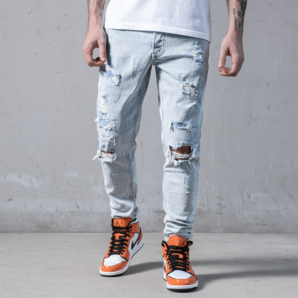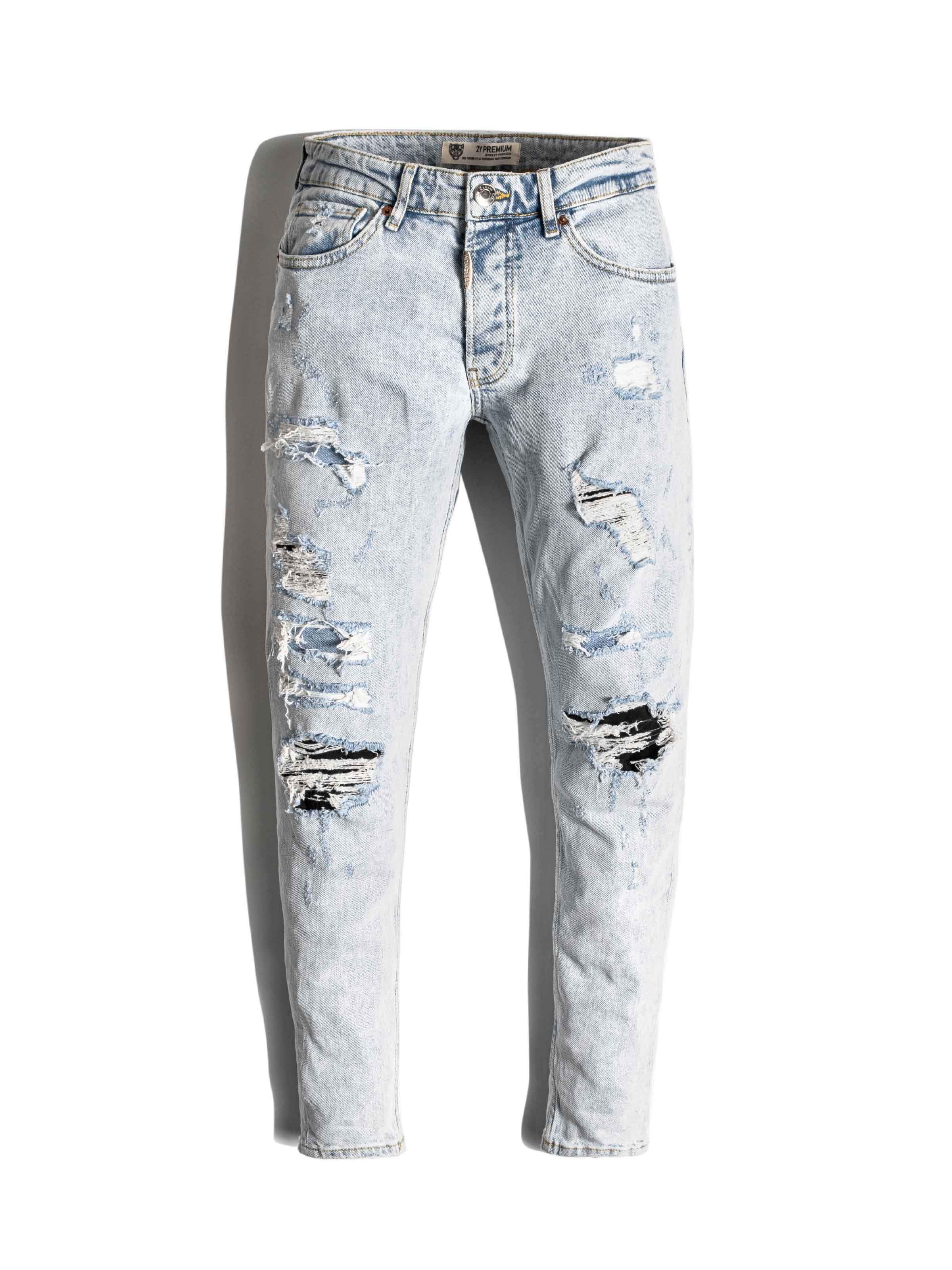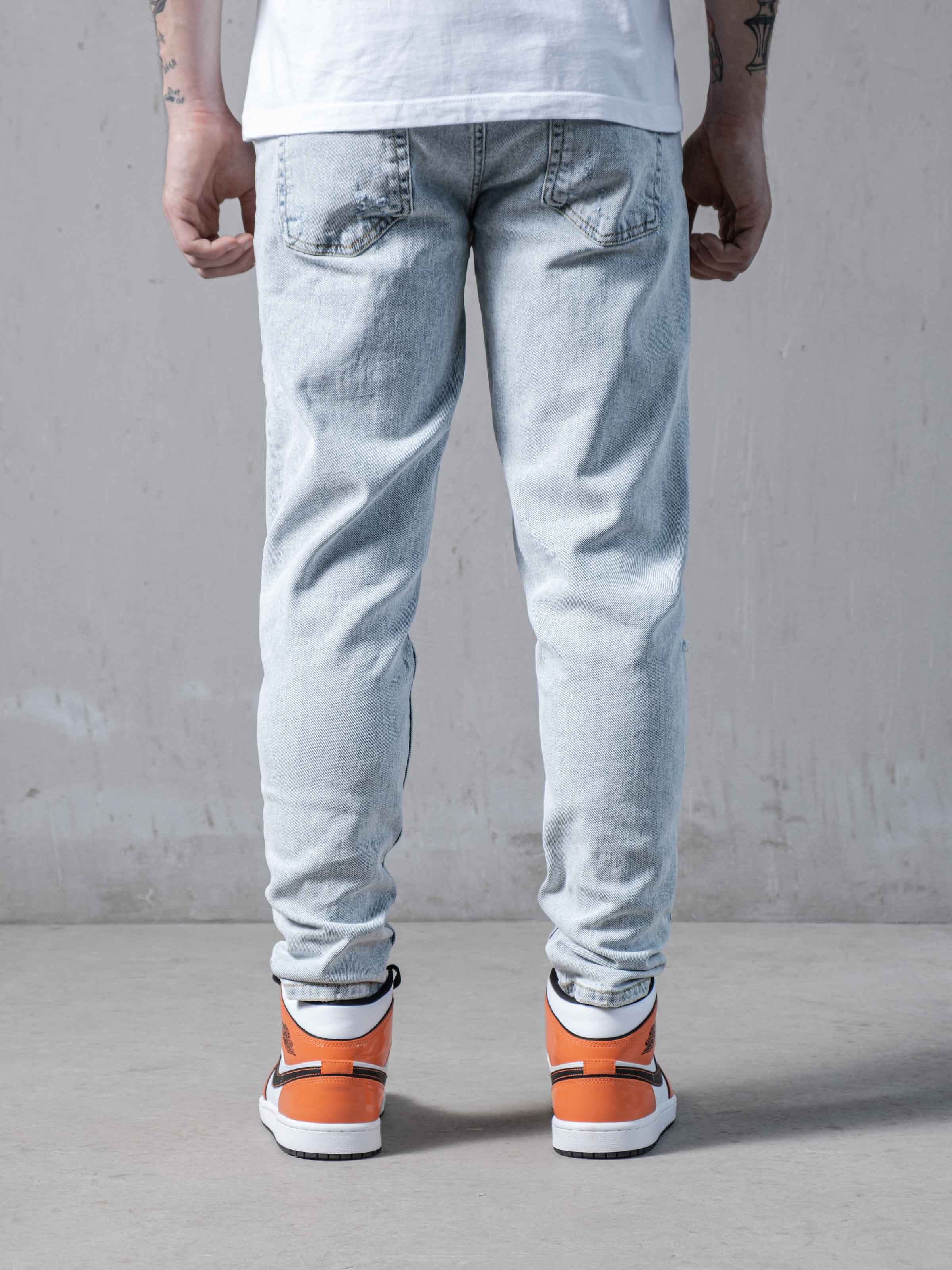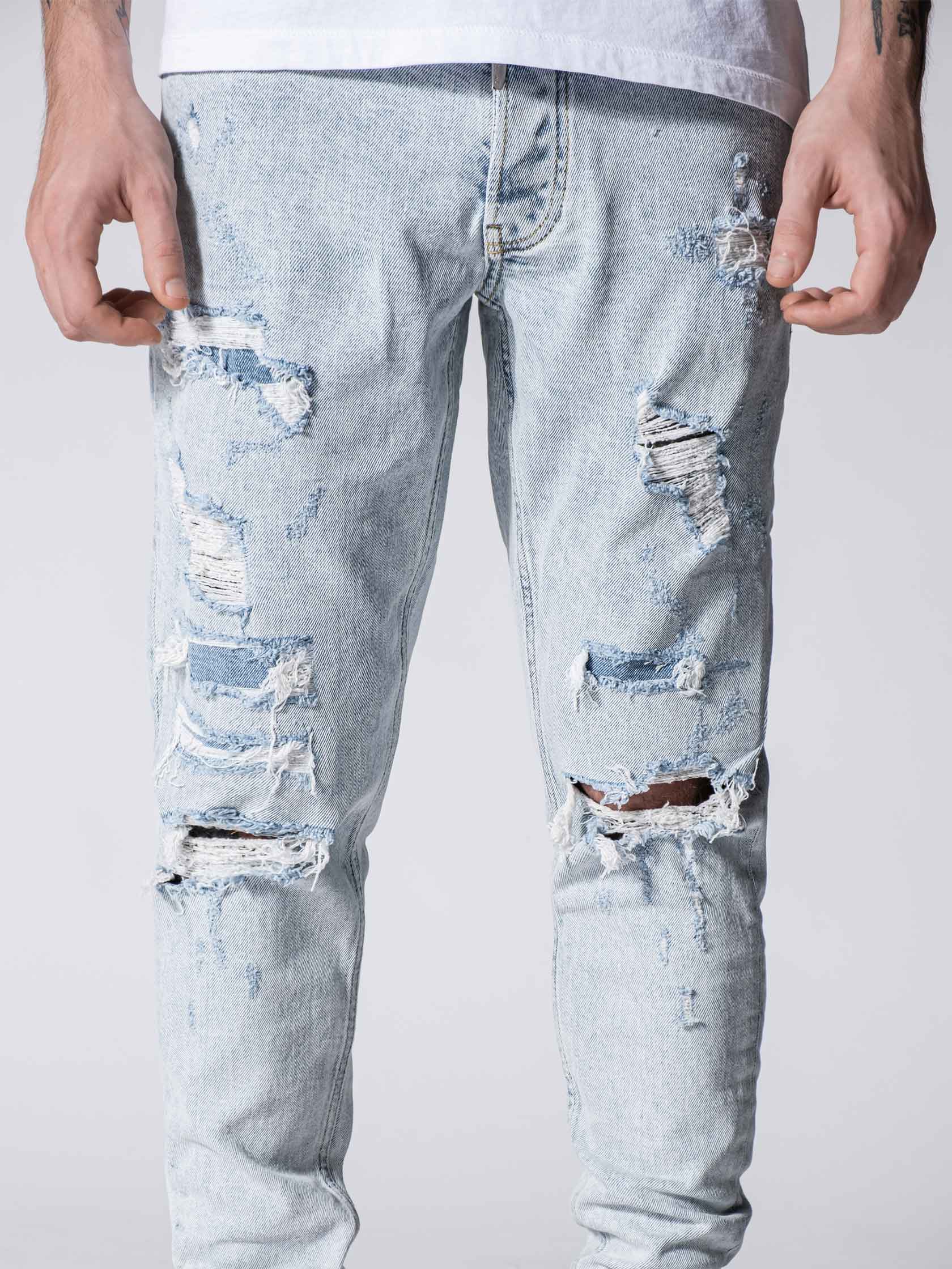 Ice Jeans are made from distressed and stonewashed light denim fabric. It is slim fit jeans and it has rips and distressed on front