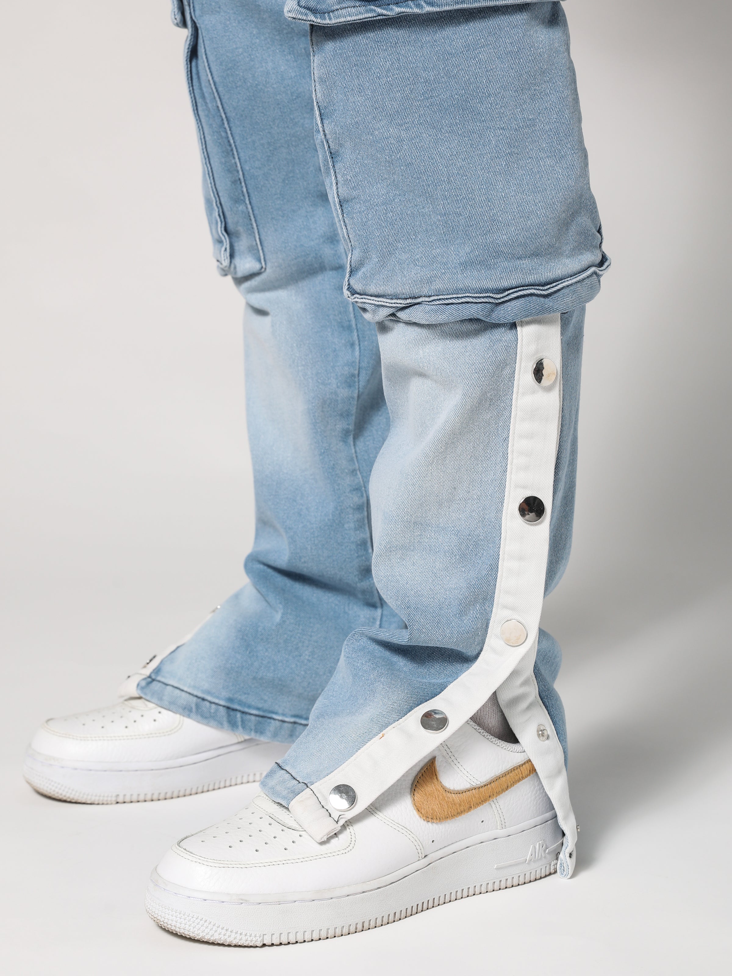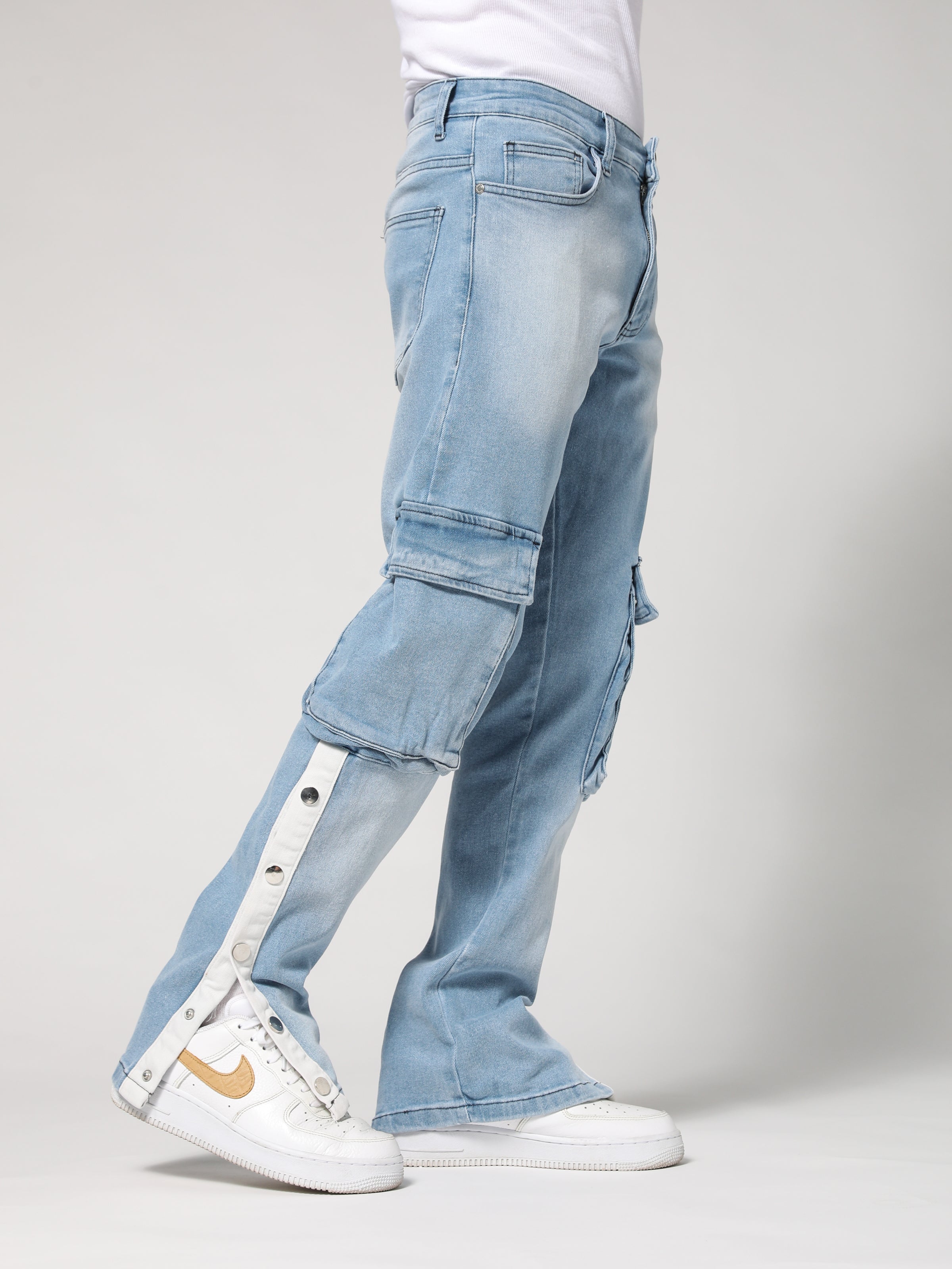 LA Denim Pants are made from high-quality denim fabric. It has cargo pockets and pop-up buttons on both sides. It is flare-cut denim. Comes in two colors; black & blue