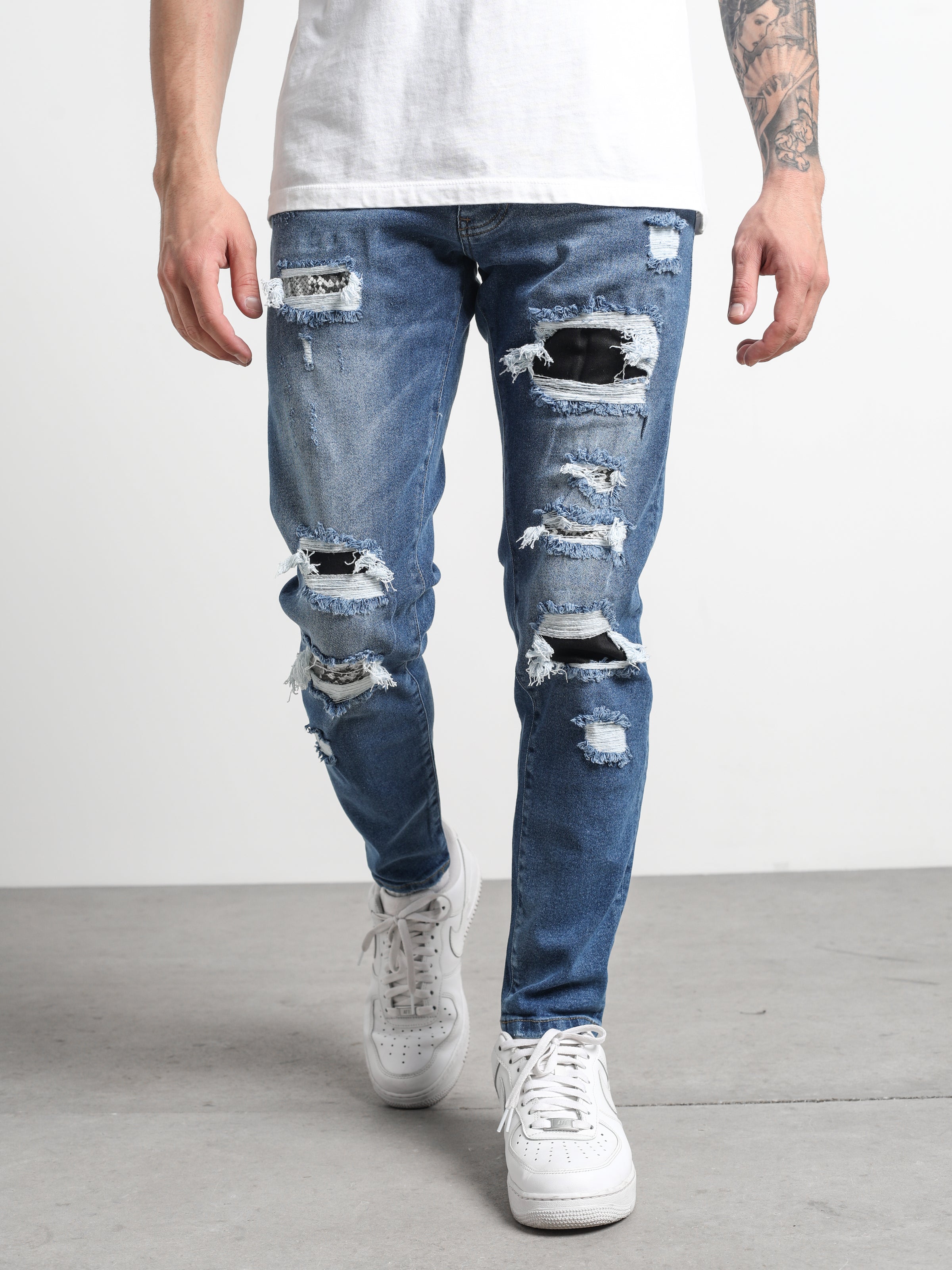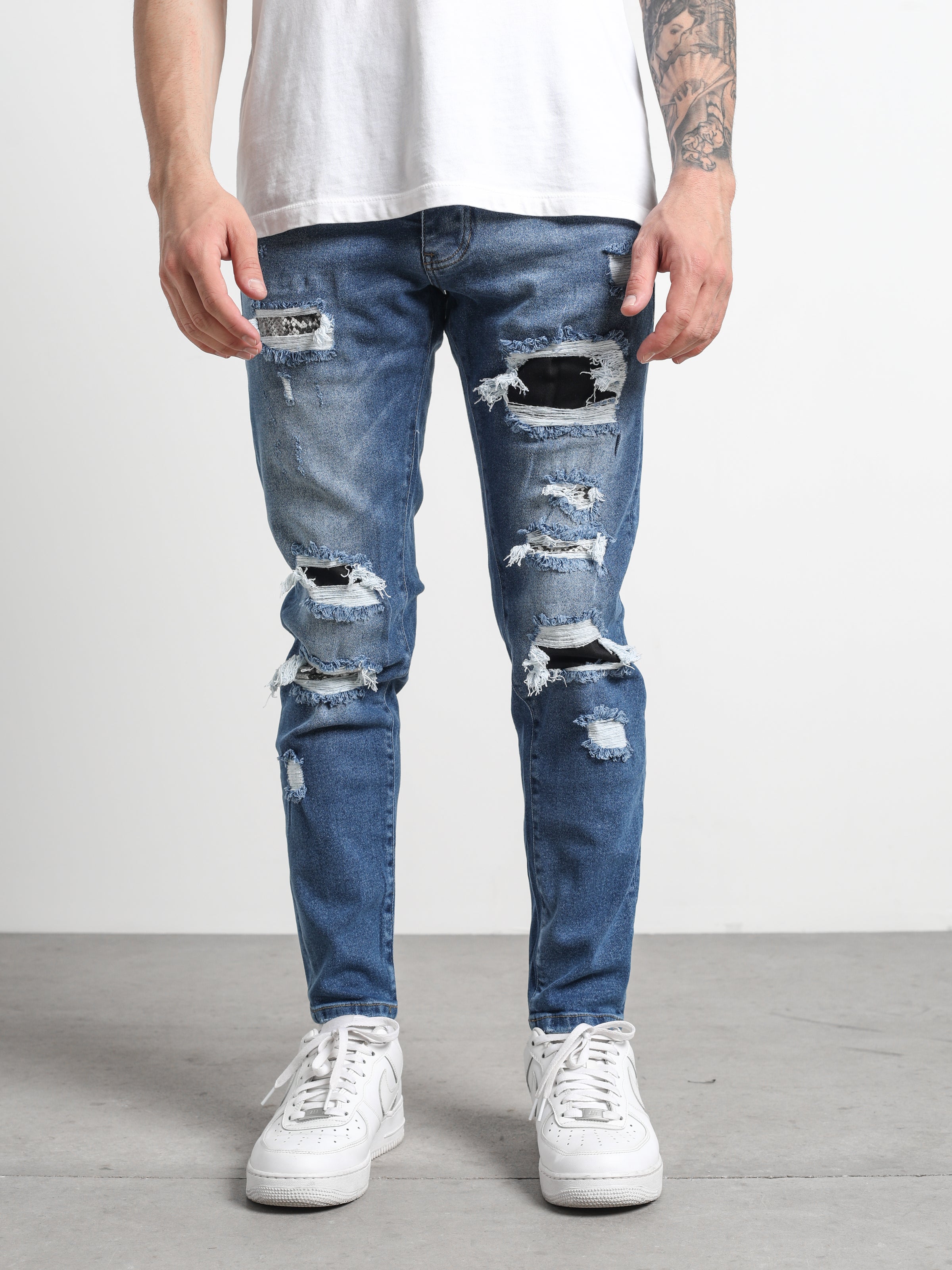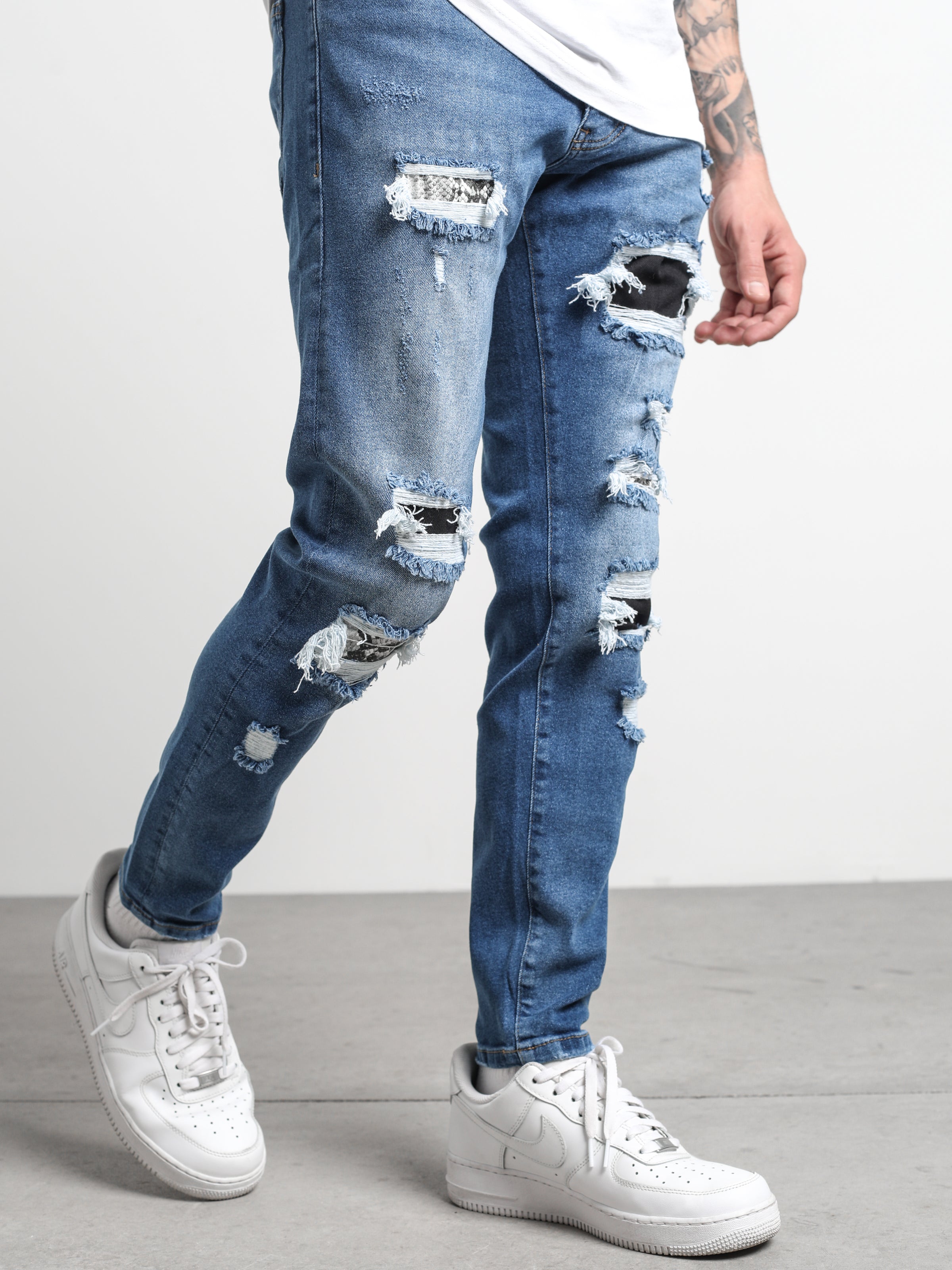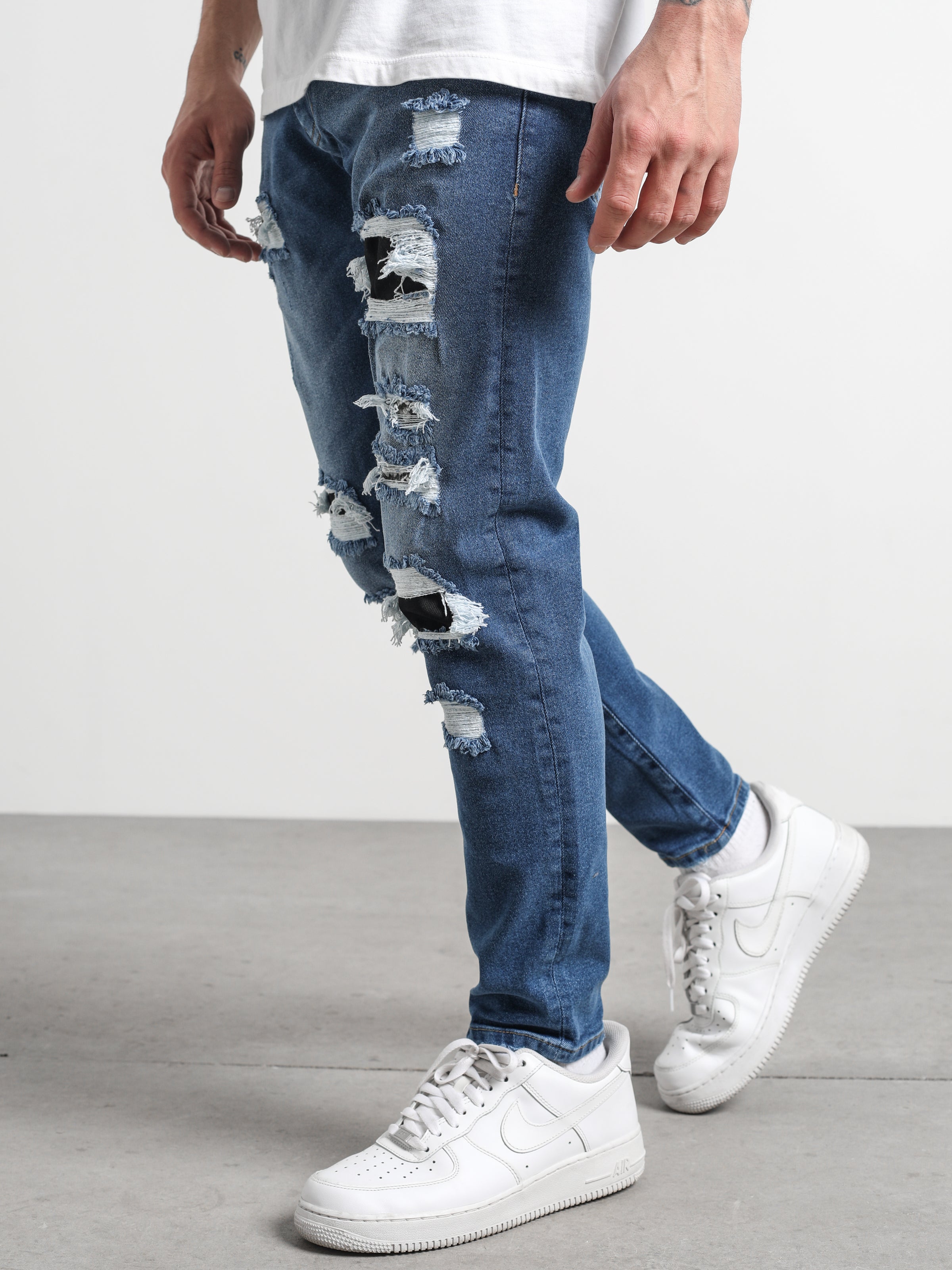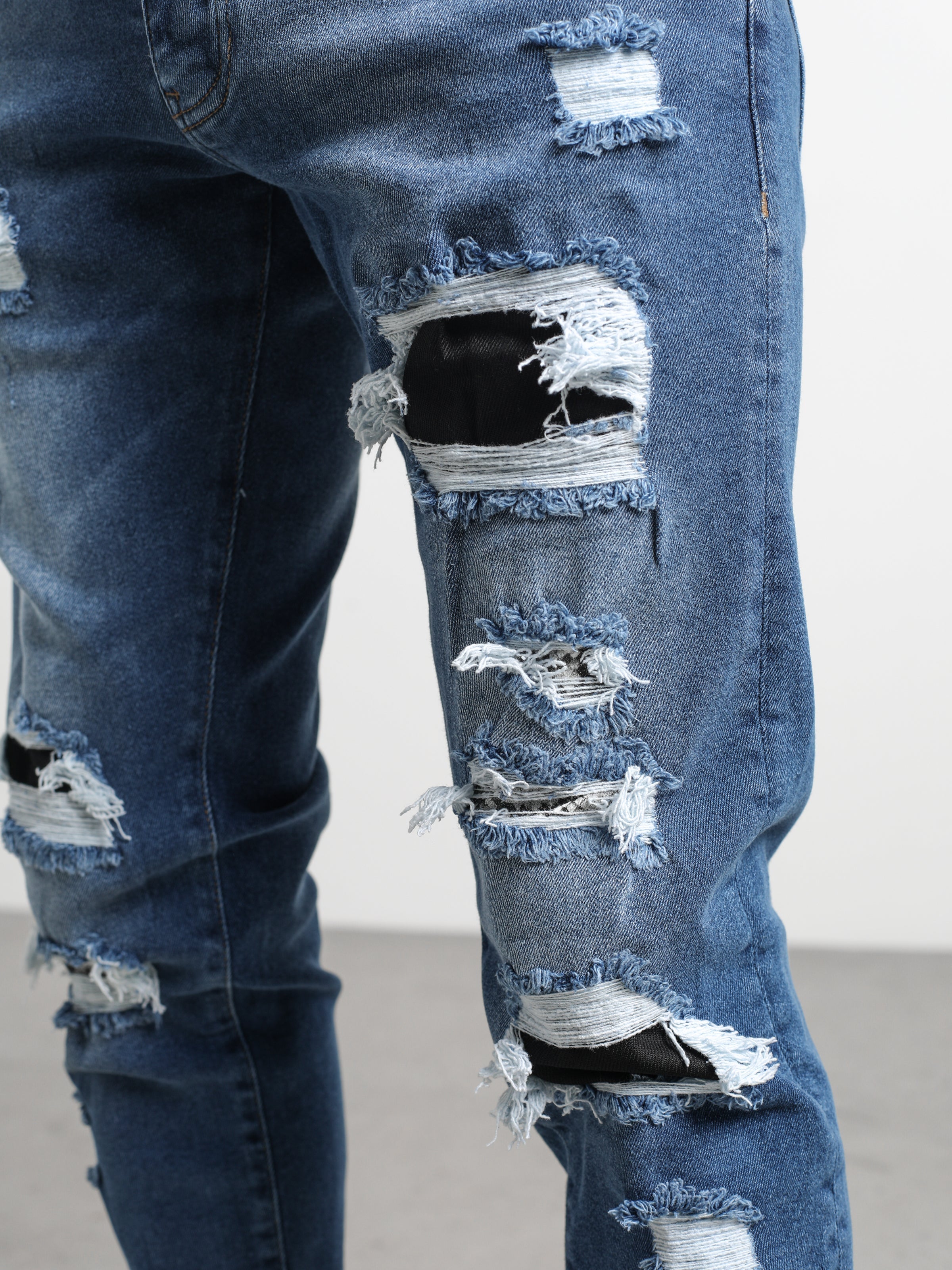Ripped and Repaired Denim Jeans are made from stretchy fabric that gives them flexibility, and it is a slim-fit cut pants.