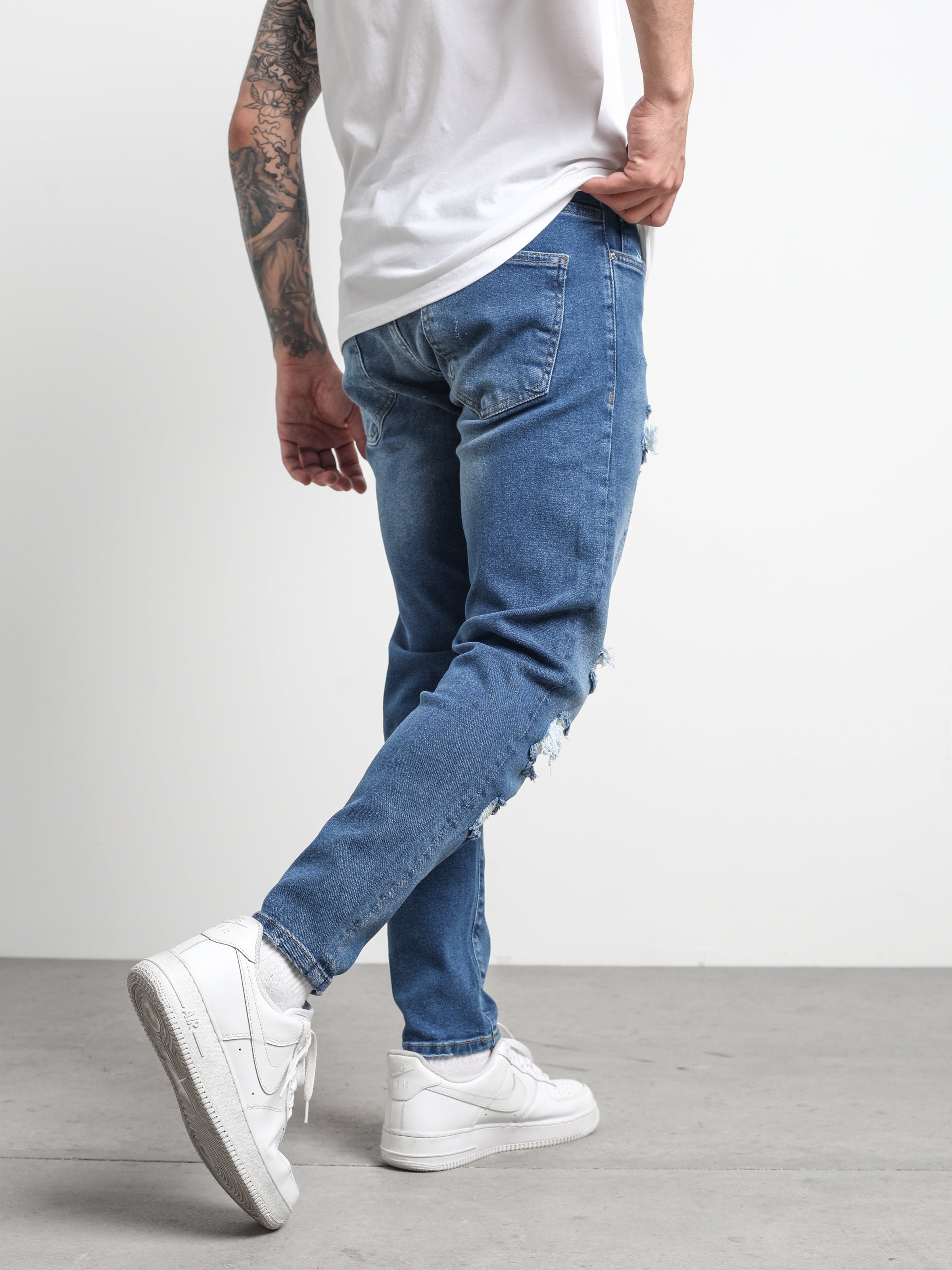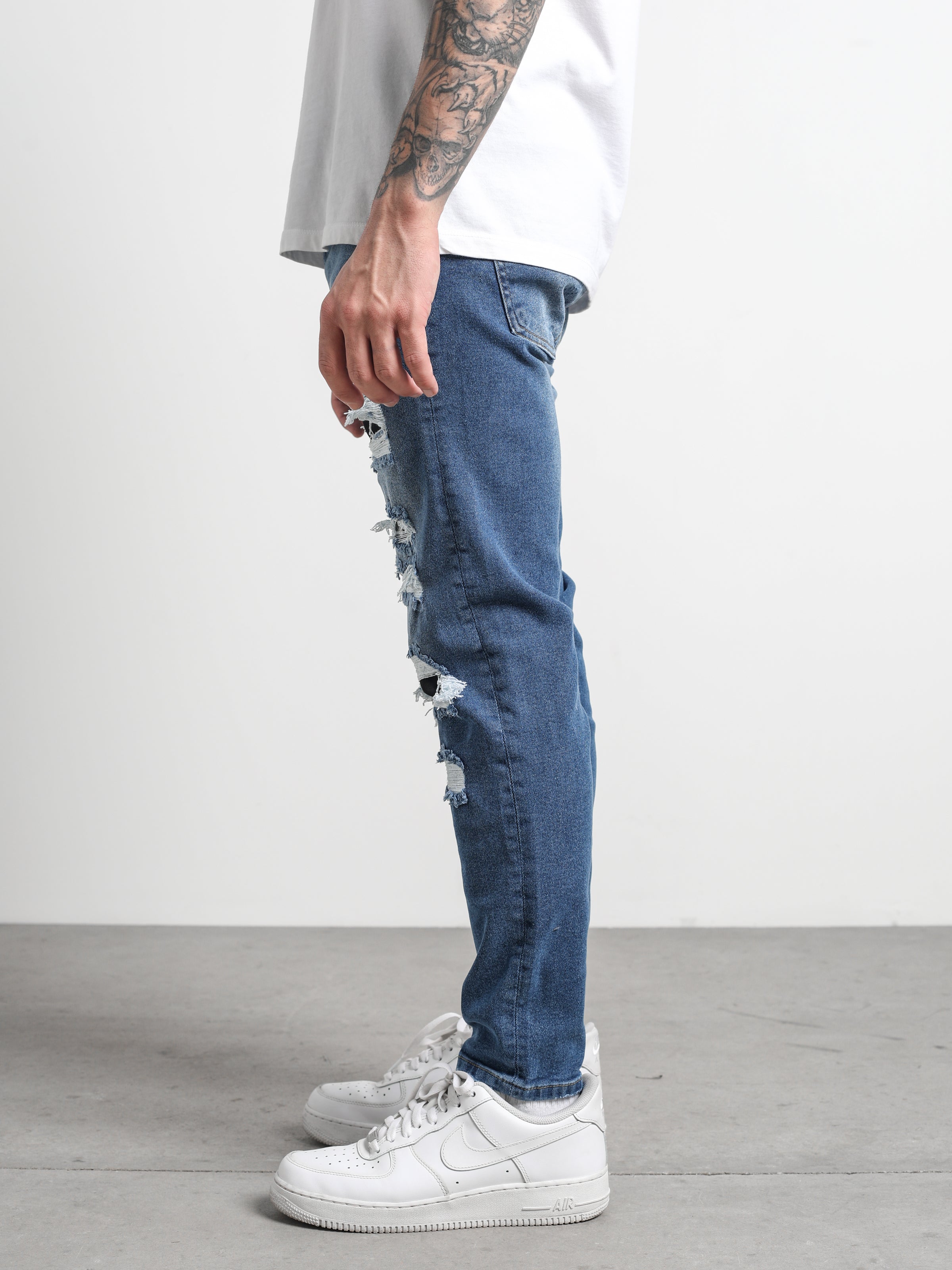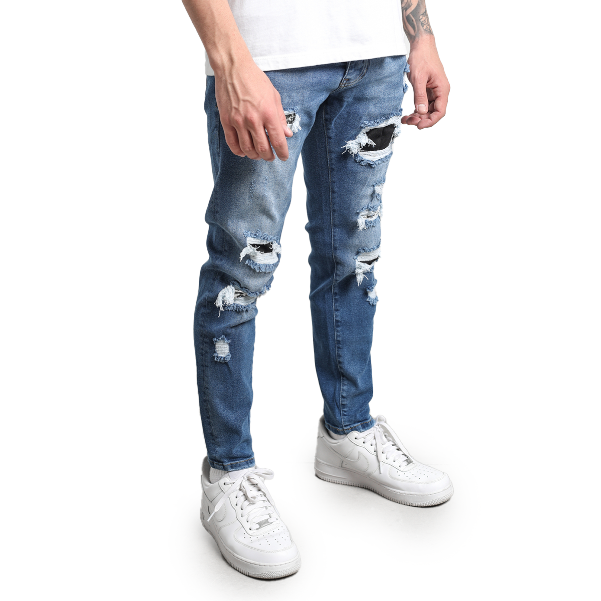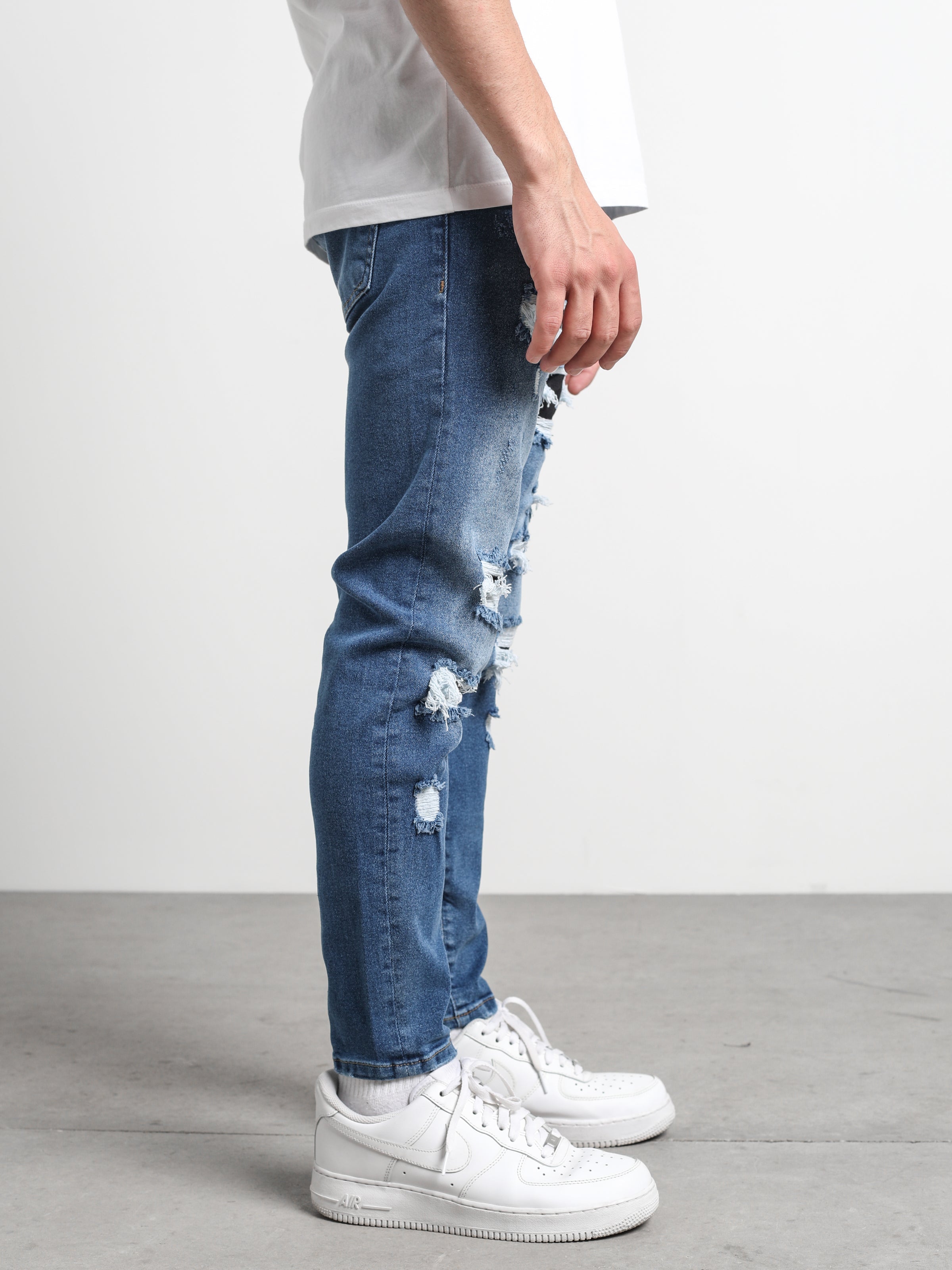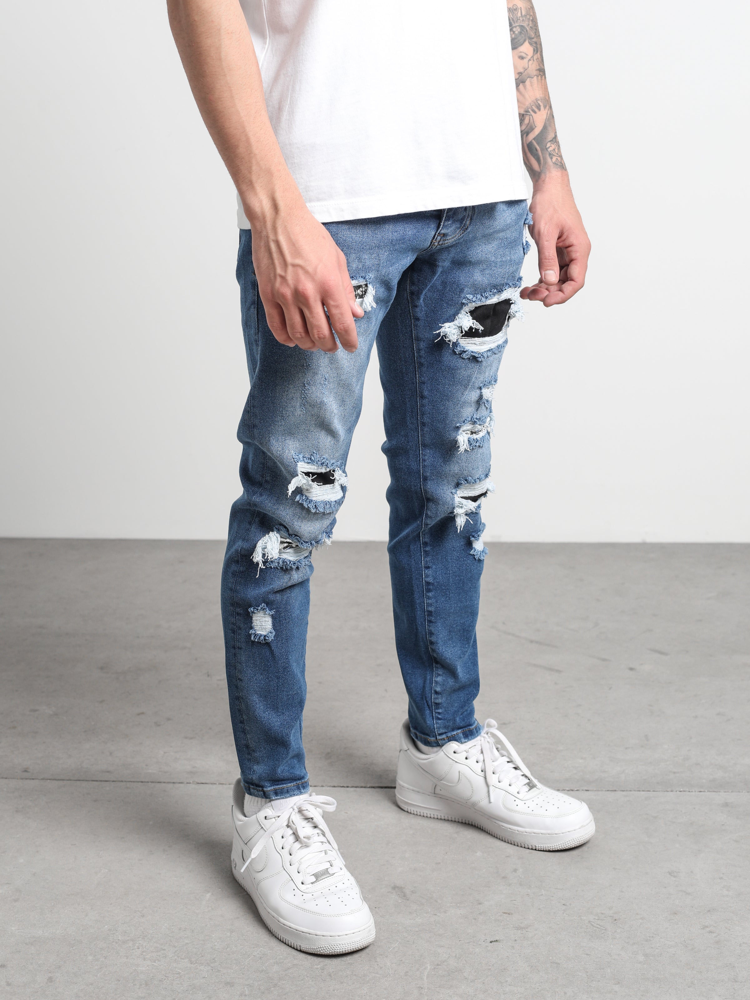 Ripped and Repaired Denim Jeans are made from stretchy fabric that gives them flexibility, and it is a slim-fit cut pants.