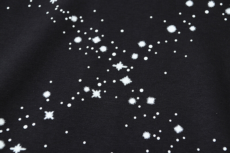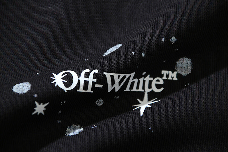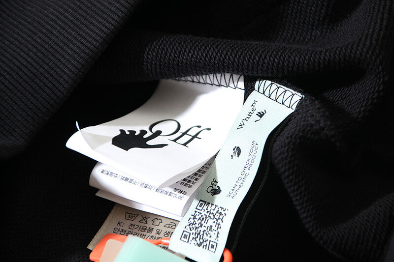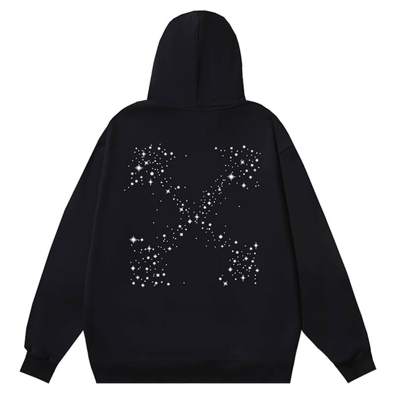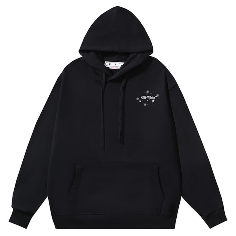 Black hoodie featuring white Off-White logo and bling star details at front. Kangaroo pocket. Tonal laces. Elasticized cuffs end hem. Bling stars arrows detail at back