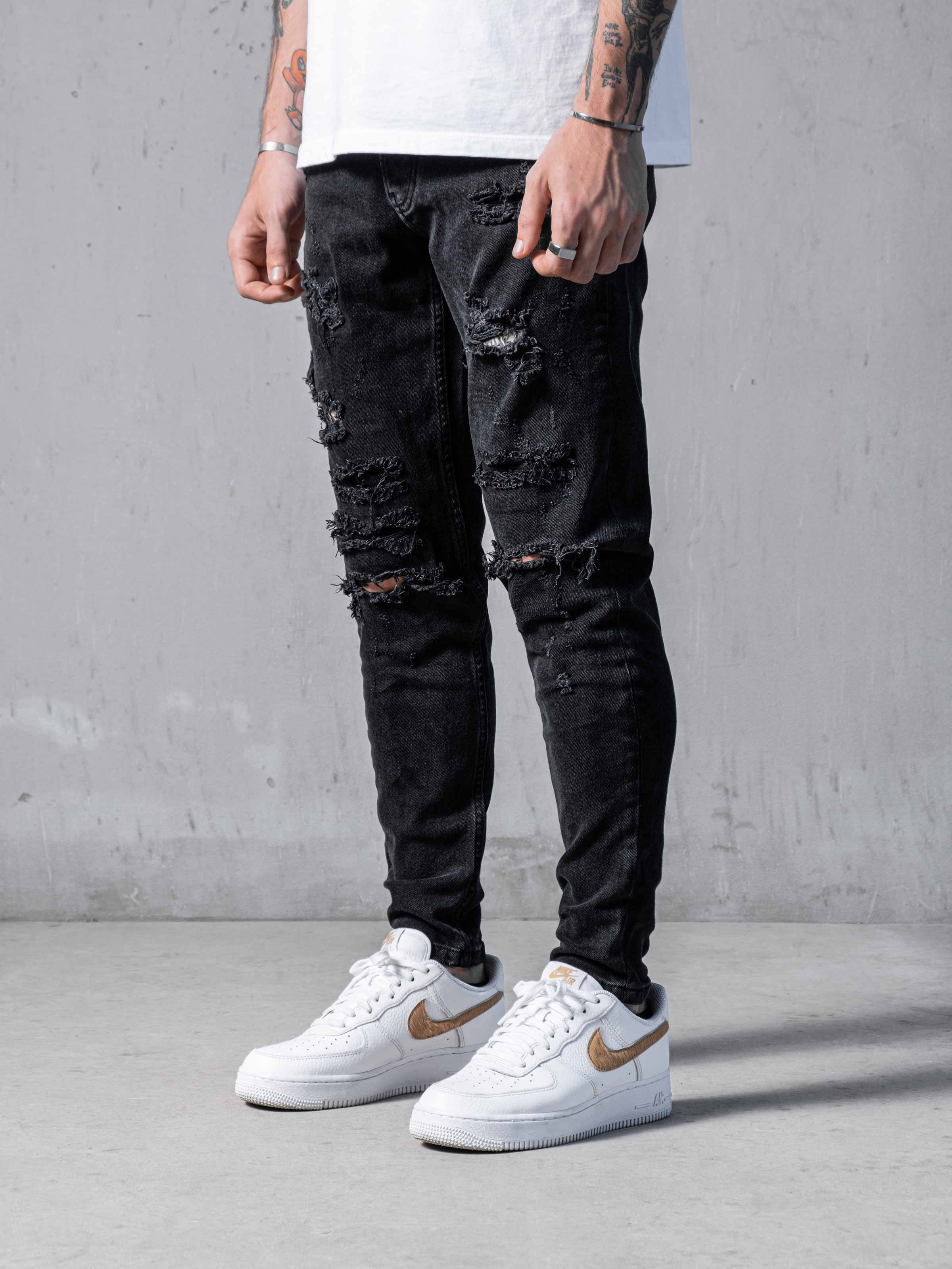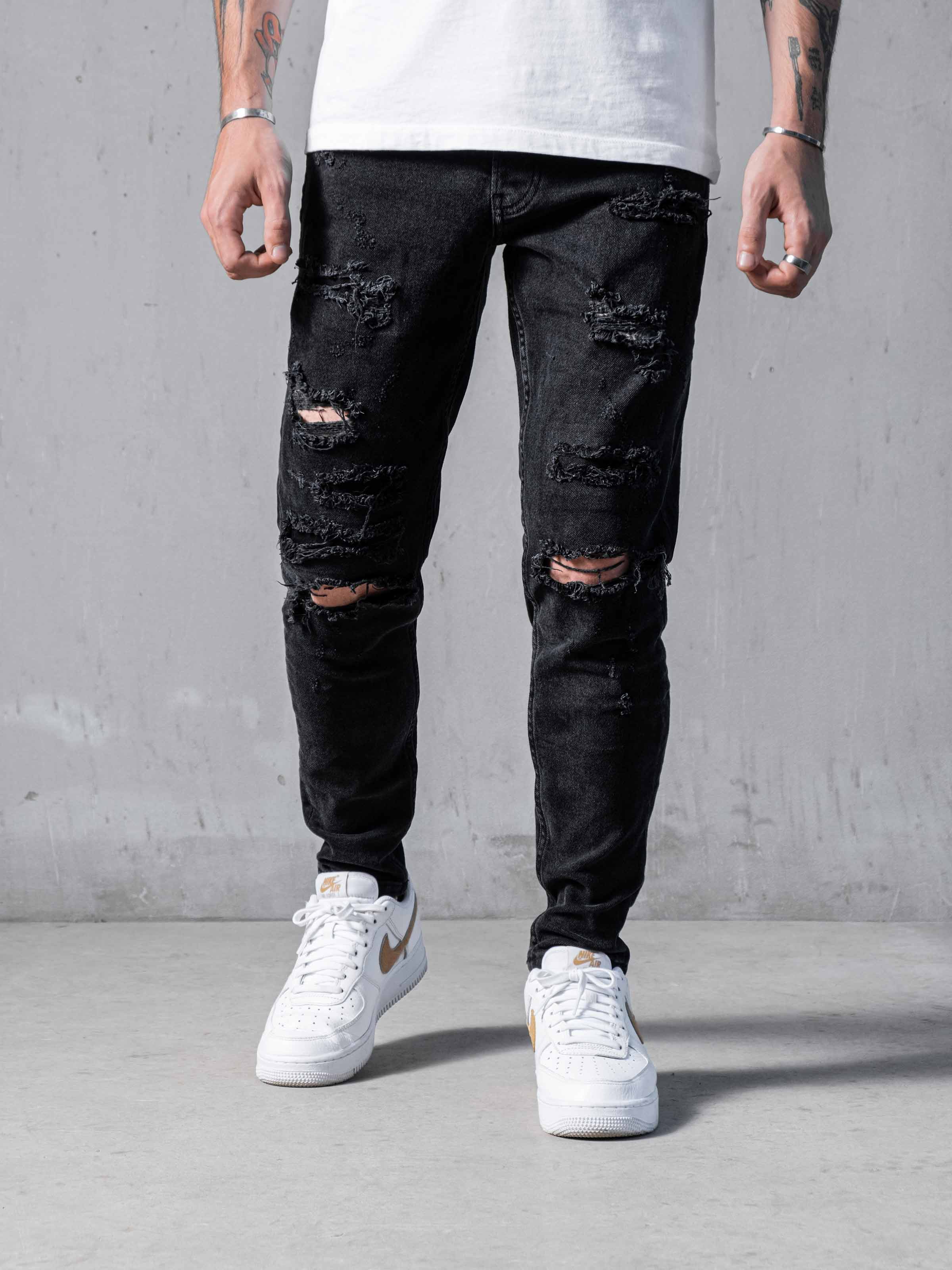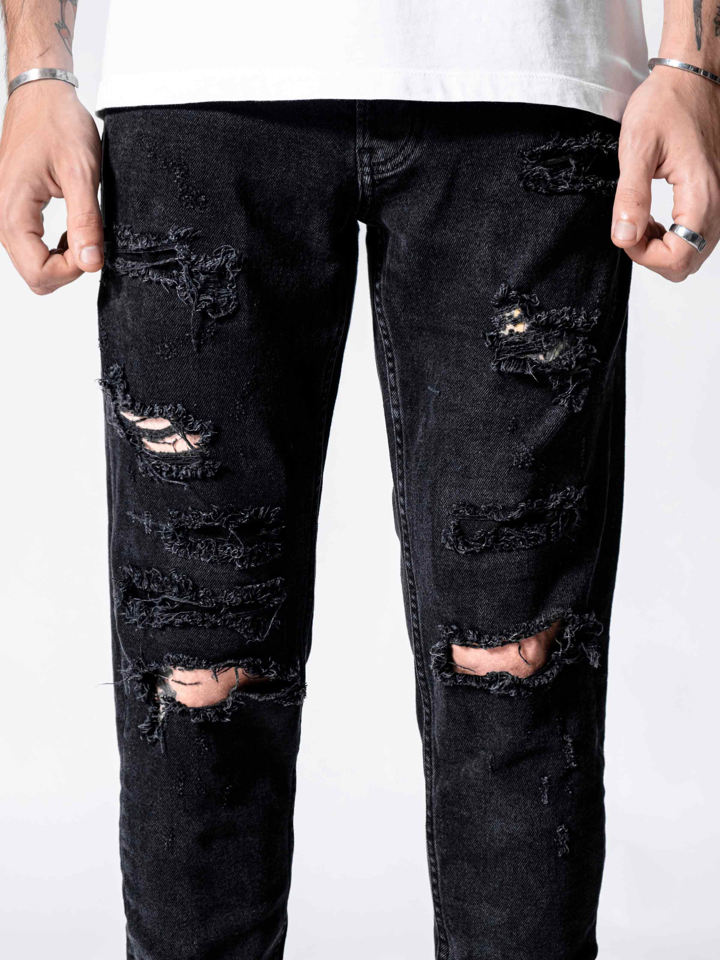 Random Black Jeans made from high-quality stretchy denim fabric. It is a skinny fit and it gets skinnier through to ankles. There are random rips and distresses on the front.