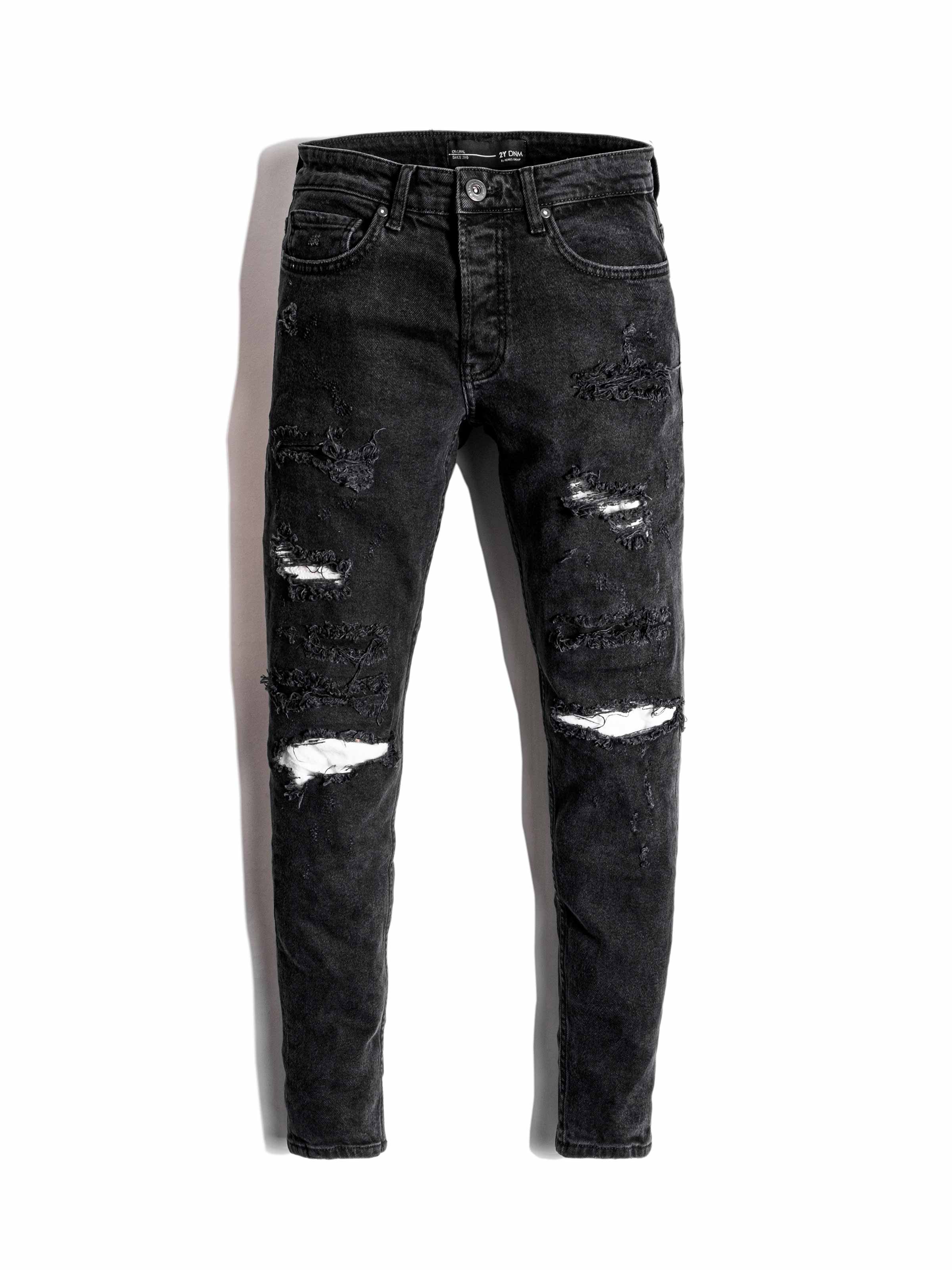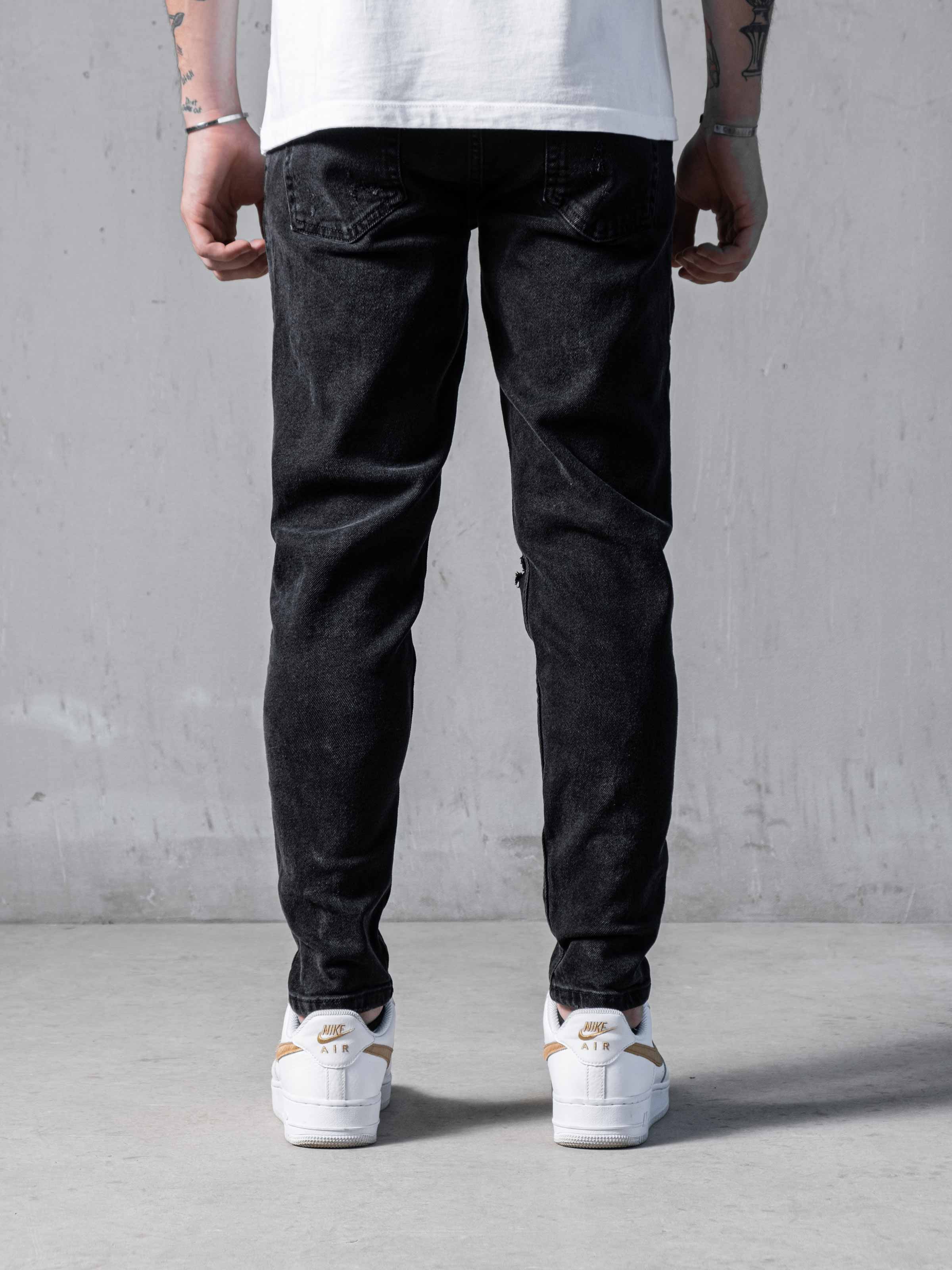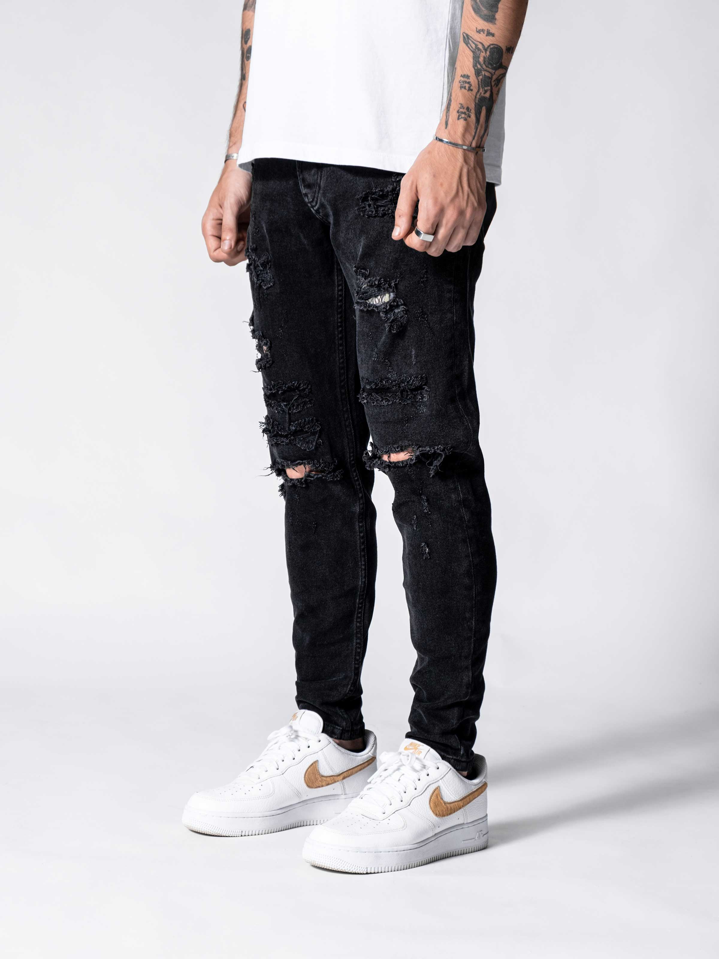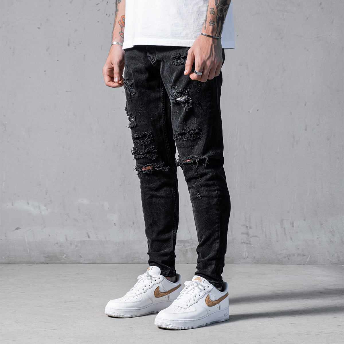 Random Black Jeans made from high-quality stretchy denim fabric. It is a skinny fit and it gets skinnier through to ankles. There are random rips and distresses on the front.