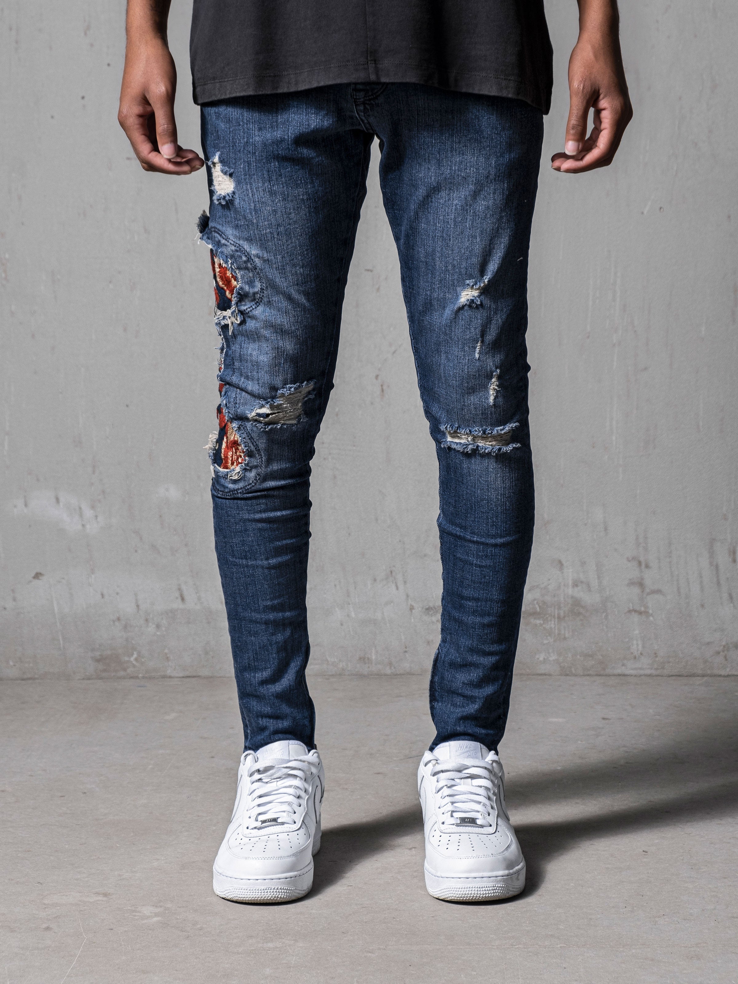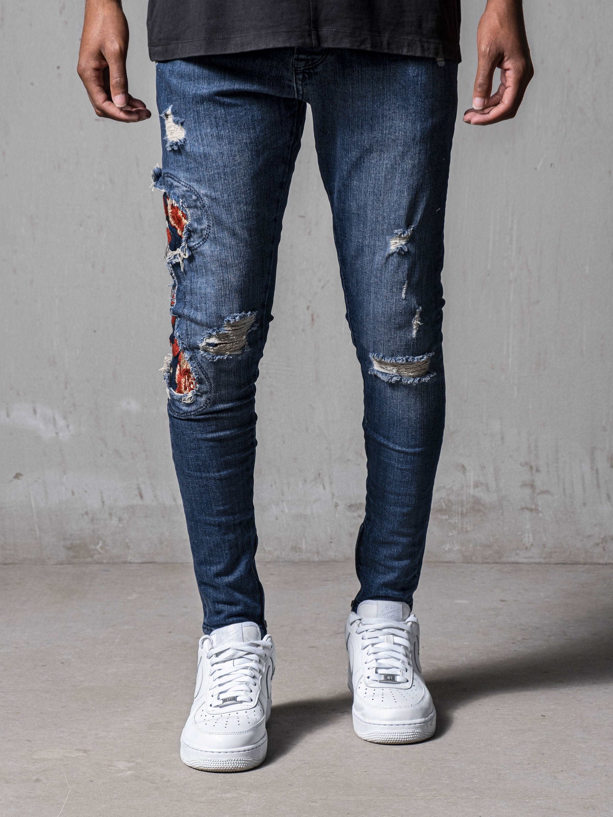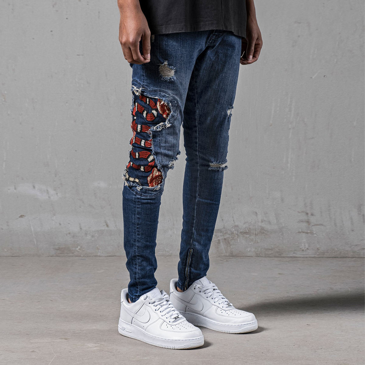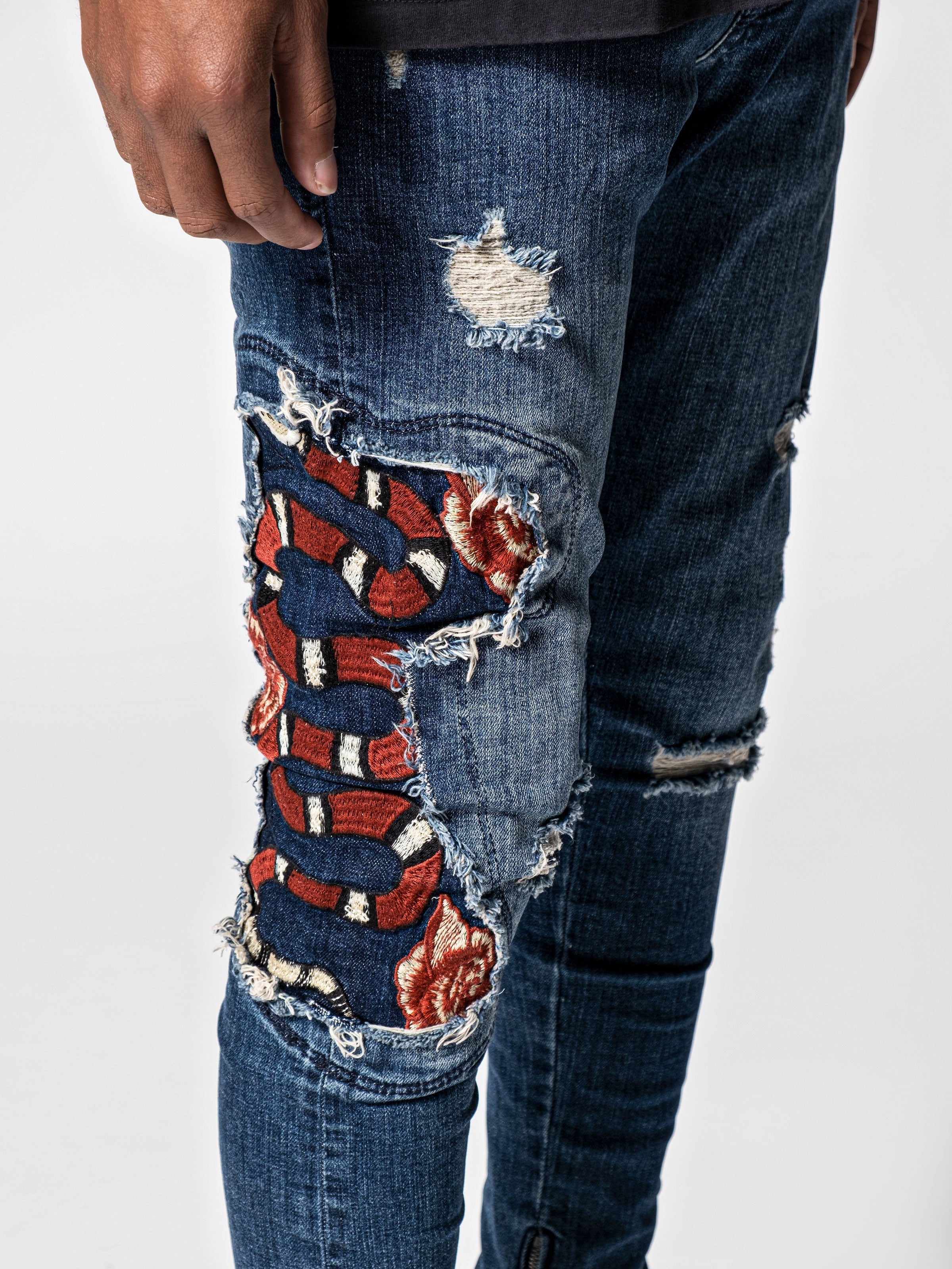 Red Snake Jeans are made from stretchy denim fabric and it has snake embroidered on the right leg. Stonewashed and distressed jeans