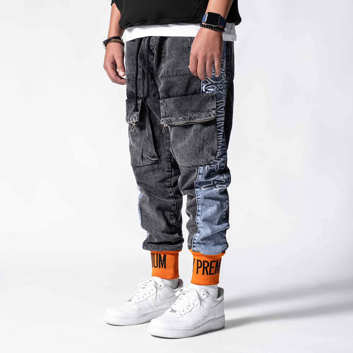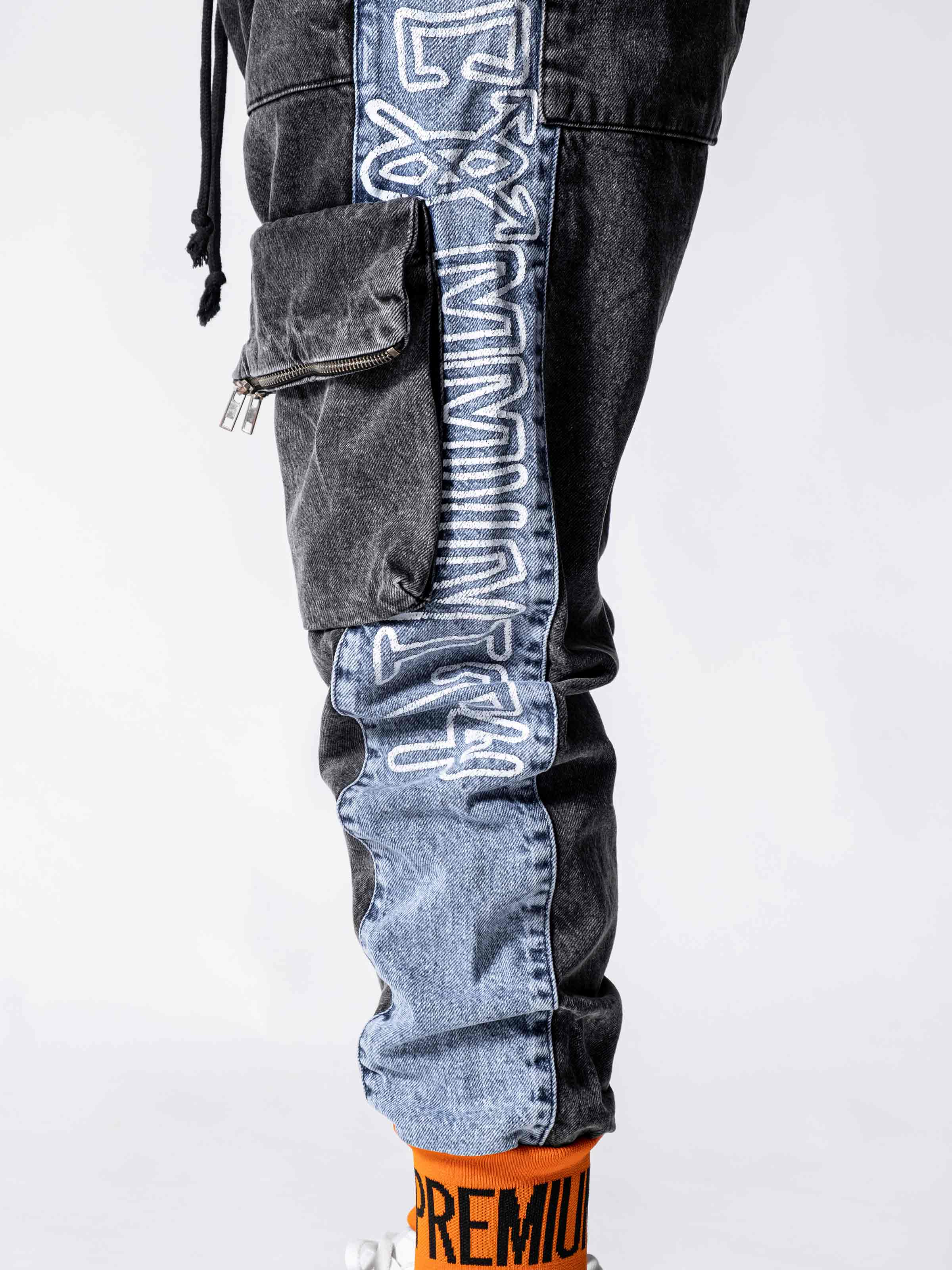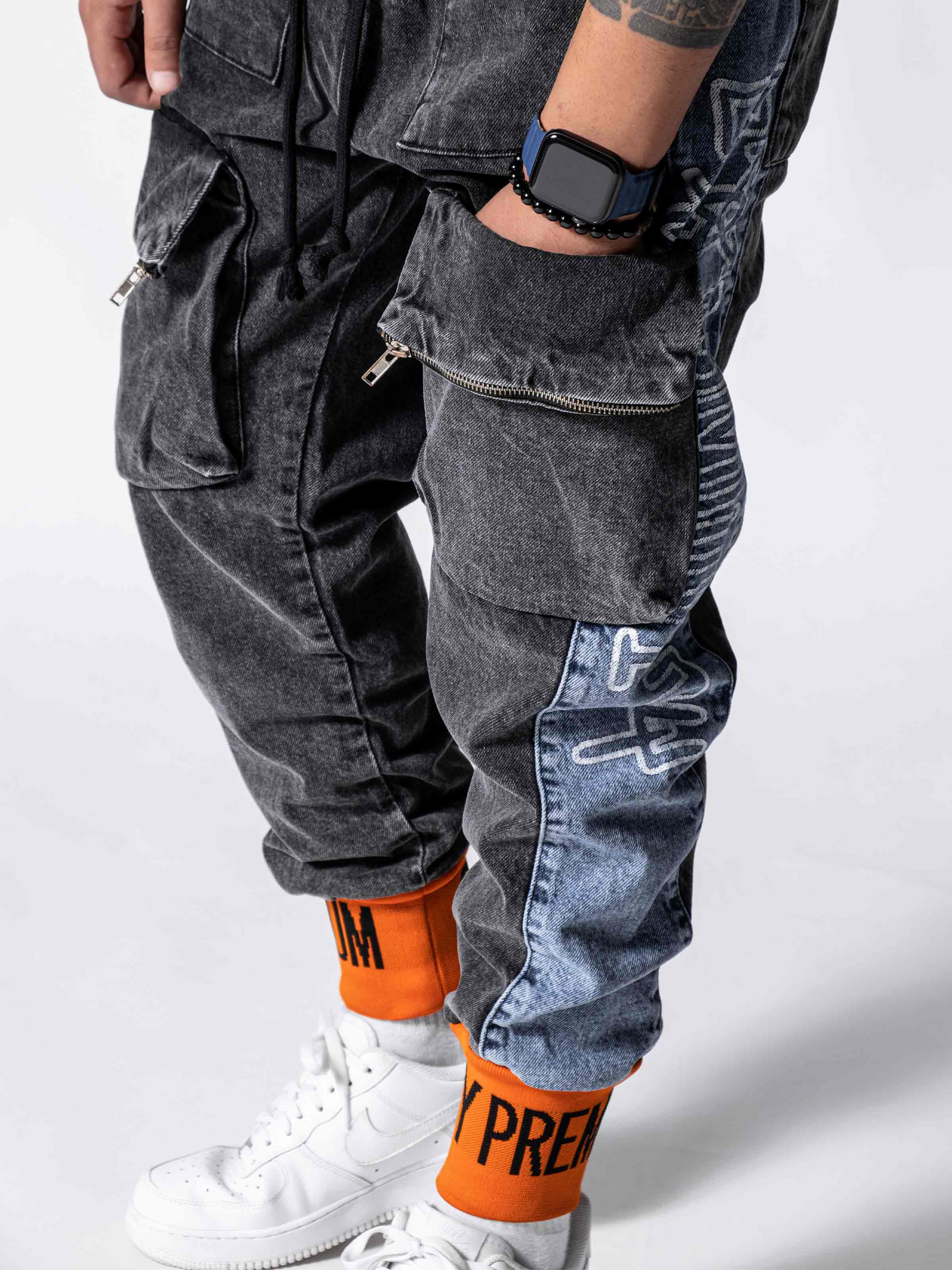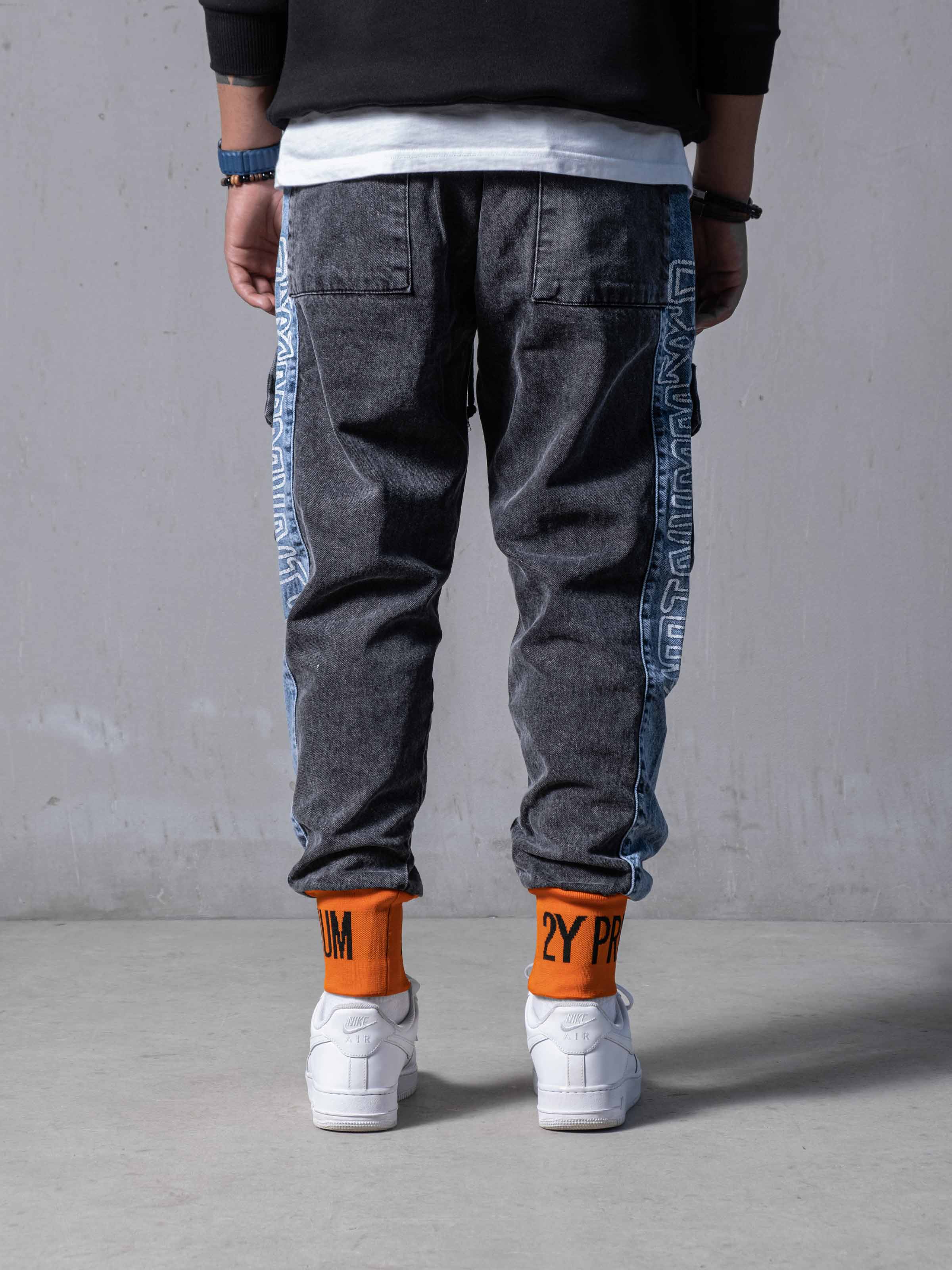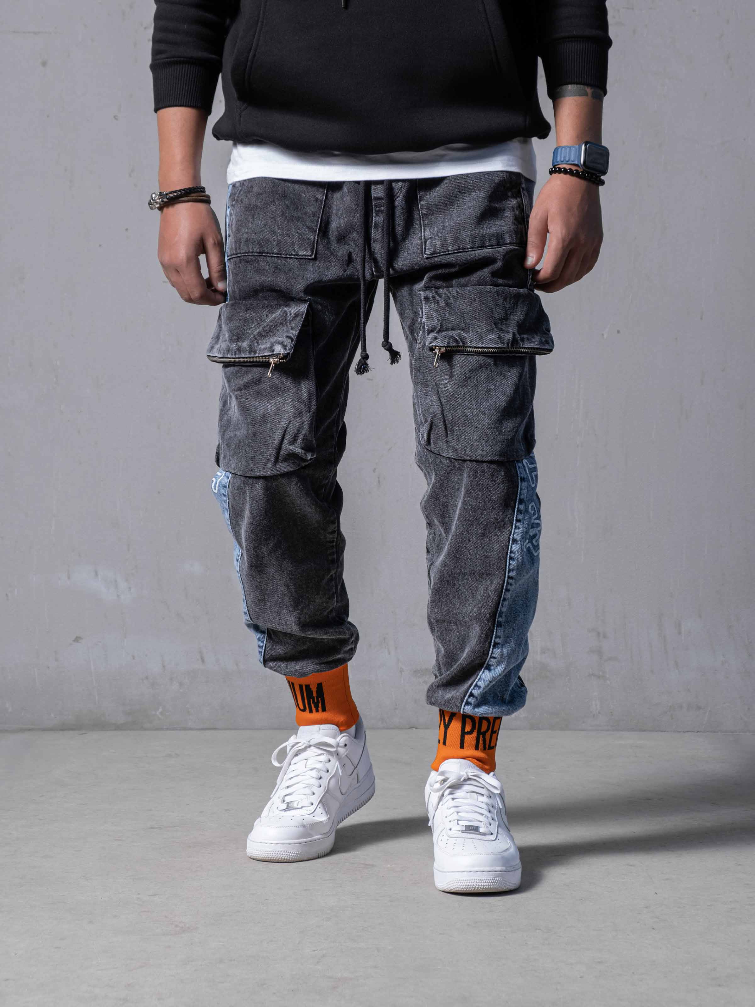 Shibuya Grey Cargo Pants are made from washed grey and blue denim jeans fabric. They have a loose fit and big pockets on the front and back. It has elasticized waist with a waistband.