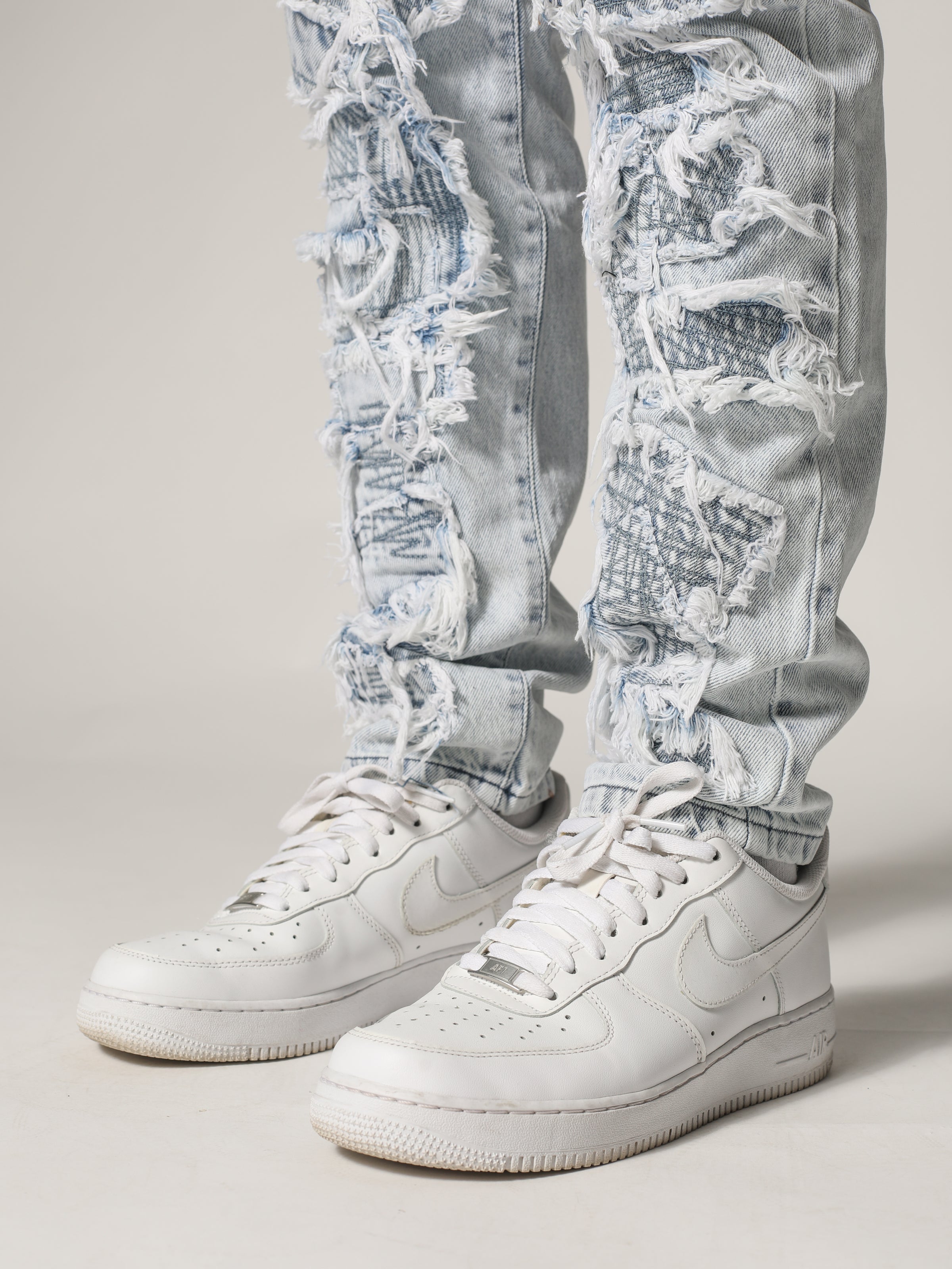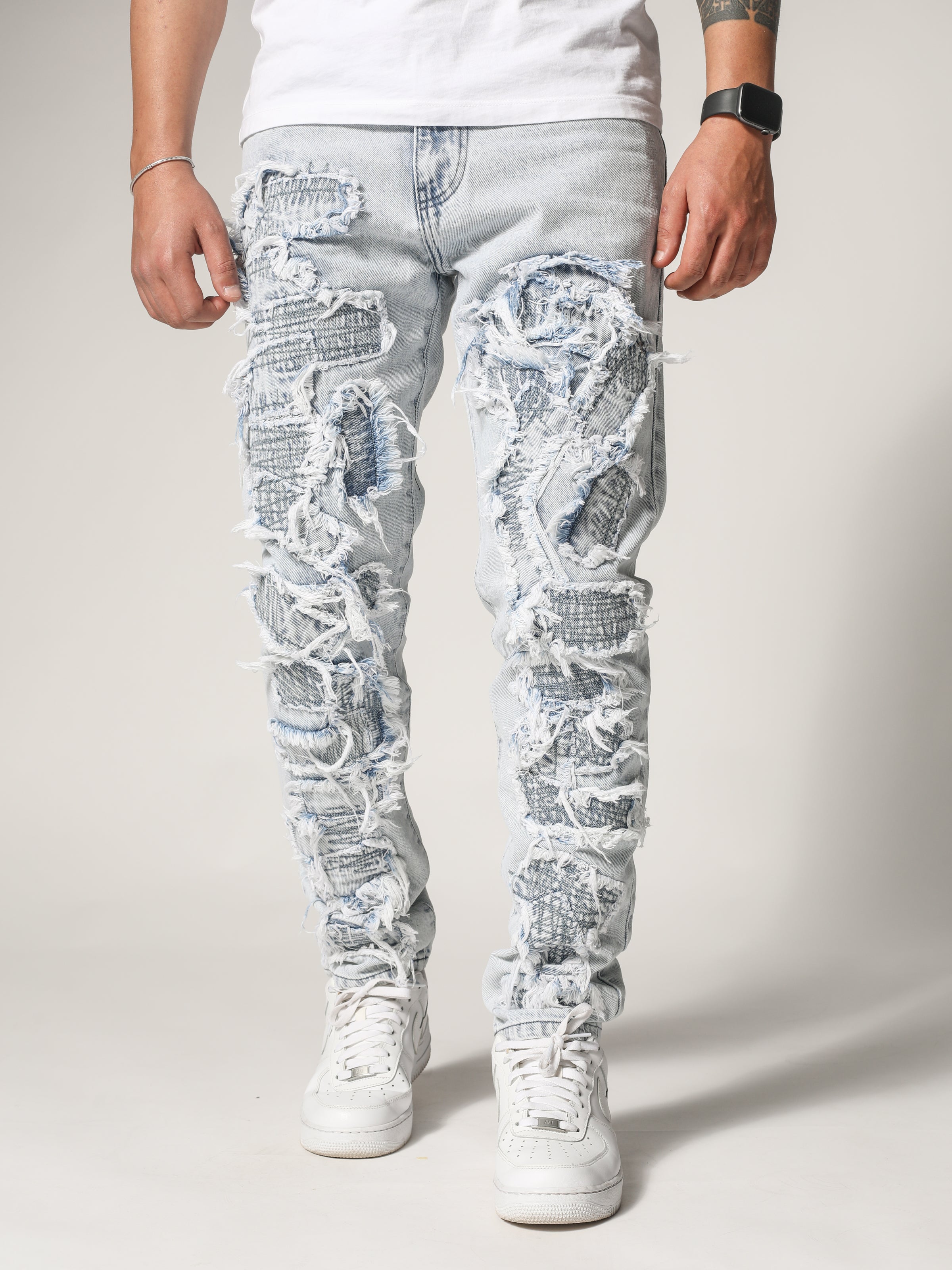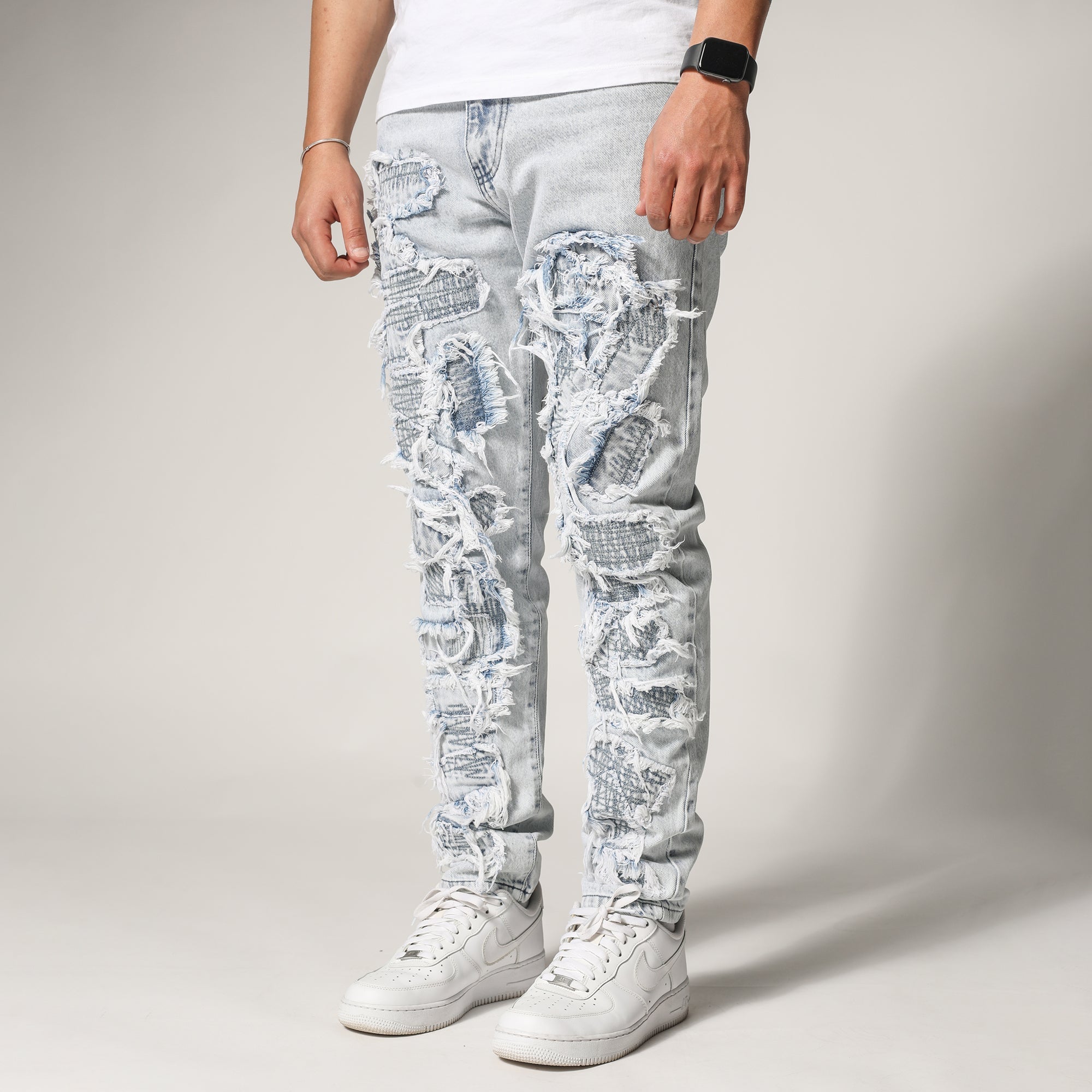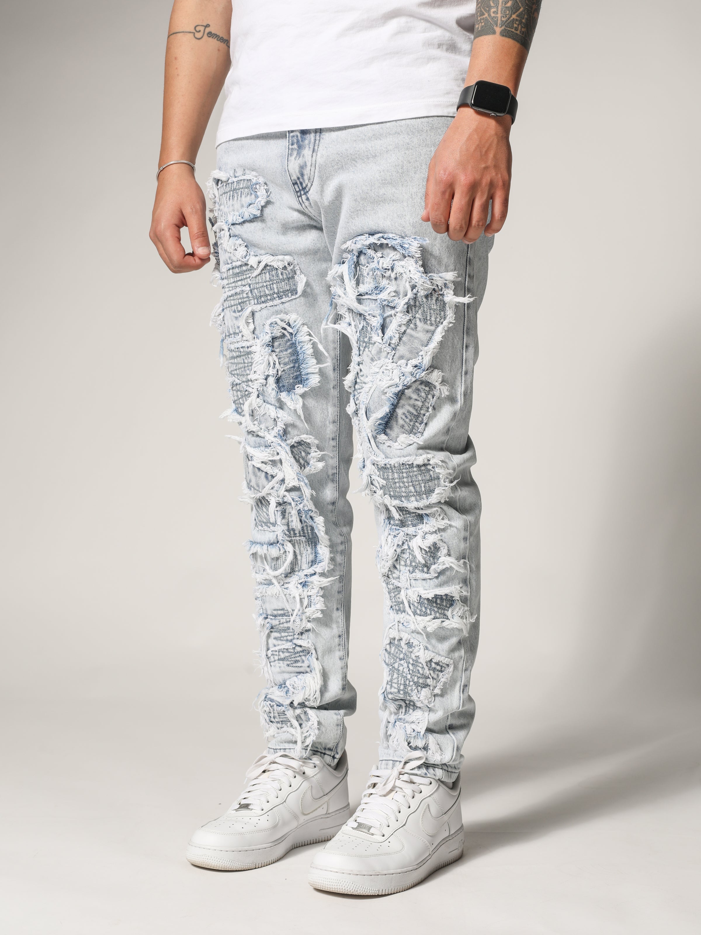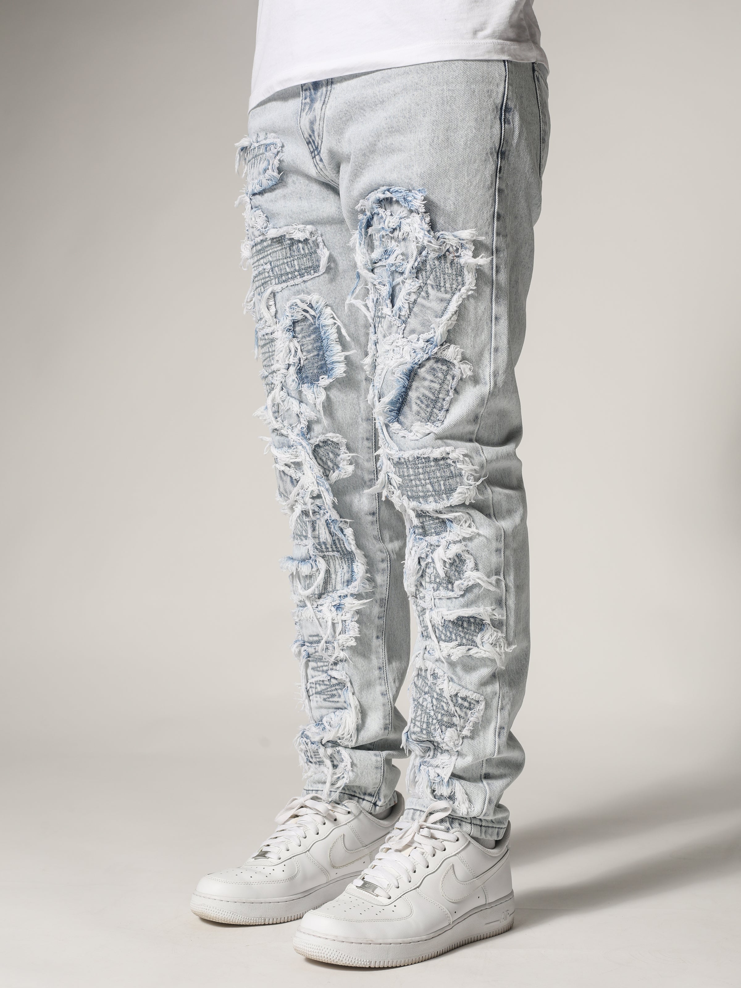 Light Blue Slim-Fit Denim Jeans with a lot of patches. Patches have stitch details on them. It is made from stretchy washed denim fabric.