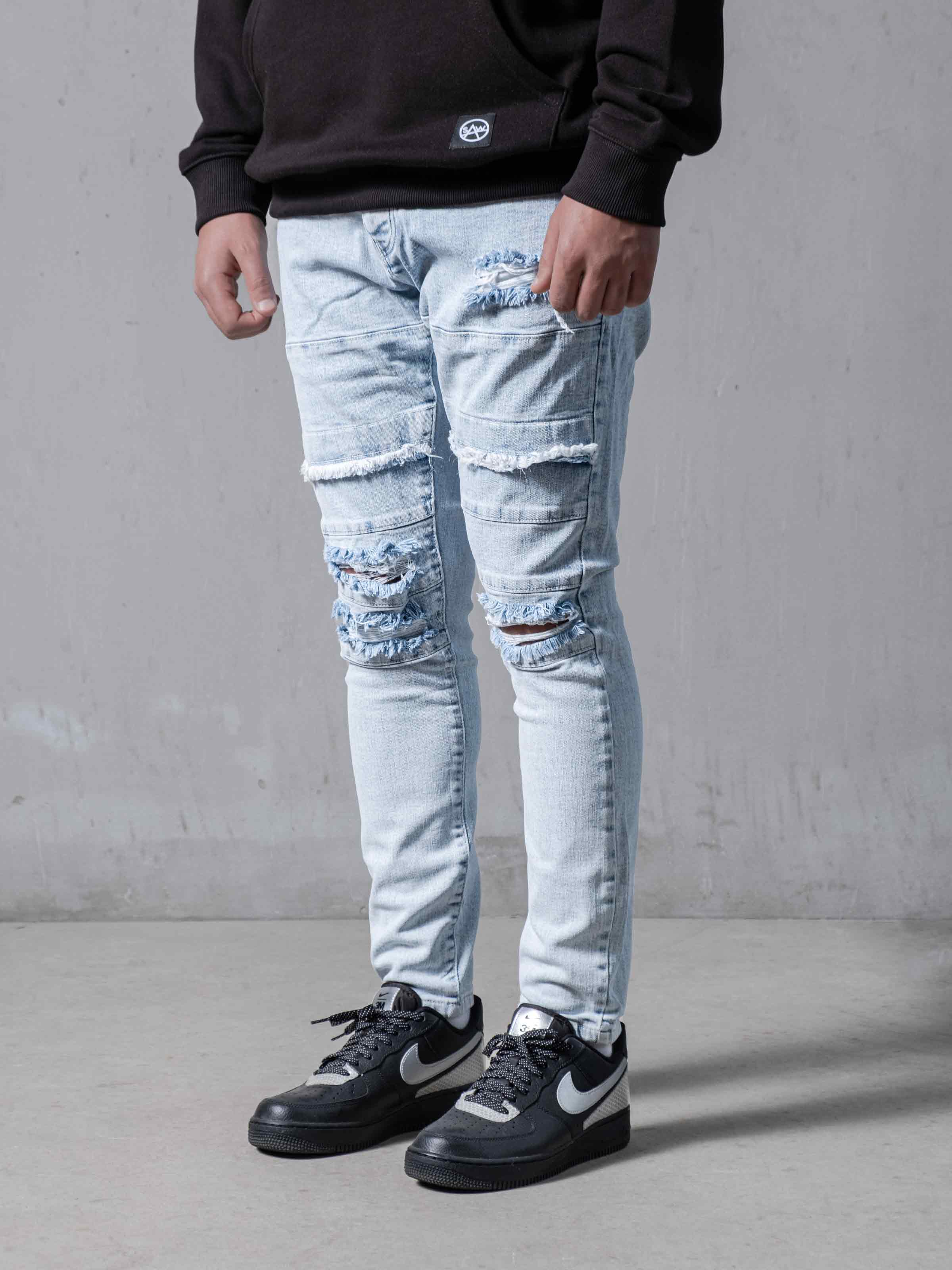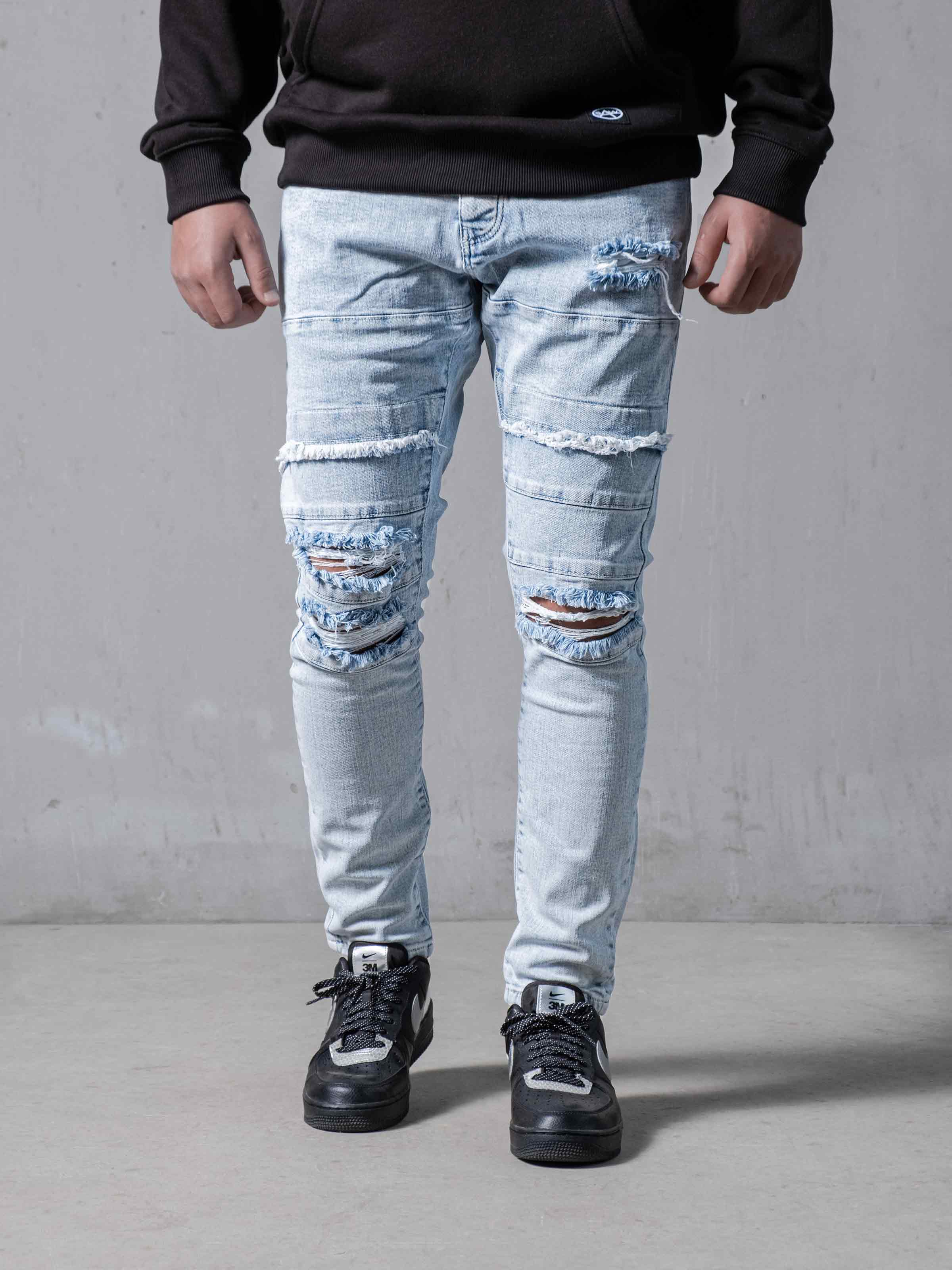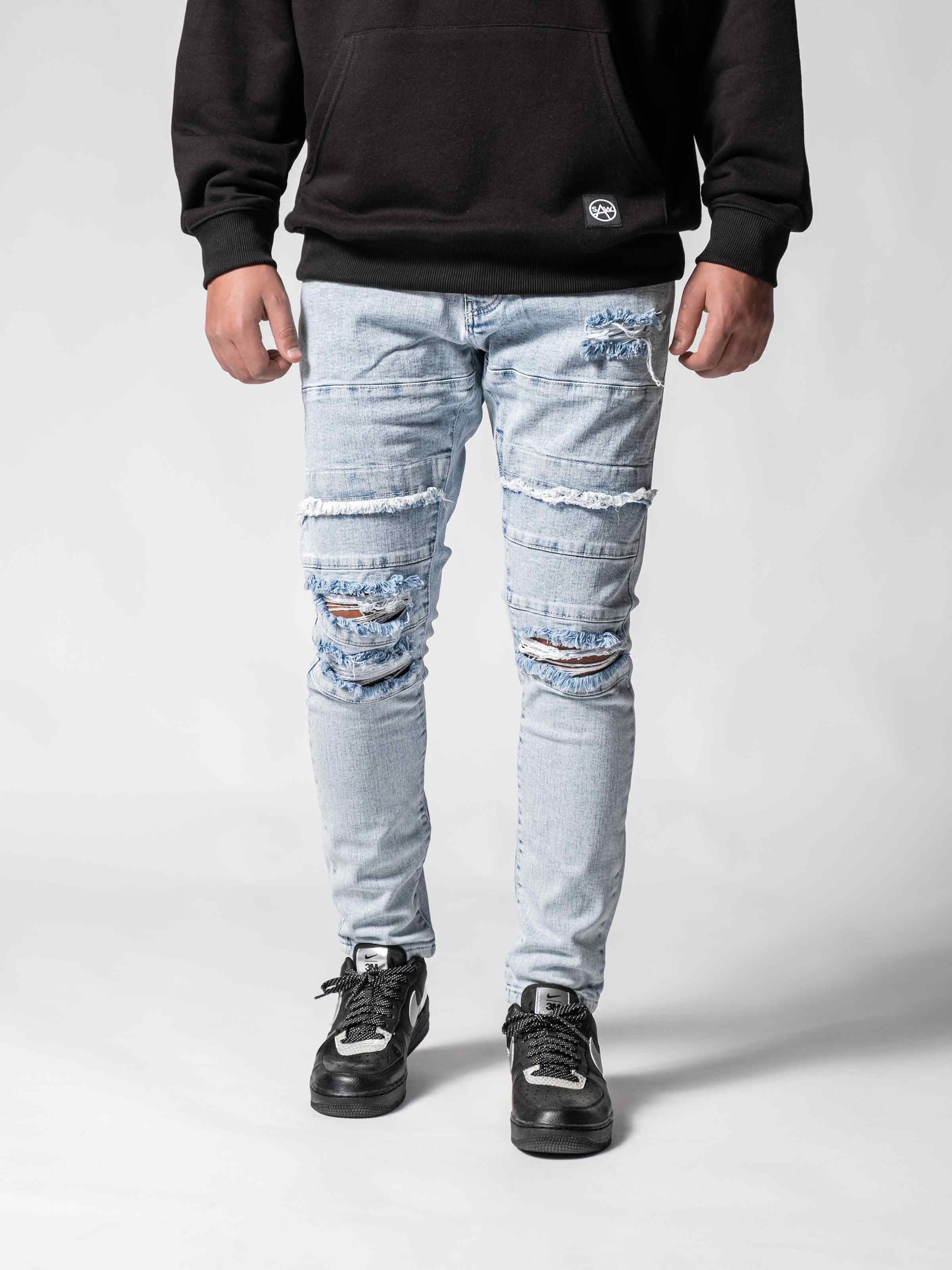 Blue Stone hard Jeans is made from blue high-quality stonewashed stretchy denim fabric. It is a skinny fit and it gets skinnier through to leg openings. There are random rips & fringes on the front.