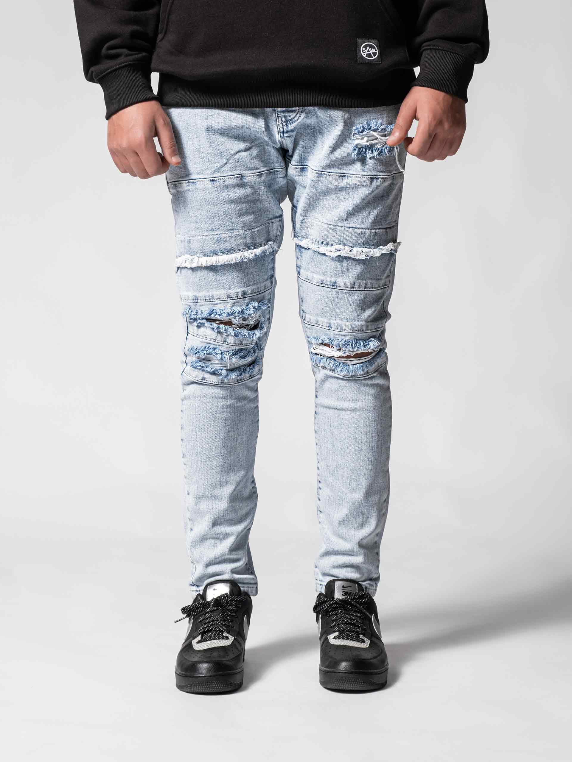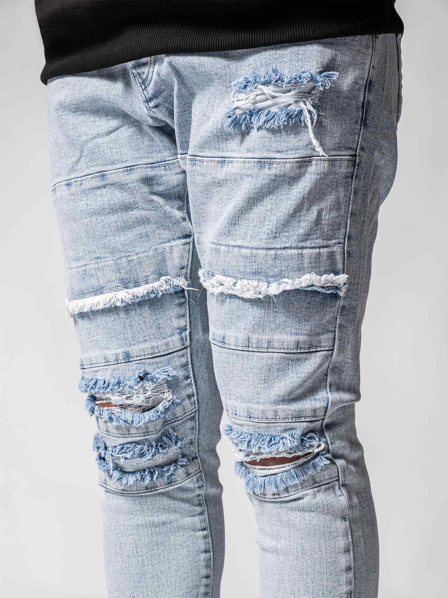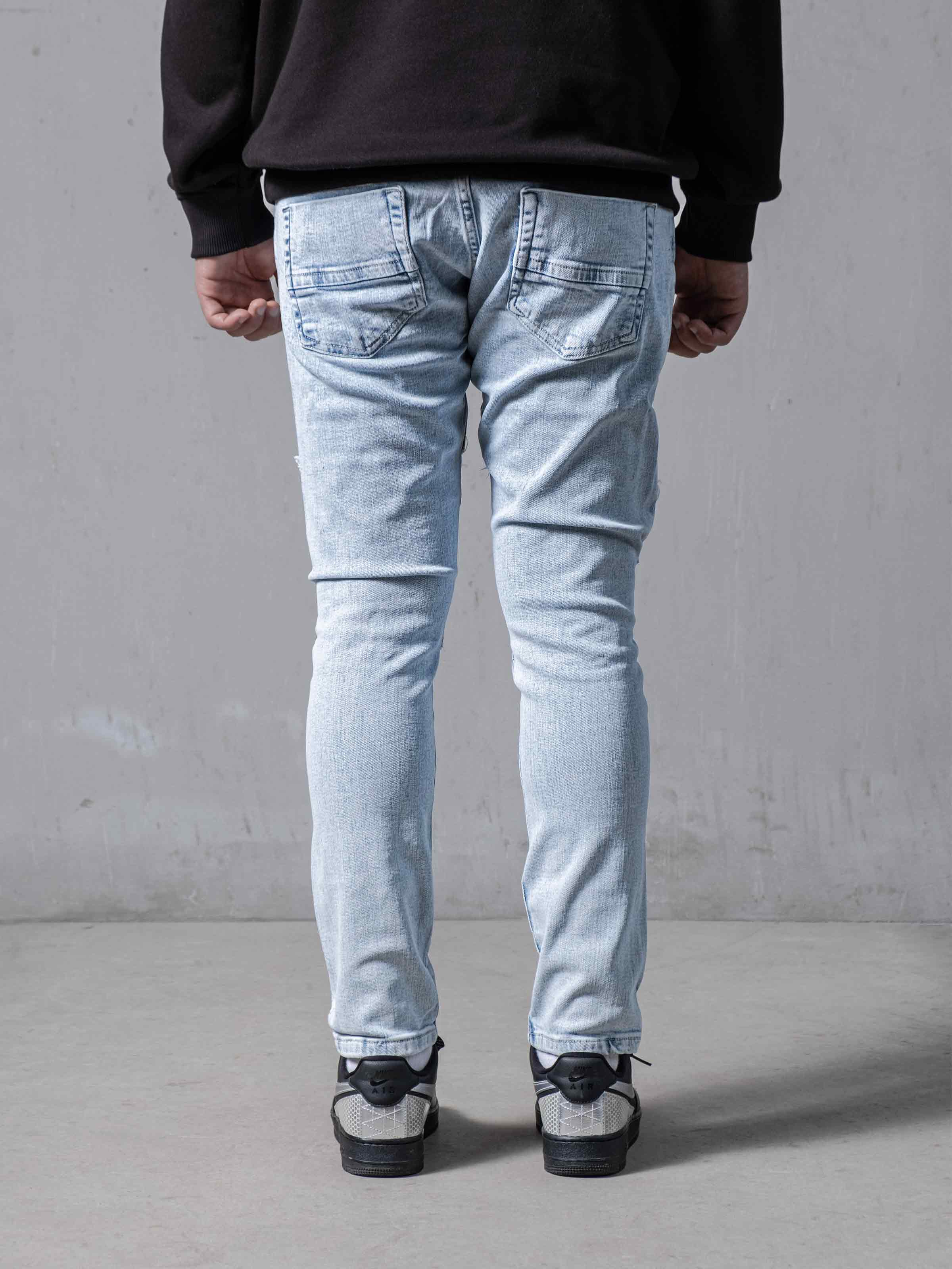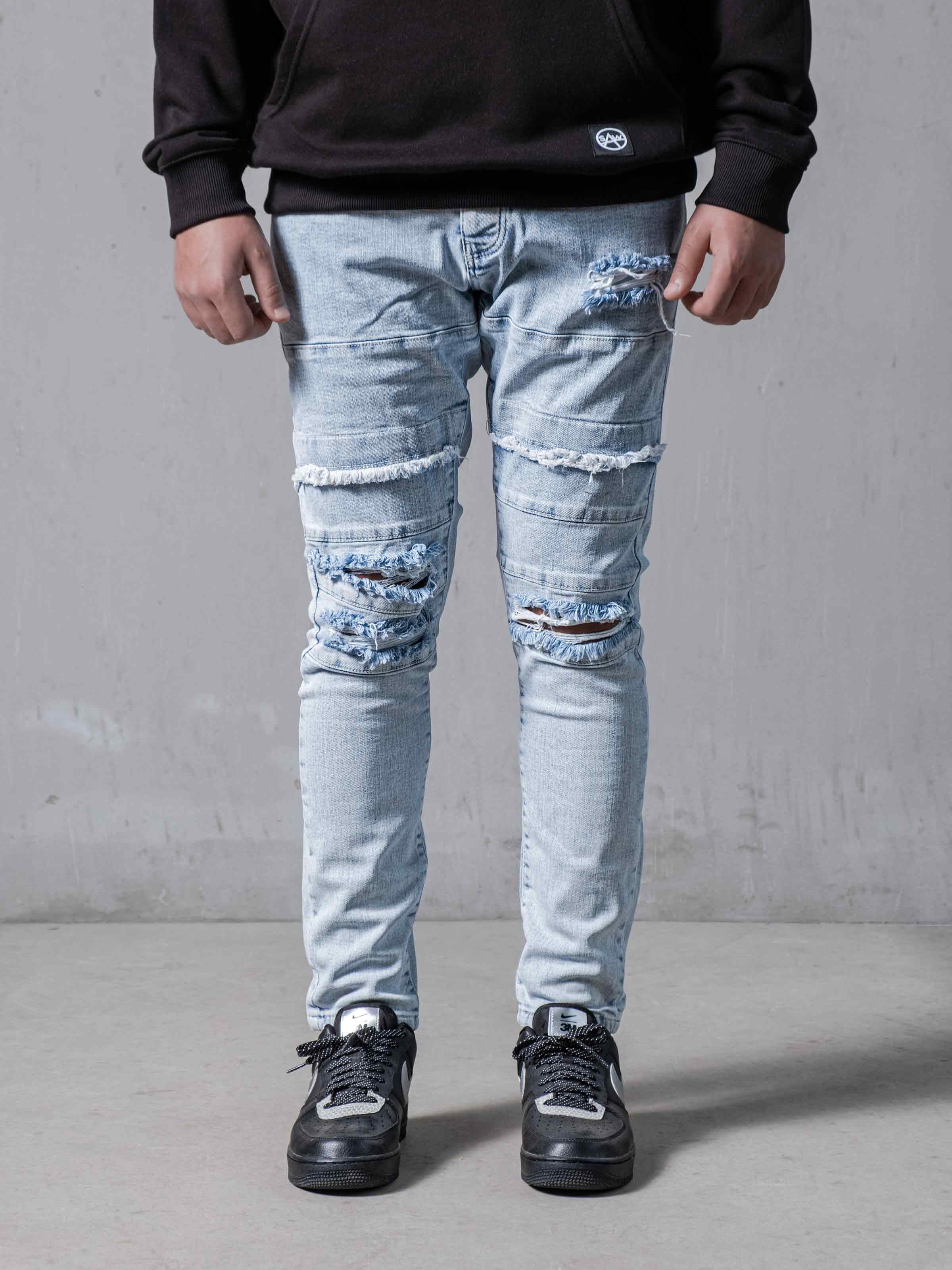Blue Stone hard Jeans is made from blue high-quality stonewashed stretchy denim fabric. It is a skinny fit and it gets skinnier through to leg openings. There are random rips & fringes on the front.