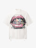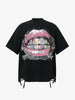 • Design Elements: Bold lip graphic print, distressed hem details, playful text overlay