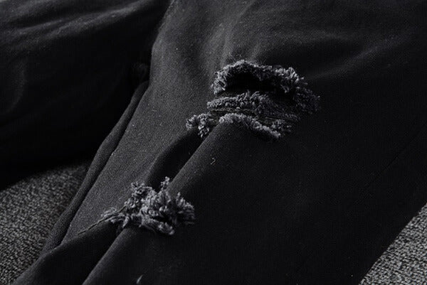 Stretch 12 oz denim jeans. Distressing and rips with denim underlay throughout.