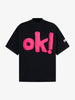 • Design Elements: Large, vibrant pink "OK!" text graphic, minimalist black base color