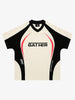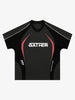 • Design Elements: Bold Red Curved Lines, Central Text Print, Side Text Details