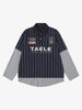 • Design Elements: Vertical stripes on the body, contrast horizontal striped sleeves, embroidered patches