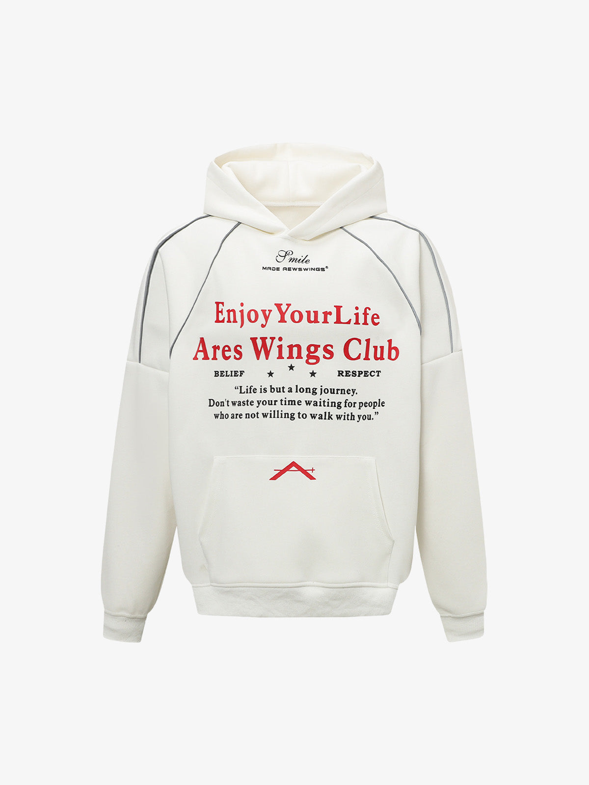 • Design Elements: Embroidered text design, contrasting side stripes, front pocket
