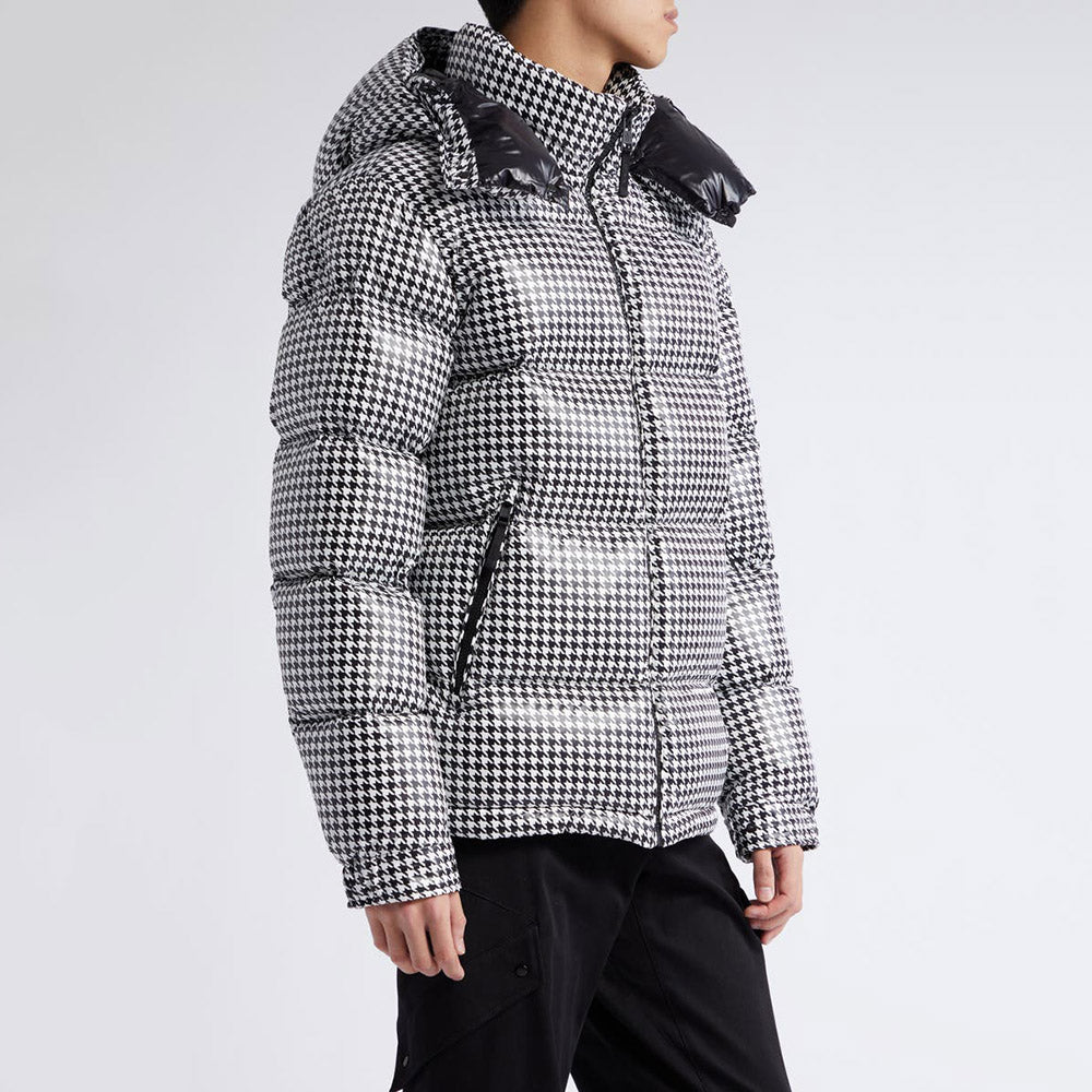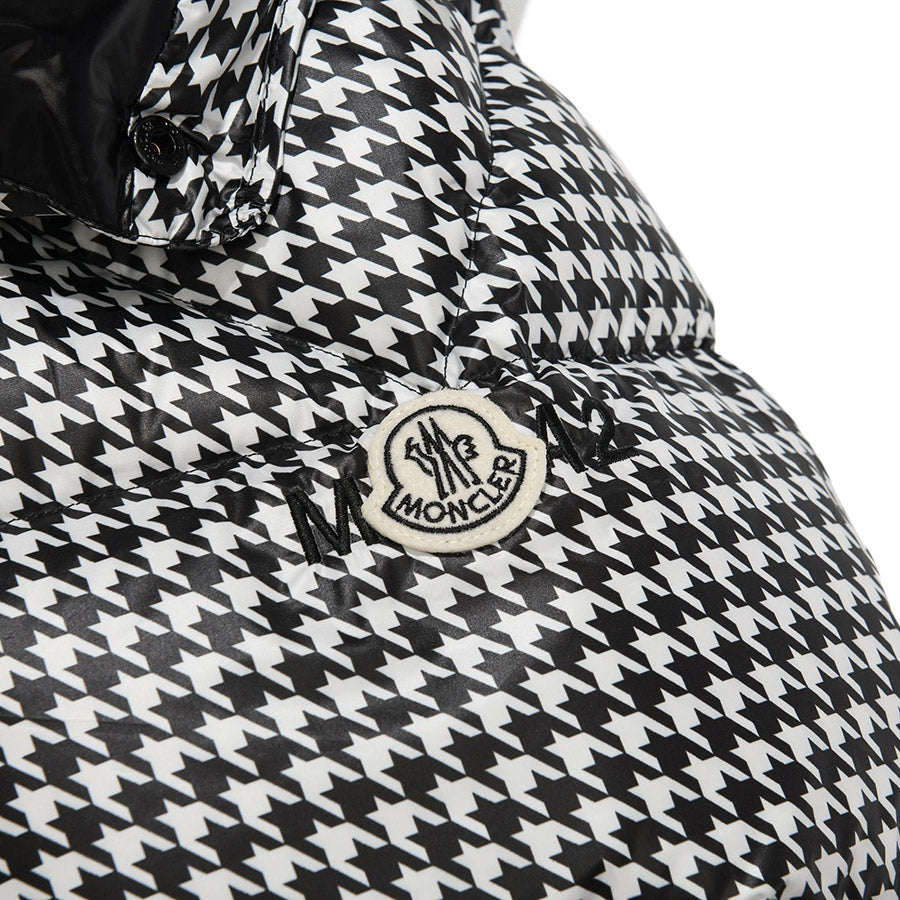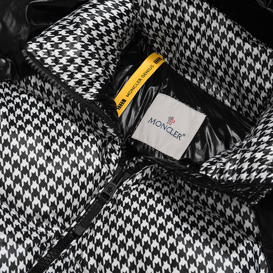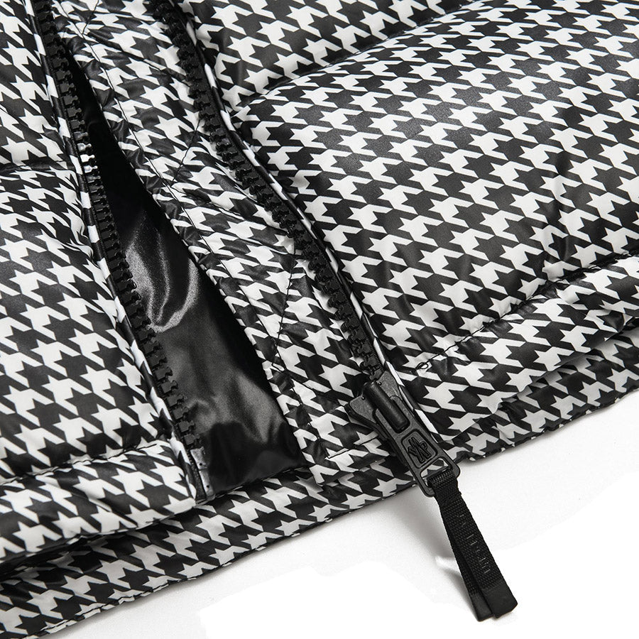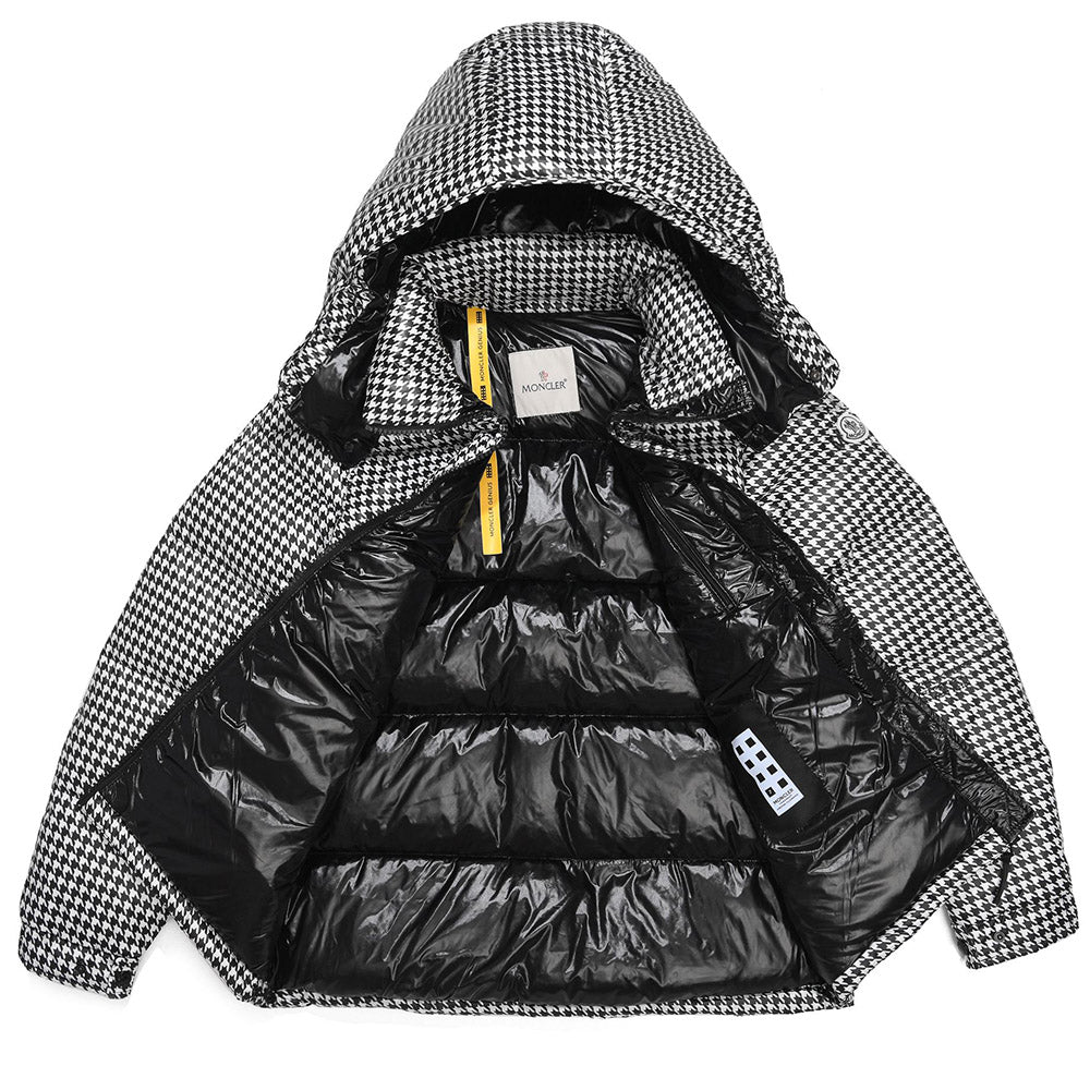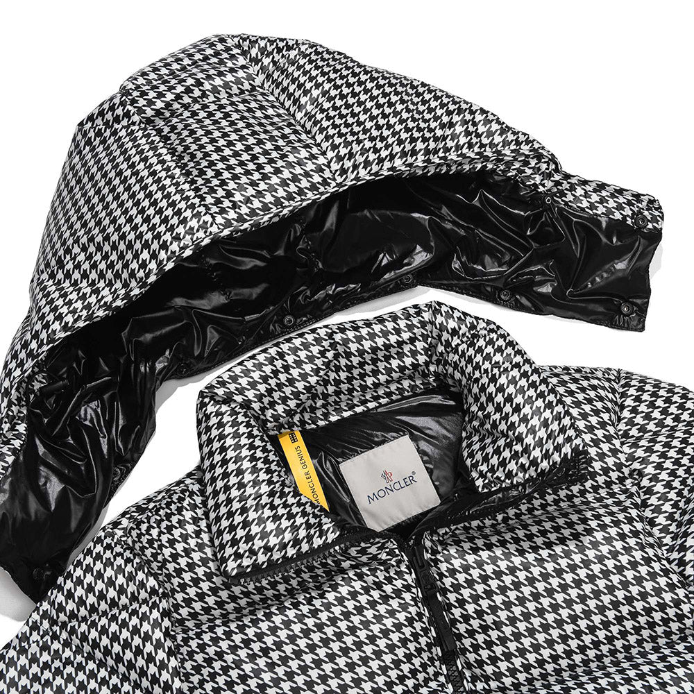 Short quilted jacket from the Moncler x FRGMT collection, part of the Moncler Genius project, made of houndstooth-patterned nylon. Padded with goose down, it features a stand collar with detachable hood, zip-up fastening, adjustable snap cuffs, two slanted zip pockets and one inside pocket. Signature felt logo appliqué on the left sleeve.