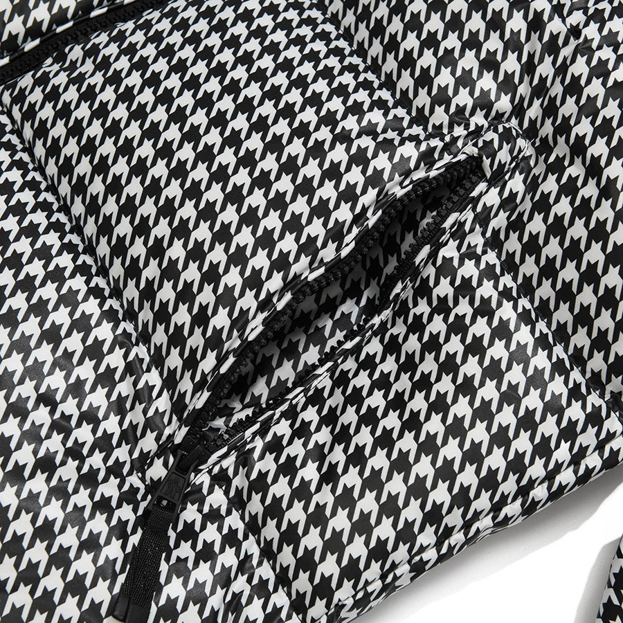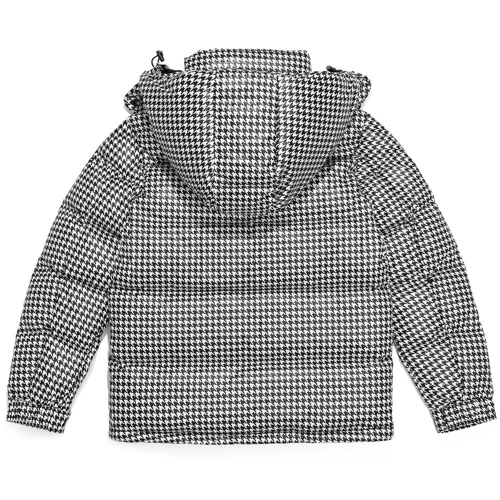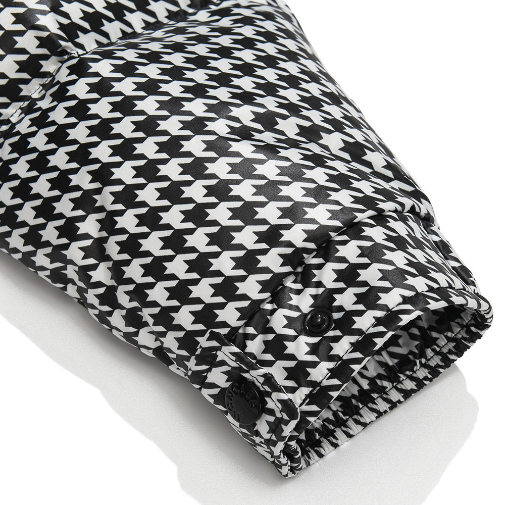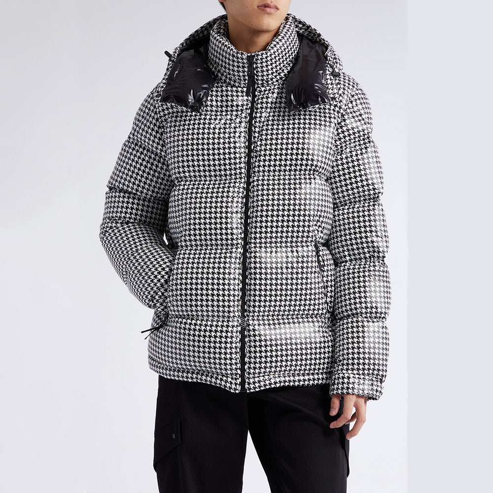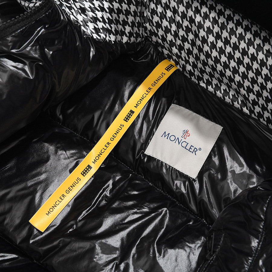 Short quilted jacket from the Moncler x FRGMT collection, part of the Moncler Genius project, made of houndstooth-patterned nylon. Padded with goose down, it features a stand collar with detachable hood, zip-up fastening, adjustable snap cuffs, two slanted zip pockets and one inside pocket. Signature felt logo appliqué on the left sleeve.
