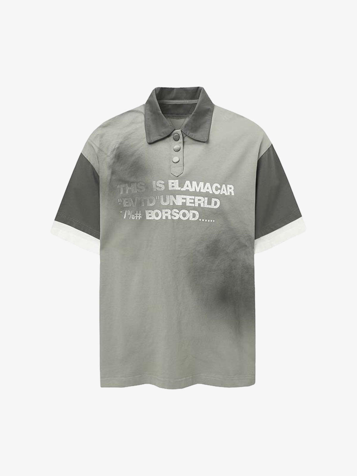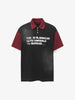• Design Elements: Contrasting sleeve and collar colors, bold text print on the front