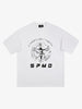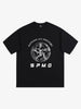 • Design Elements: Central graphic print featuring a wheel and figure, bold lettering below the graphic