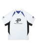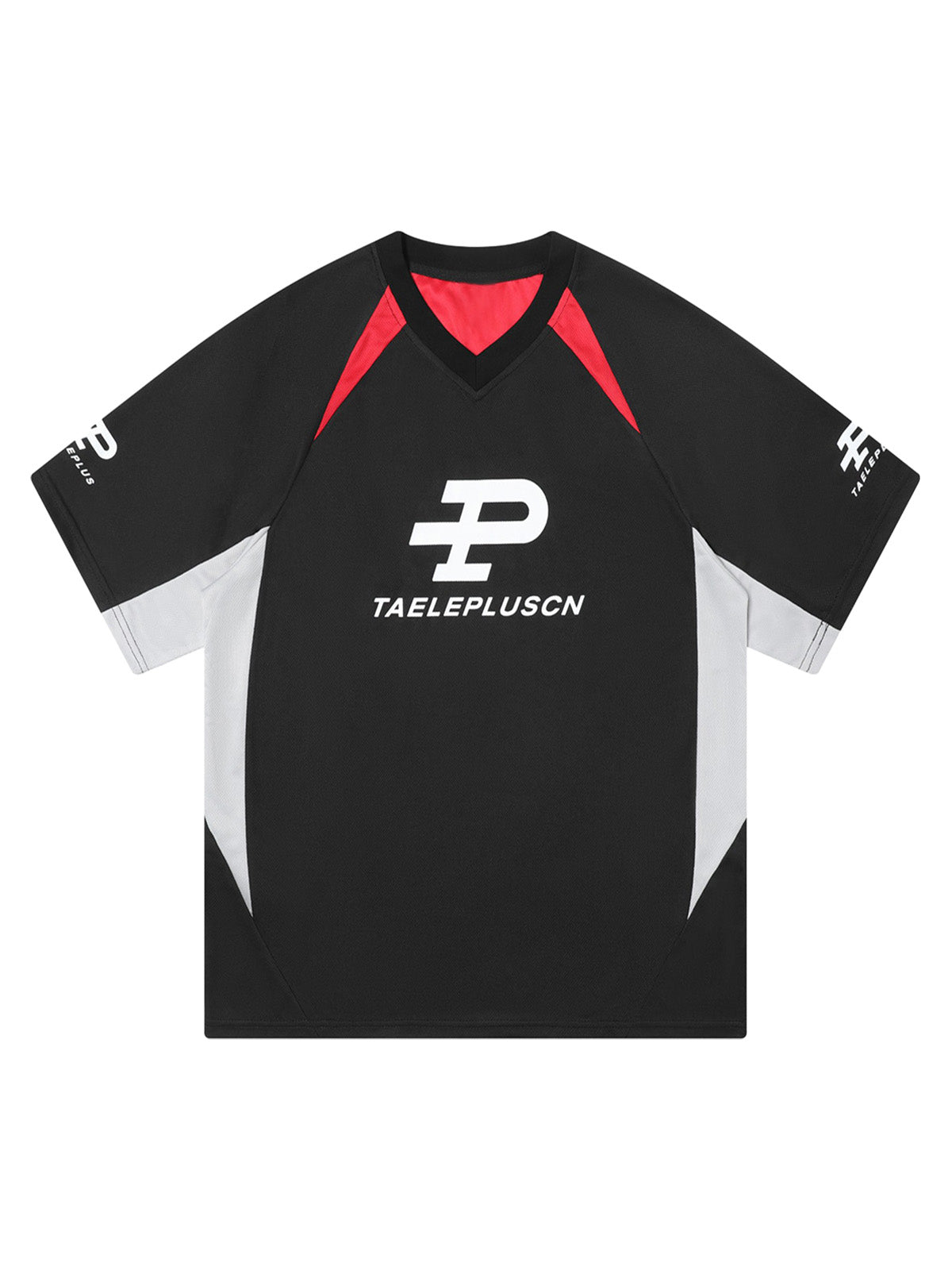 • Design Elements: Bold Logo Print, Contrasting Color Panels, Sleek V-Neck